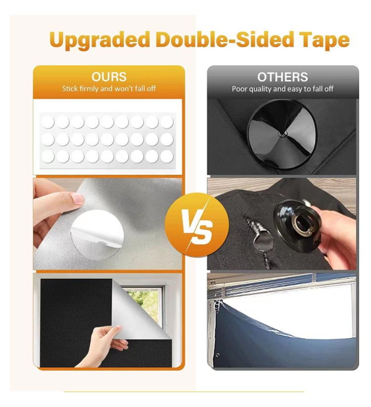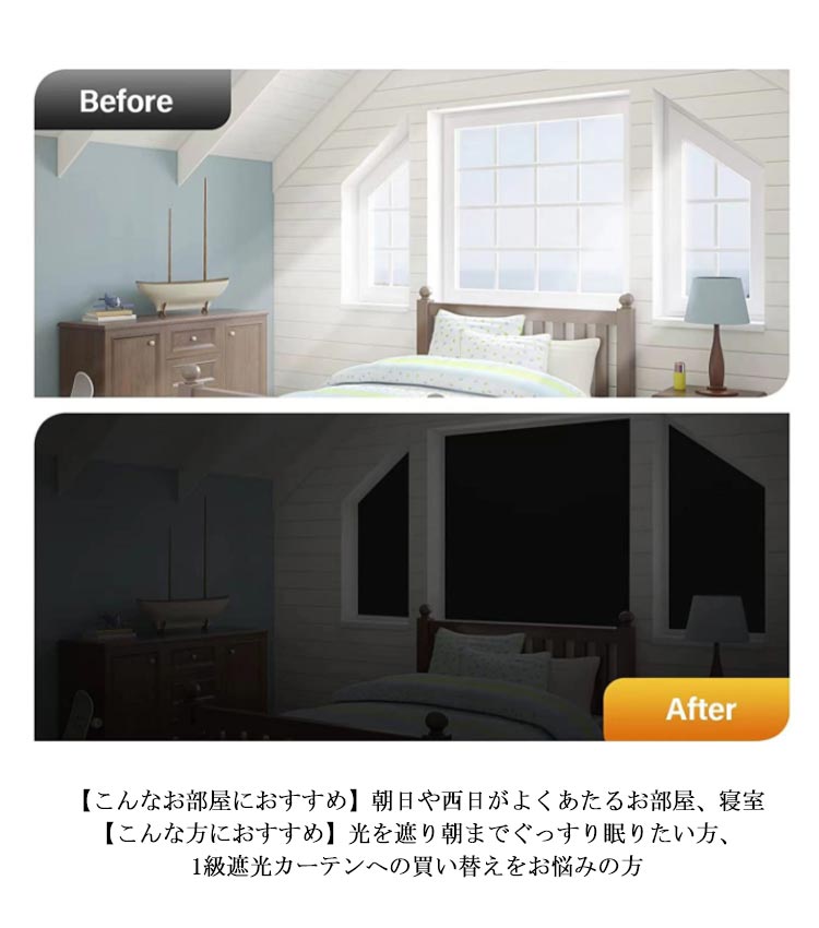 | ?少しの光も通さずしっかり遮光! ?快適な睡眠をとりたい方や、完全なプライバシーがほしい方向けの商品です。 ?マジックテープで窓に貼るだけの簡単設置。 ?使用シーンに応じて好みのサイズにカットできます。 ?強烈な日差しと熱を徹底ガード ?シルバーコーティング加工が施されているので紫外線から守ってくれます? ?日中は外からの目隠し効果としても。 ?遮光、遮熱効果で冷房効率がアップします。 ?【こんなお部屋におすすめ】朝日や西日がよくあたるお部屋、寝室 ?【こんな方におすすめ】光を遮り朝までぐっすり眠りたい方、1級遮光カーテンへの買い替えをお悩みの方 【取り付け方法】 1.窓のサイズを測る 2.窓のサイズに合わせて遮光シートをカットします(1cm程度を残します) 3.窓枠のサイズに合わせてマジックテープを貼ります。 4.窓枠に貼るマジックテープをきれいにし、10秒くらい押します。 | |