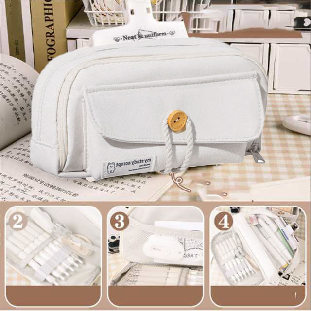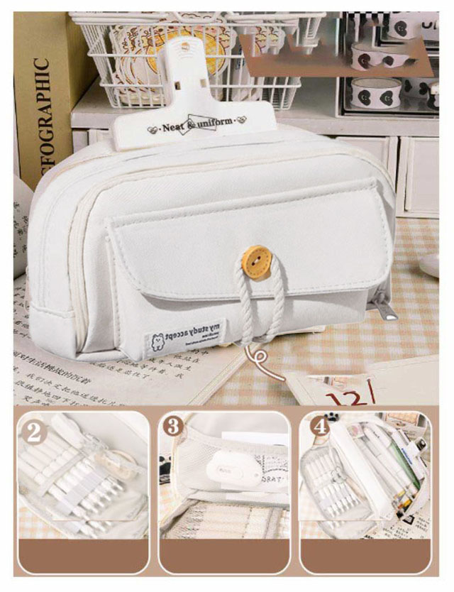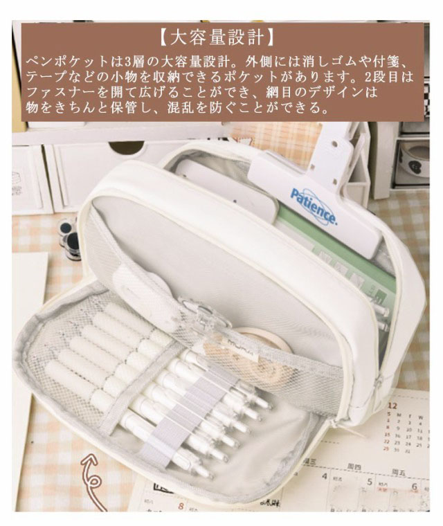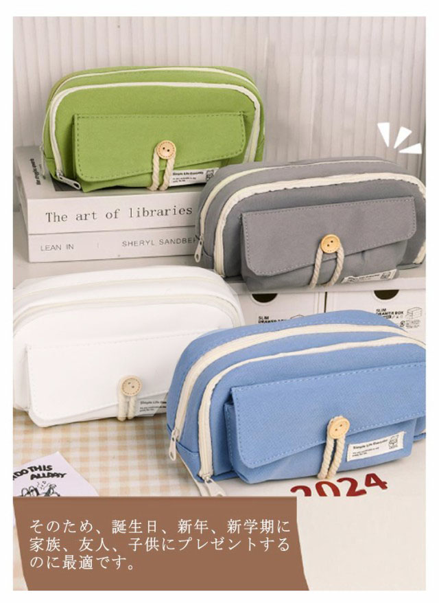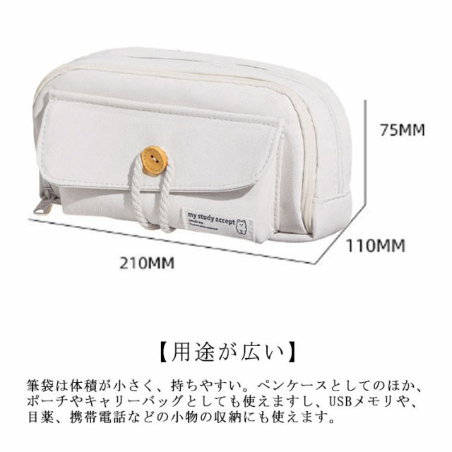 【大容量設計】ペンポケットは3層の大容量設計。外側には消しゴムや付箋、テープなどの小物を収納できるポケットがあります。2段目はファスナーを開けて広げることができ、網目のデザインは物をきちんと保管し、混乱を防ぐことができる。【使い勝手】メインファスナーは大きく開くので、必要なものを上手に取り出すことができ、ファスナーには取っ手が付いているので開閉しやすい。外側ボタンのデザインは、使い勝手が良く、飾りとしてもかわいいです。【用途が広い】筆袋は体積が小さく、持ちやすい。ペンケースとしてのほか、ポーチやキャリーバッグとしても使えますし、USBメモリや、目薬、携帯電話などの小物の収納にも使えます。【プレゼントに】スタイリッシュでシンプルなデザインで、大学生、高校生、中学生、小学生、社会人向けのペンケースです。そのため、誕生日、新年、新学期に家族、友人、子供にプレゼントするのに最適です。