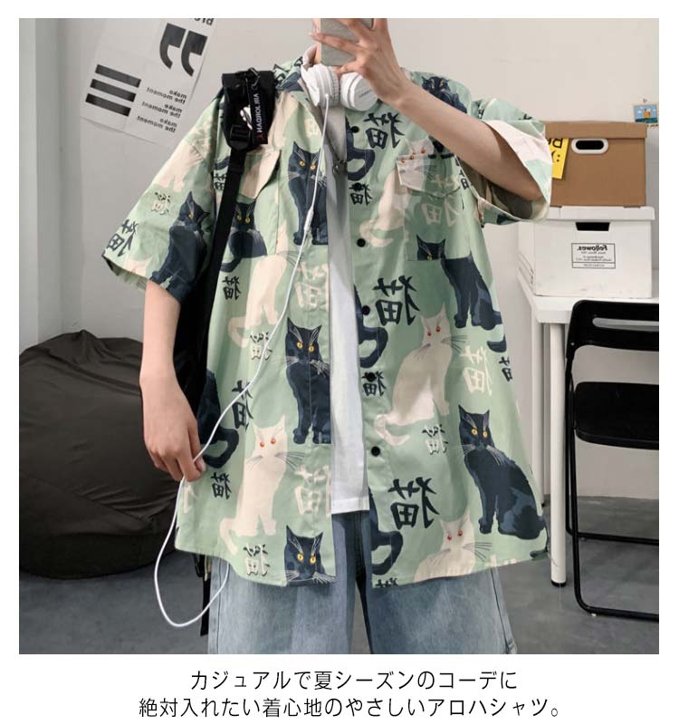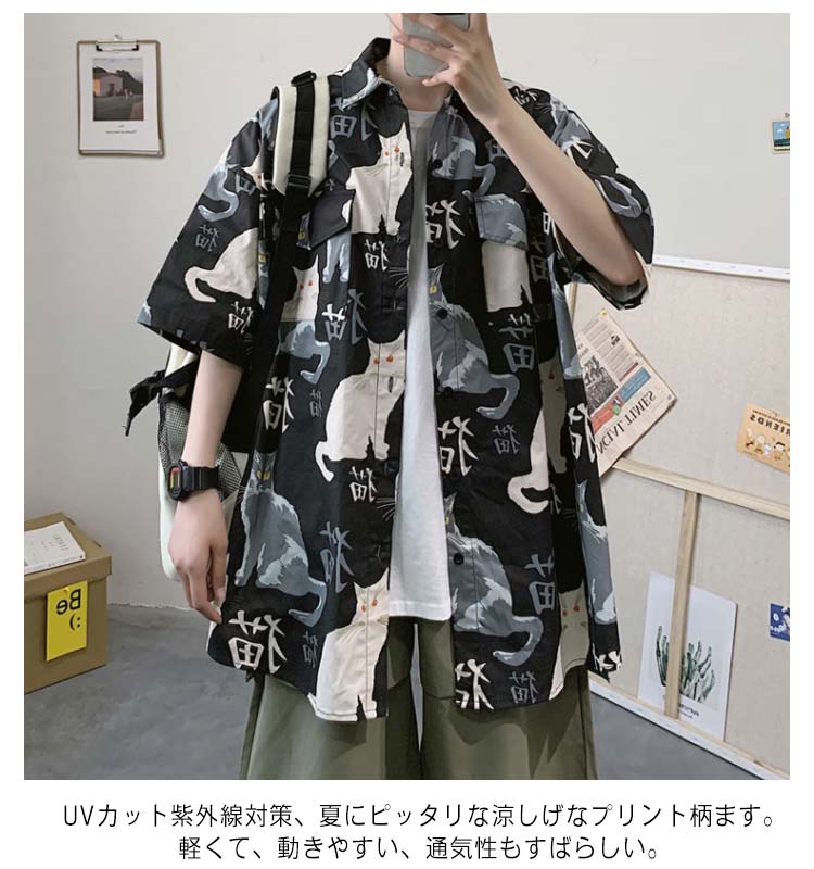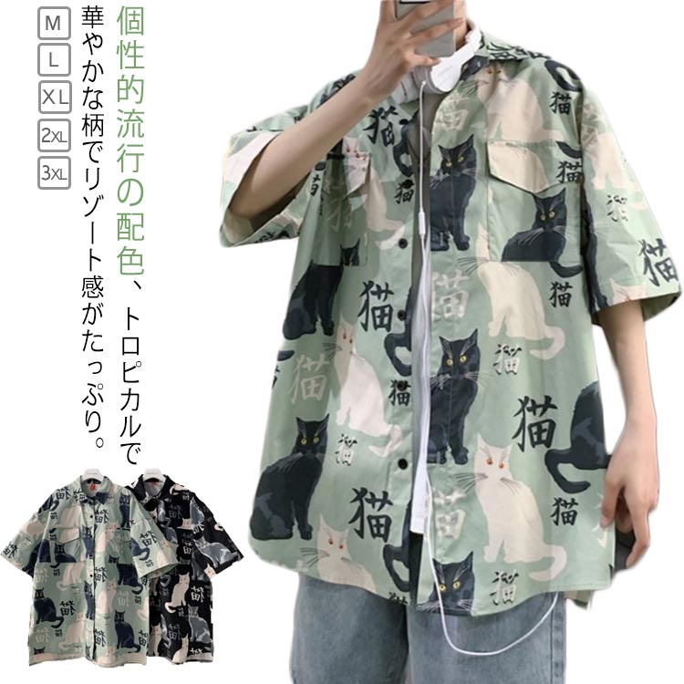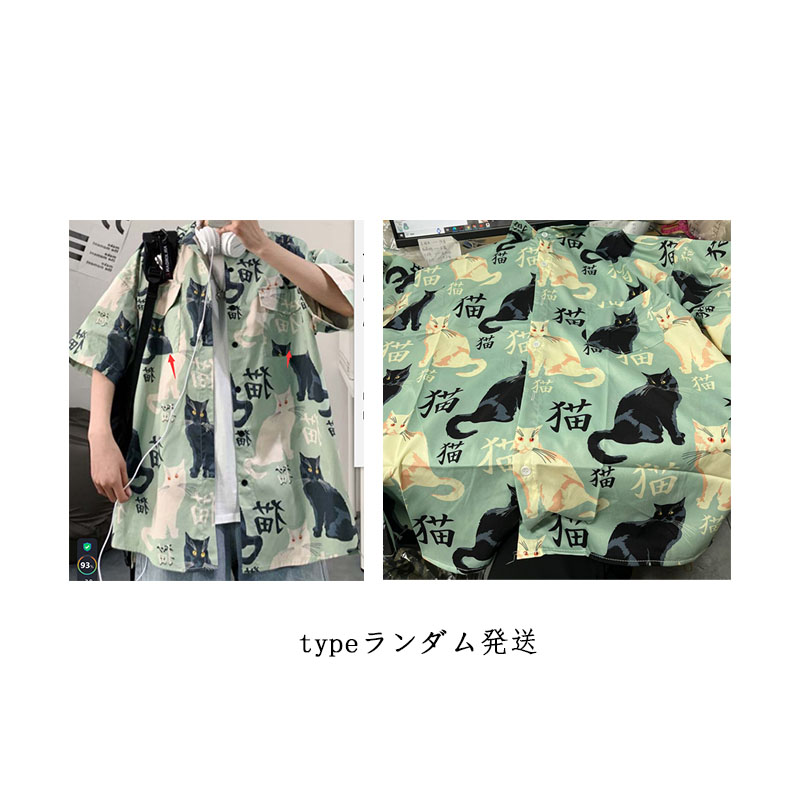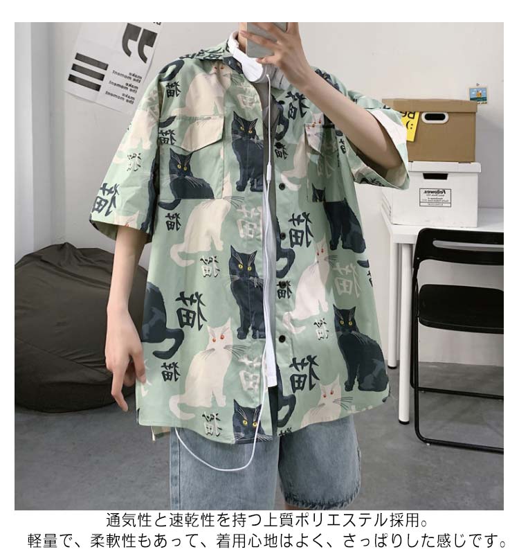 半袖シャツ トップス 薄手 ねこ 羽織り おしゃれ メンズ プリント 猫柄 アロハシャツ プリント 可愛い おもしろ 夏 ねこ ビーチ カジュアル 通気 速乾 アウター