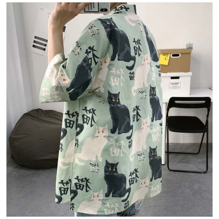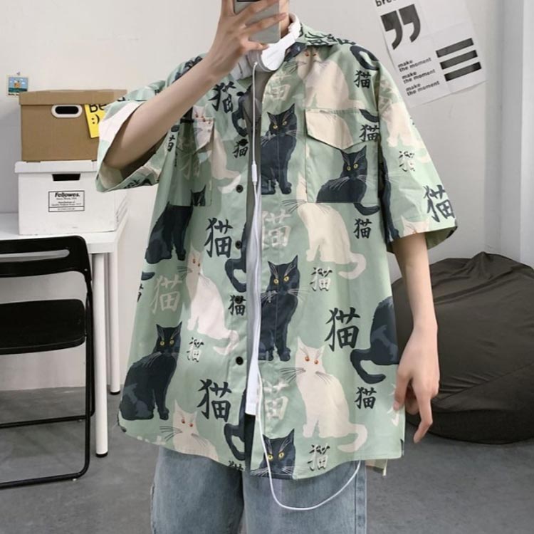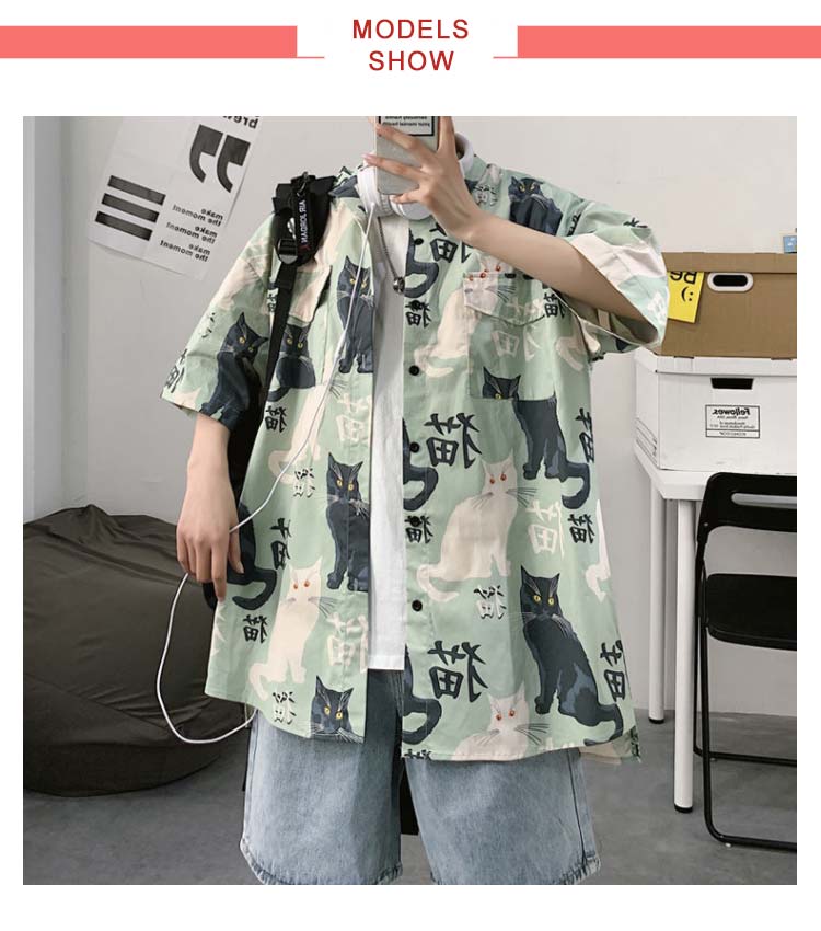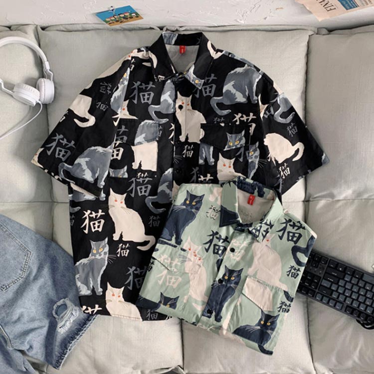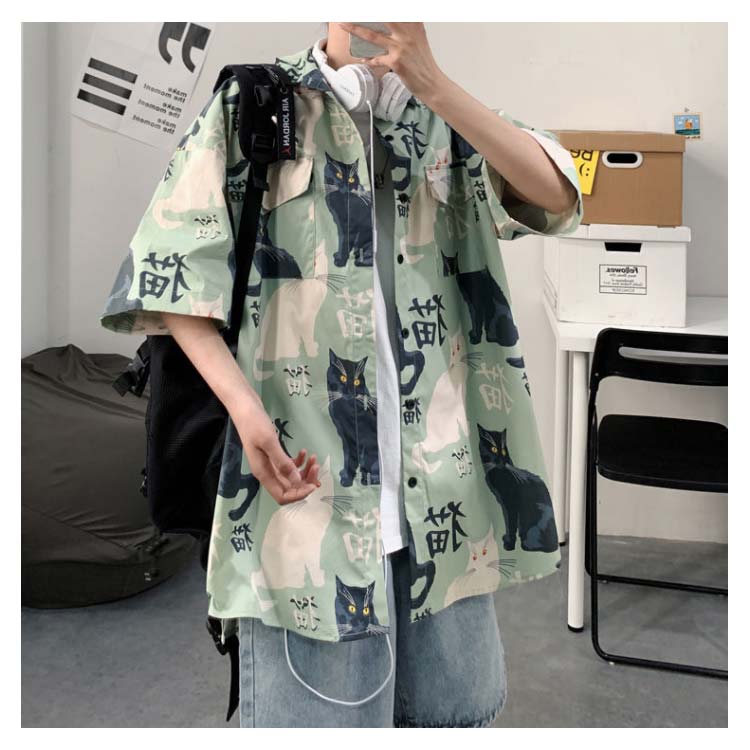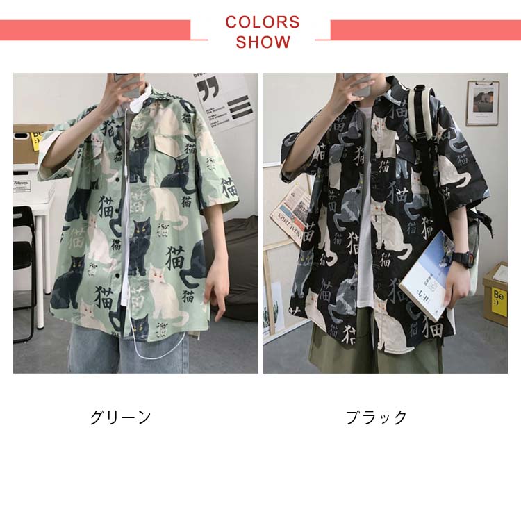半袖シャツ トップス 薄手 ねこ 羽織り おしゃれ メンズ プリント 猫柄 アロハシャツ プリント 可愛い おもしろ 夏 ねこ ビーチ カジュアル 通気 速乾 アウター