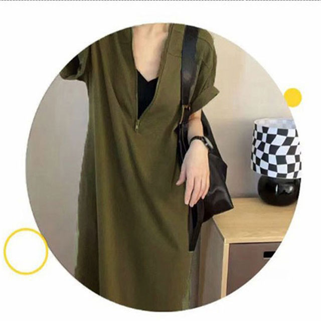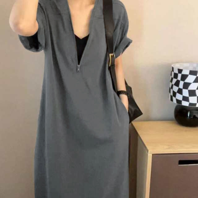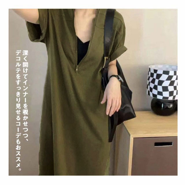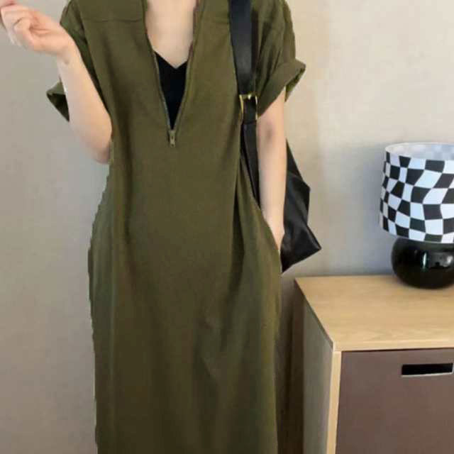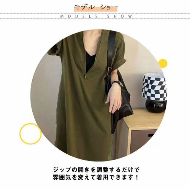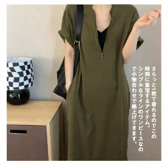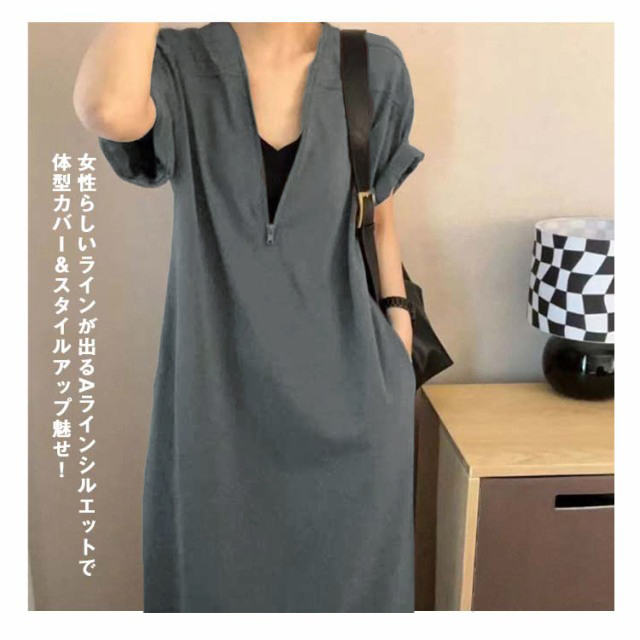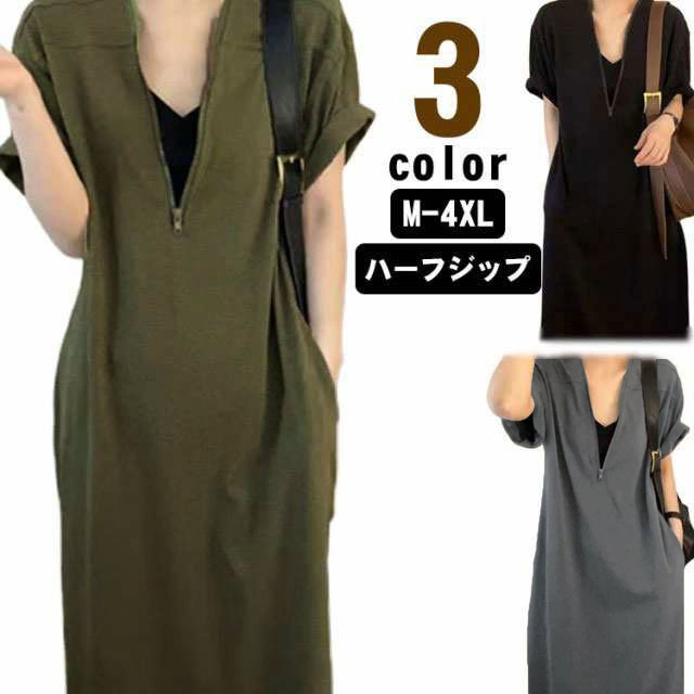 【全3色】【ハーフジップ】【M-4XL】ジップの開きを調整するだけで雰囲気を変えて着用できます!深く開けてインナーを覗かせつつ、デコルテをすっきり見せるコーデもおススメ。キレイめにもカジュアルにもマッチするので、合わせる小物次第でオンオフに楽しめるアイテムです!女性らしいラインが出るAラインシルエットで体型カバー&スタイルアップ魅せ!さらっと1枚で着れるのでこの時期に重宝するアイテム。シンプルなラインのワンピースなので小物合わせで格上げできます。