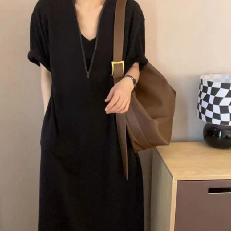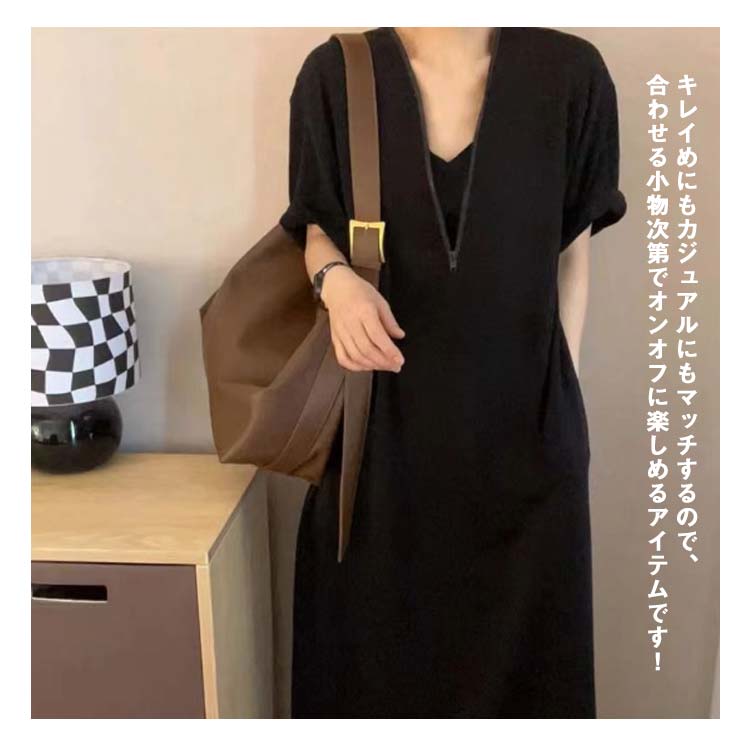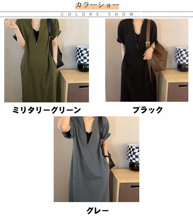 ワンピース レディース ハーフジップ 半袖 ワンピ ロング 大きいサイズ 夏 フレンチ袖 ゆったり 体型カバー マキシ丈 ロングワンピース 夏服 ロング丈 シンプル Vネック 着痩せ 通勤 黒 上品 綿 大人カジュアル 旅行 おしゃれ 送料無料