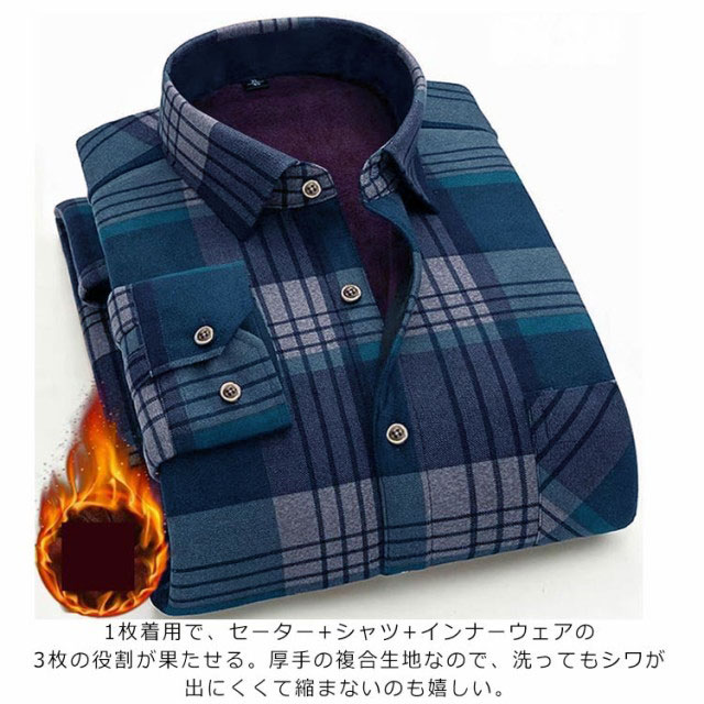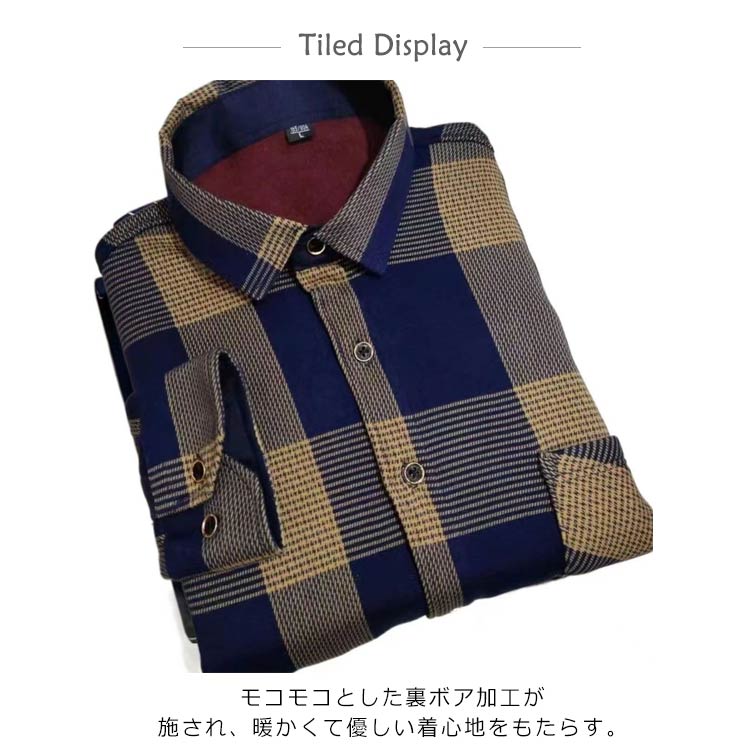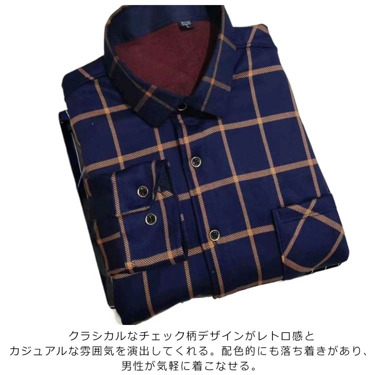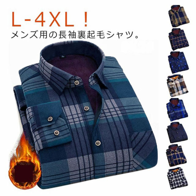 L-4XL!メンズ用の長袖裏起毛シャツ。モコモコとした裏ボア加工が施され、暖かくて優しい着心地をもたらす。1枚着用で、セーター+シャツ+インナーウェアの3枚の役割が果たせる。厚手の複合生地なので、洗ってもシワが出にくくて縮まないのも嬉しい。クラシカルなチェック柄デザインがレトロ感とカジュアルな雰囲気を演出してくれる。配色的にも落ち着きがあり、男性が気軽に着こなせる。メインとしても、コートやジャケットなどと重ね着してもよろしい。幅広い場合で着こなせて、秋冬ファッションに必ず大活躍のアイテム!