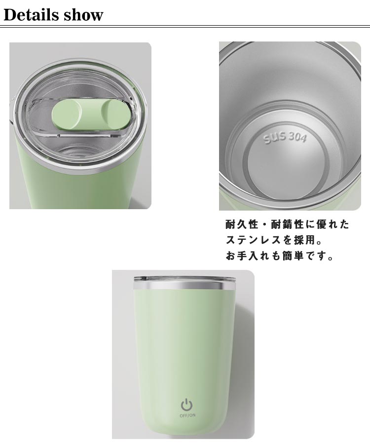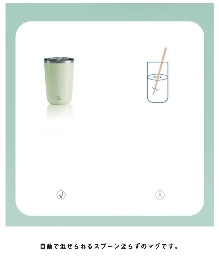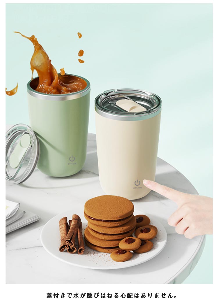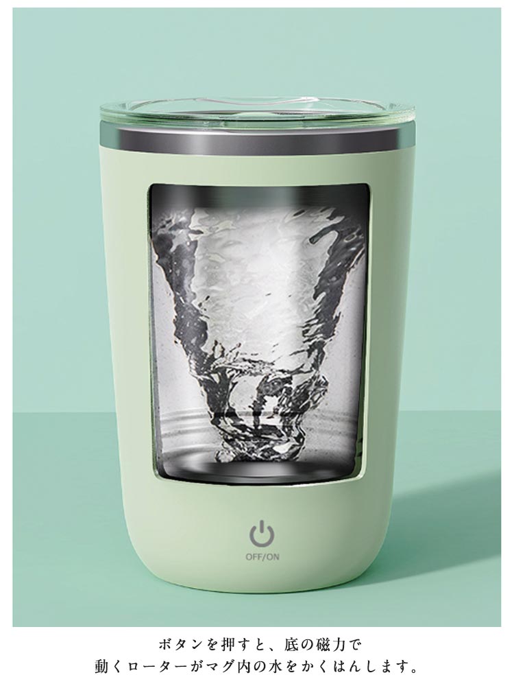 | 充電式自動攪拌マグカップ。自動で混ぜられるマグカップ。 ボタンを押すと、底の磁力で動くローターがマグ内の水をかくはんします。自動で混ぜられるスプーン要らずのマグです。 コーヒーや紅茶、粉ミルク、青汁など、様々なドリンクをかき混ぜ可能。 蓋付きで水が跳びはねる心配はありません。 USBケーブルで充電しておけば、電源を気にせず使用可能。 耐久性?耐錆性に優れたステンレスを採用。お手入れも簡単です。 | |