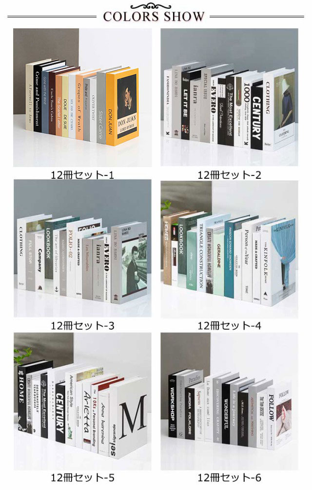 | 【12冊セット 6色選べる!】 【インテリアにかかせない洋書】 インテリアや置き画などに人気のディスプレイブックです。 整然と並べられていたり、開かれたり置いたり、重ねていたり、乱雑に置かれていたりと、 そこにあるだけでインテリアになります。 撮影小物としても必須です。 | |