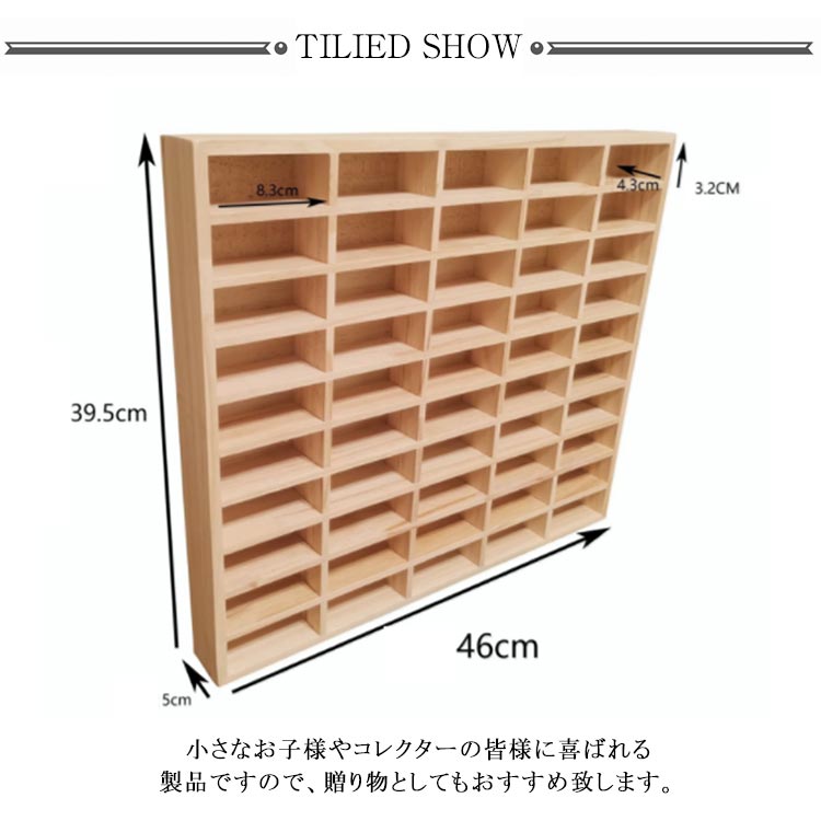 | ?最大で50台のミニカーを収納できる、木製のコレクションケースです。 ?扉なしタイプ ?木のもつ温かみは、お部屋の雰囲気にもぬくもりを与えてくれます。 ?小さなお子様やコレクターの皆様に喜ばれる製品ですので、贈り物としてもおすすめ致します。 | |