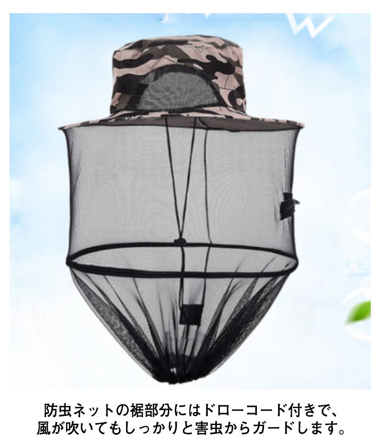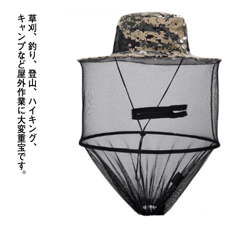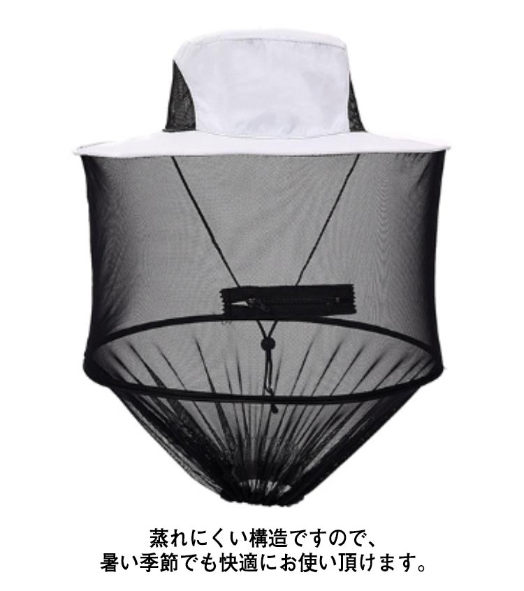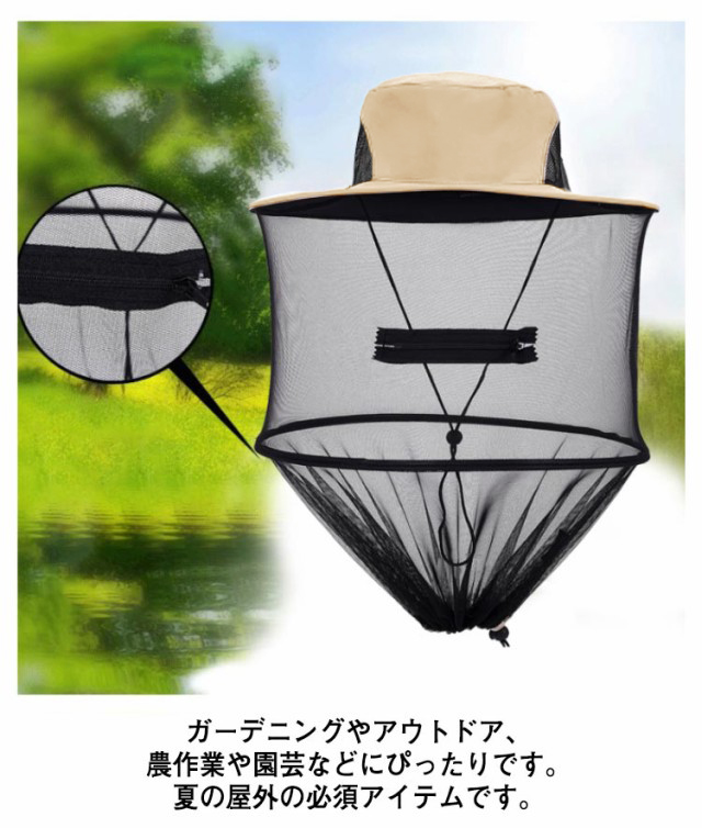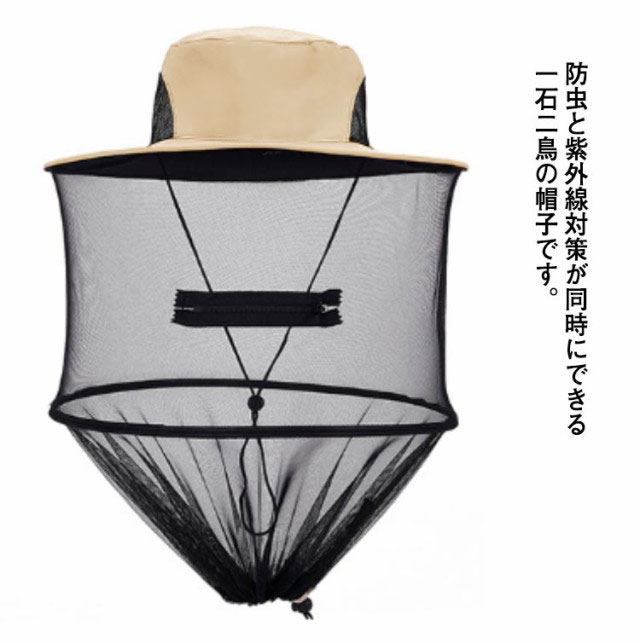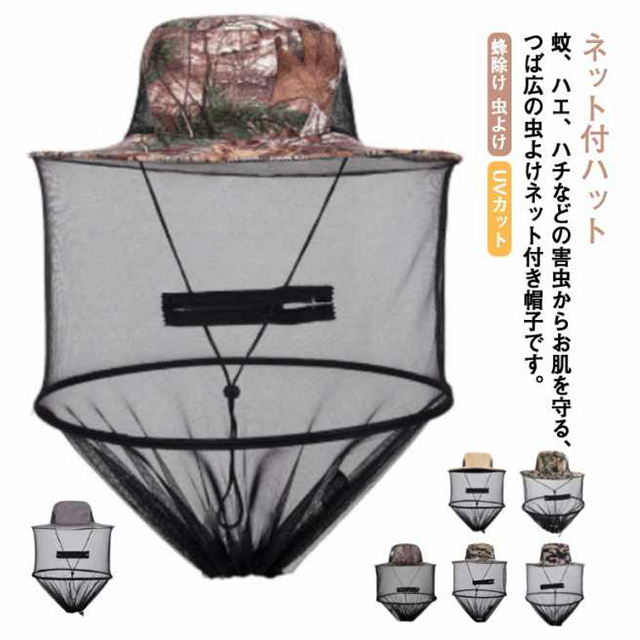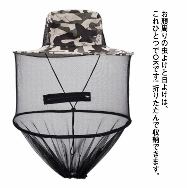 【蜂除け】【虫よけ】【UVカット】【ネット付ハット】蚊、ハエ、ハチなどの害虫からお肌を守る、つば広の虫よけネット付き帽子です。防虫ネットの裾部分にはドローコード付きで、風が吹いてもしっかりと害虫からガードします。ガーデニングやアウトドア、農作業や園芸などにぴったりです。夏の屋外の必須アイテムです。メッシュ素材を採用しておりますので、通気性もバッチリで速乾性もございます。蒸れにくい構造ですので、暑い季節でも快適にお使い頂けます。防虫と紫外線対策が同時にできる一石二鳥の帽子です。草刈、釣り、登山、ハイキング、キャンプなど屋外作業に大変重宝です。お顔周りの虫よけと日よけは、これひとつでOKです! 折りたたんで収納できます。