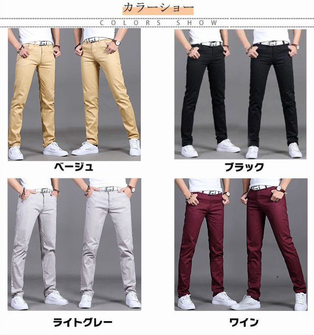 | 【9サイズ】【8colors】 ビジネスにもカジュアルにもキレイ目にも対応できるチノパンツ。 細すぎない程度の細身スリムシルエットです。 しっかりとした生地は、汚れも落ちやすく、破れにくい、型崩れもしにくいという使いやすさも持ち合わせ、その着心地をひしひしと実感できます。 身体のラインに合わせてフィットするから見ためはスッキリ! 普段使いからゴルフ、ビジネスまでオススメのチノパンツです。 | |