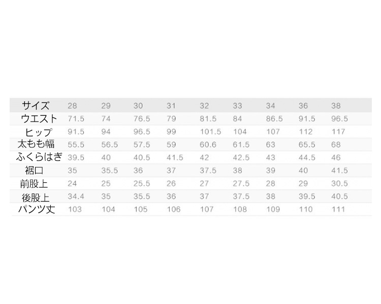 | サイズ | 28 29 30 31 32 33 34 36 38 |