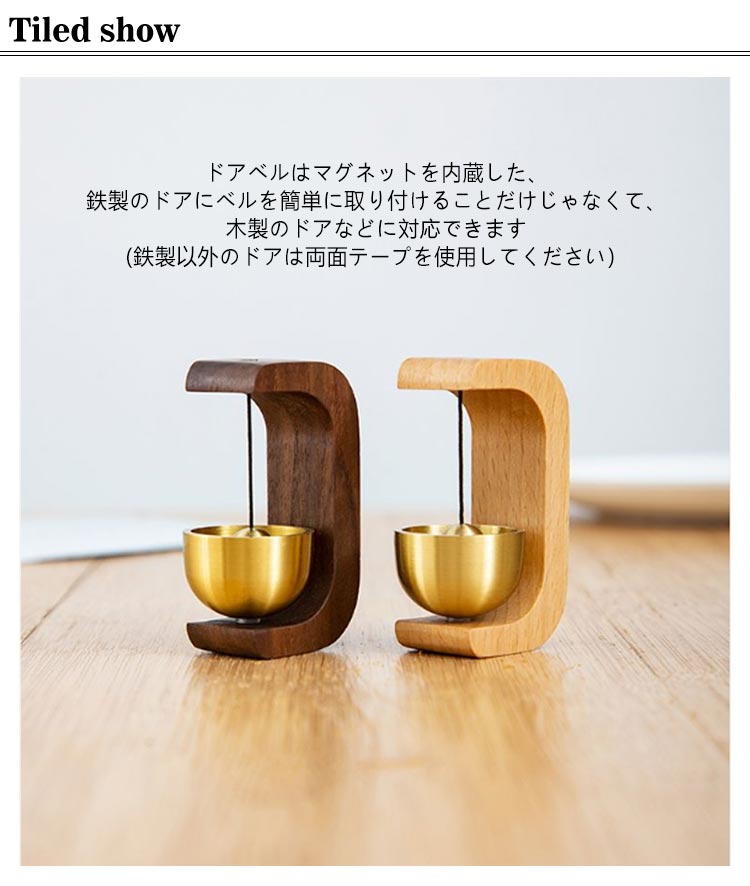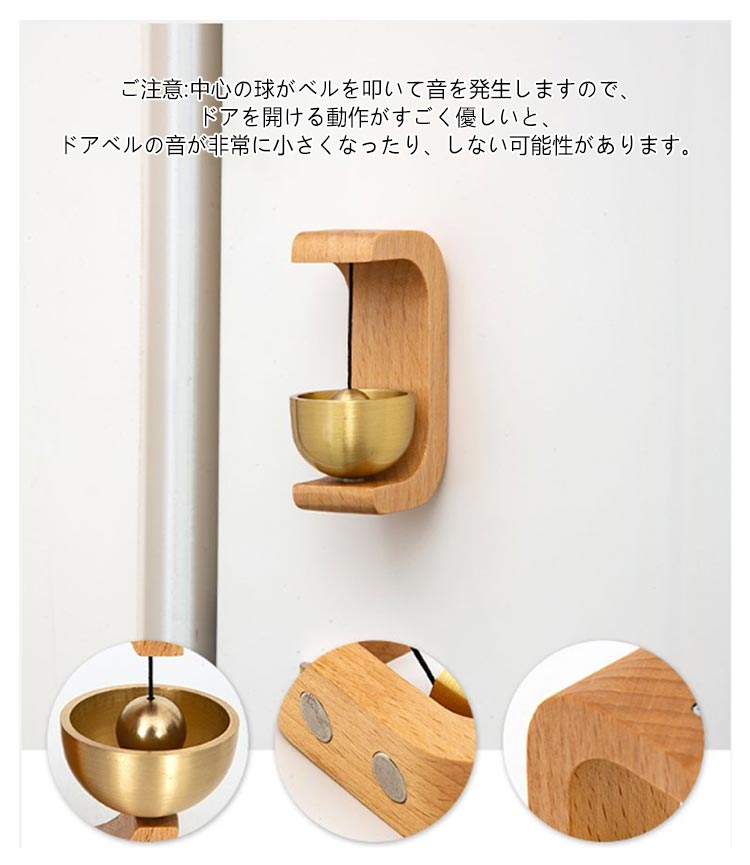 【天然原木製】【優しい音の鈴】【マグネット式】ドアベルはマグネットを内蔵した、鉄製のドアにベルを簡単に取り付けることだけじゃなくて、木製のドアなどに対応できます(鉄製以外のドアは両面テープを使用してください)ベルは黄銅製で、扉が開くたびに、美しい音でお知らせます。澄んだ綺麗な音で、長く鳴いて、良い音は人の心をおだやかな気持ちにさせます。天然原木製で製造したドアチャイムは、シンプルなスタイルがどんなインテリアにもよく似合います。ご注意:中心の球がベルを叩いて音を発生しますので、ドアを開ける動作がすごく優しいと、ドアベルの音が非常に小さくなったり、しない可能性があります。
