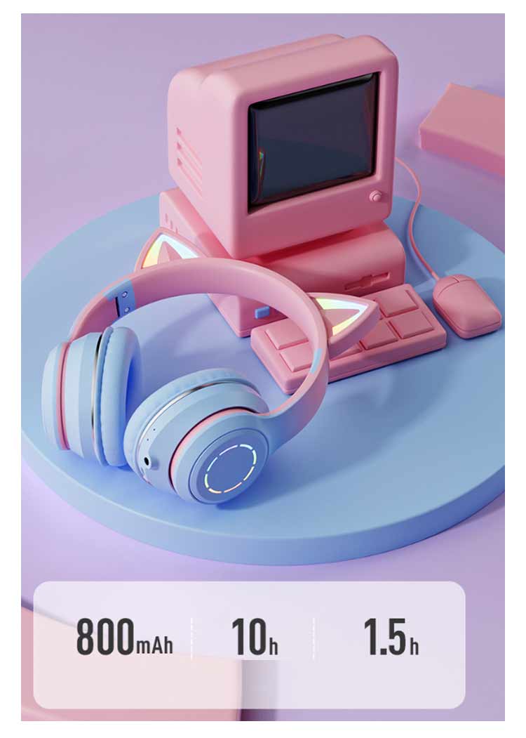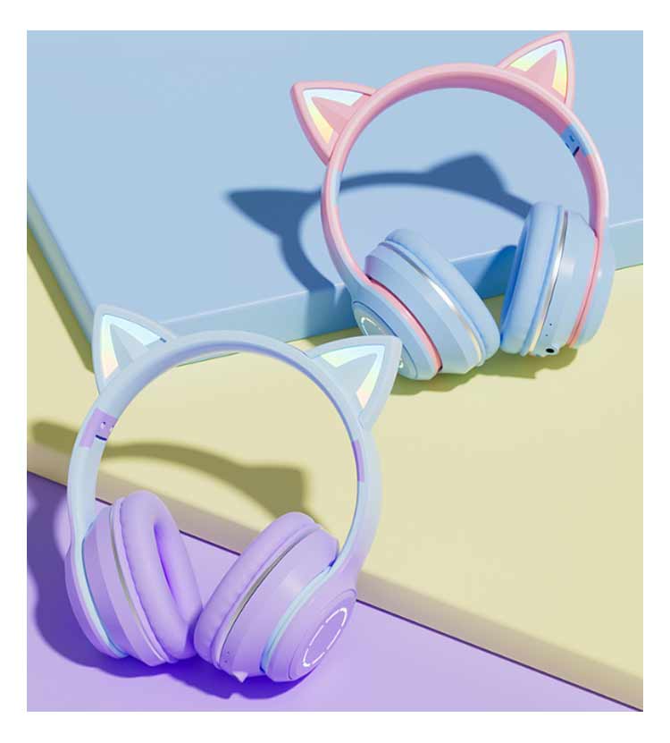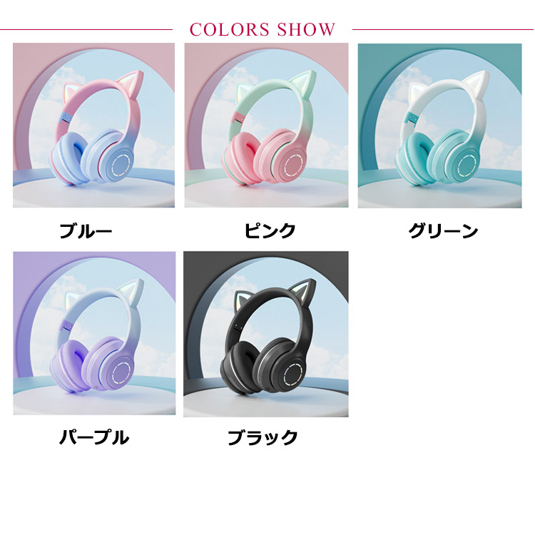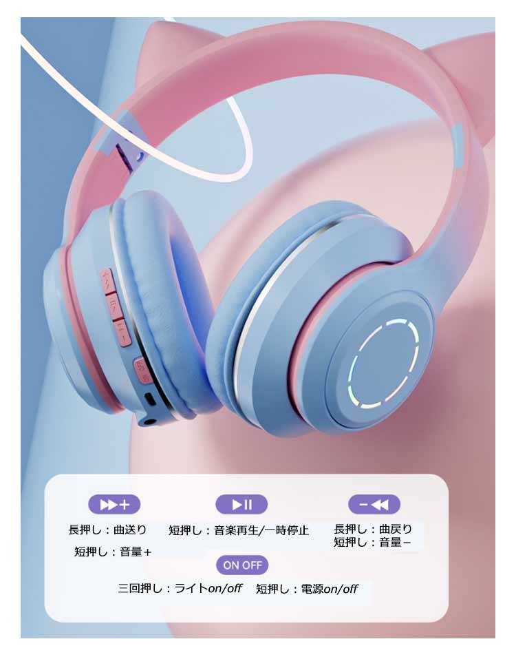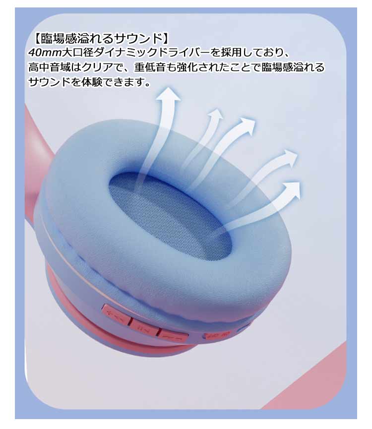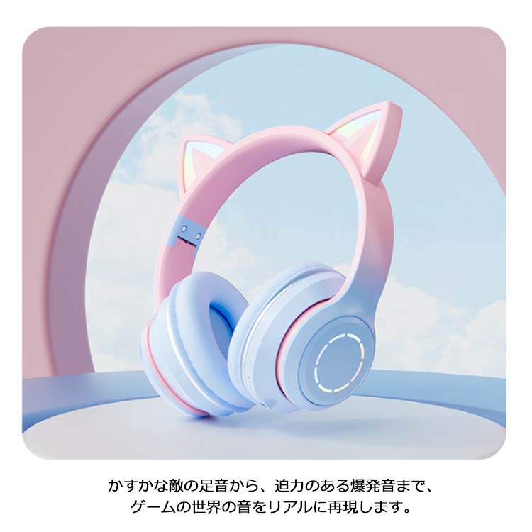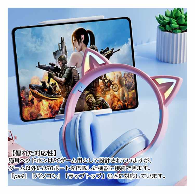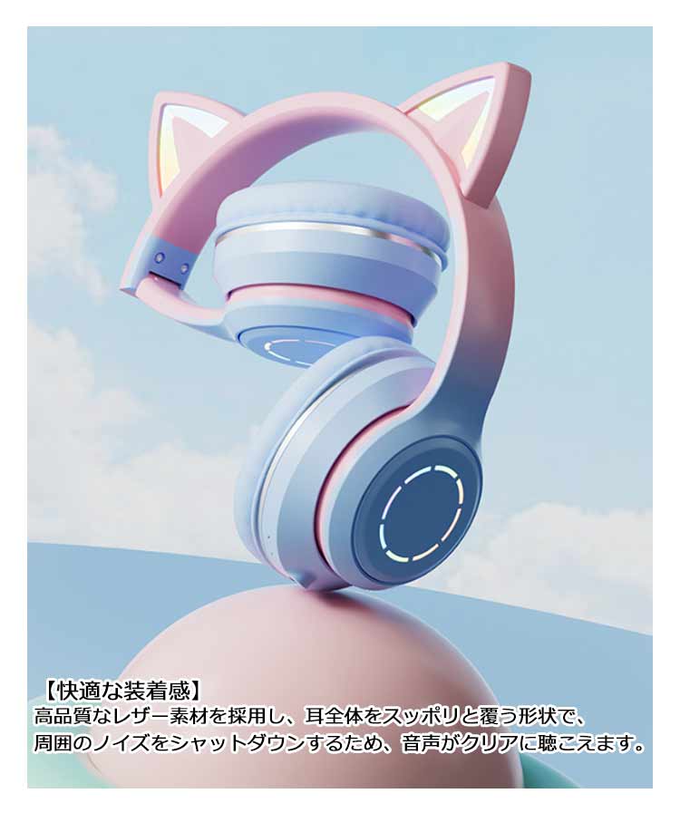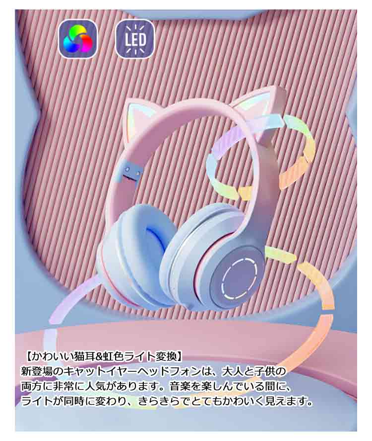 【ワイヤレスヘッドホン】【折りたたみ式】【有線無線兼用】【かわいい猫耳*虹色ライト変換】新登場のキャットイヤーヘッドフォンは、大人と子供の両方に非常に人気があります。音楽を楽しんでいる間に、ライトが同時に変わり、きらきらでとてもかわいく見えます。【快適な装着感】高品質なレザー素材を採用し、耳全体をスッポリと覆う形状で、周囲のノイズをシャットダウンするため、音声がクリアに聴こえます。【折りたたみ可能、携帯便利】折りたたみ式で、持ち運ぶことがすごく便利になって、外出に最適です。【臨場感溢れるサウンド】40mm大口径ダイナミックドライバーを採用しており、高中音域はクリアで、重低音も強化されたことで臨場感溢れるサウンドを体験できます。かすかな敵の足音から、迫力のある爆発音まで、ゲームの世界の音をリアルに再現します。【優れた対応性】猫耳ヘッドホンはPCゲーム用として設計されていますが、ゲーム以外にUSBポートを搭載した機器に接続できます。「ps4」「パソコン」「ラップトップ」などに対応しています。【無線*有線両用】3.5mmオーディオケーブルジャック付き、万が一電量が切れた後に3.5mmケーブルを通じてスマホと接続してケーブルヘッドホンに変身させ、引き続き利用可能です。