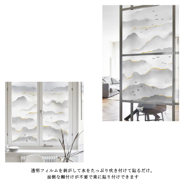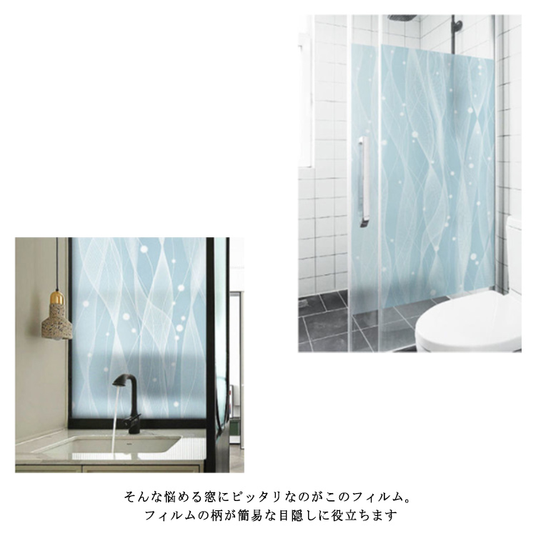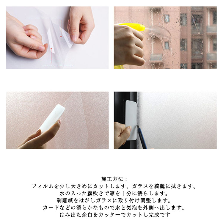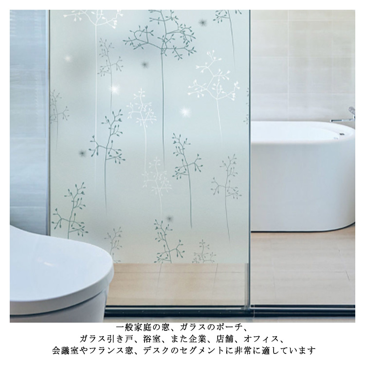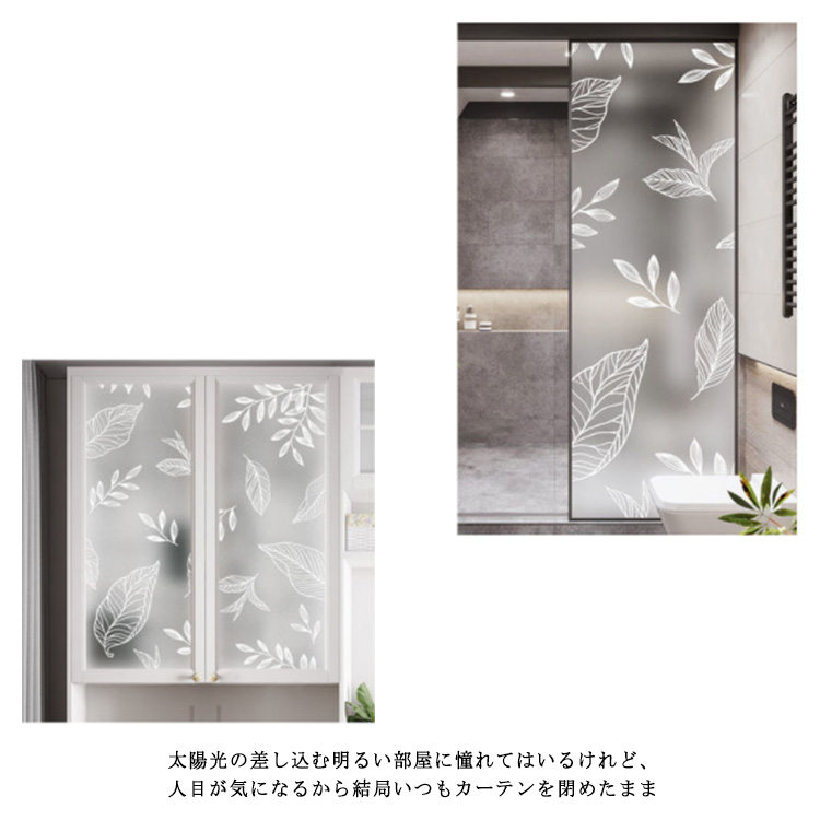 | 全17種類!インテリア風の窓ガラスフィルム!窓ガラスにだけではなく、食器棚やガラス製のテーブルなどにも使えて、お部屋の模様替えの時に大活躍できます! 透明フィルムを剥がして水をたっぷり吹き付けて貼るだけ。面倒な糊付けが不要で楽に貼り付けできます。 太陽光の差し込む明るい部屋に憧れてはいるけれど、人目が気になるから結局いつもカーテンを閉めたまま。 そんな悩める窓にピッタリなのがこのフィルム。フィルムの柄が簡易な目隠しに役立ちます。 突風などによる飛来物、衝撃などで壊されたガラス片の飛散防止に役立ちます。 お部屋の雰囲気にあわせてインテリアとのコーデイネートが楽しめます。 一般家庭の窓、ガラスのポーチ、ガラス引き戸、浴室、また企業、店舗、オフィス、会議室やフランス窓、デスクのセグメントに非常に適しています。 | |