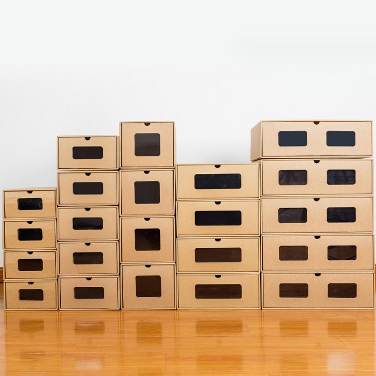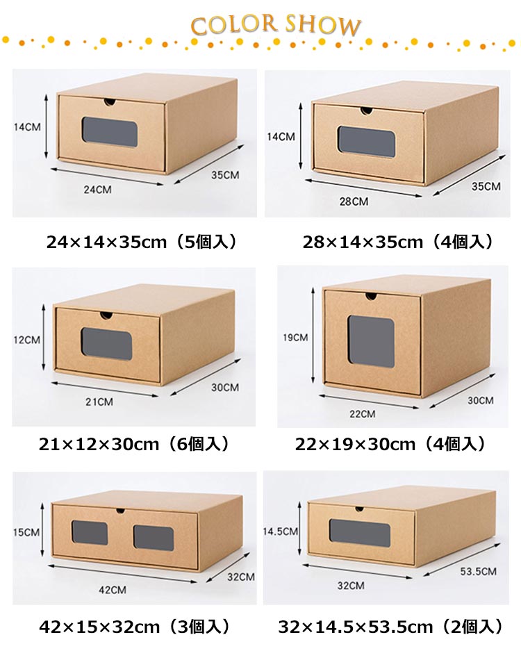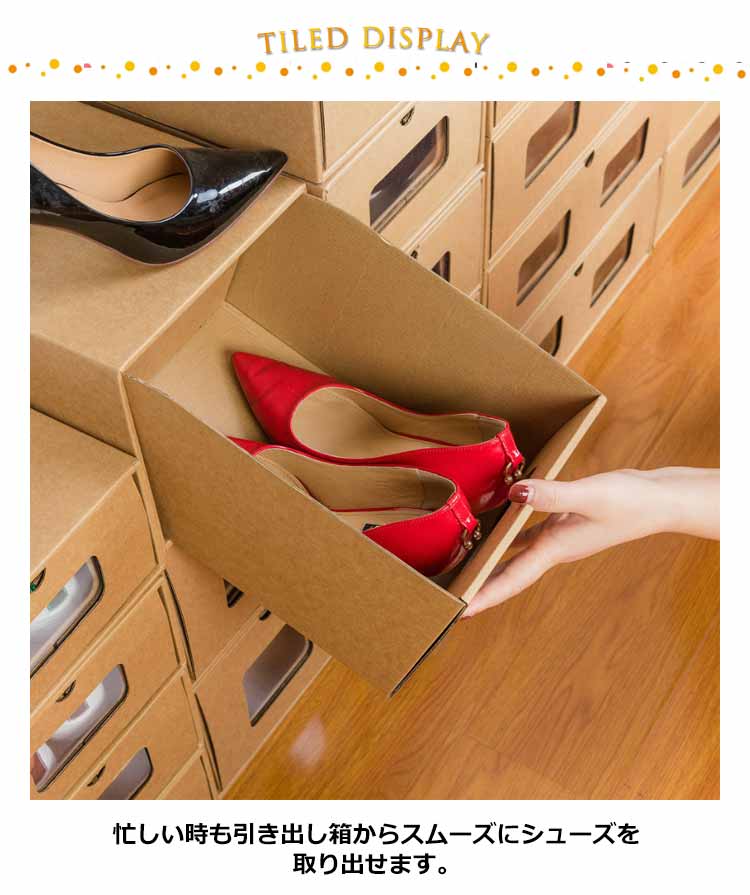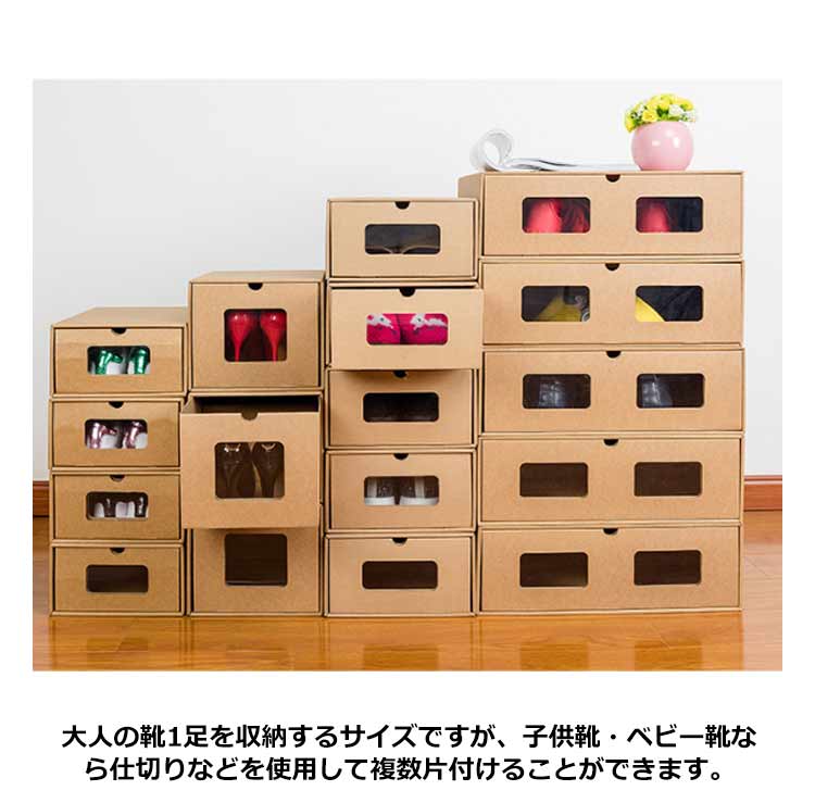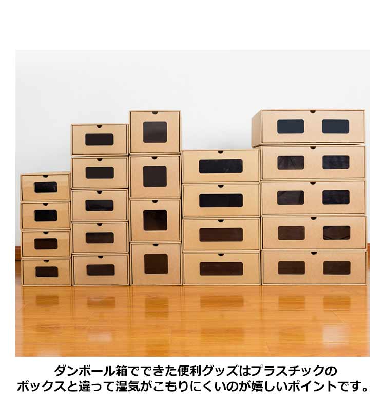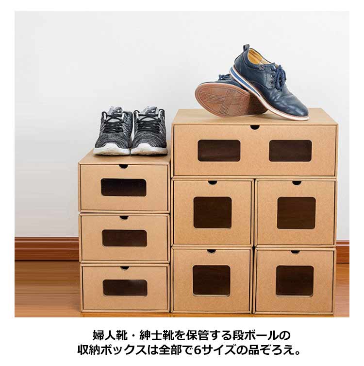 | 窓付きで中身がわかりやすいシューズボックス。 6個入 6サイズ ダンボール箱でできた便利グッズはプラスチックのボックスと違って湿気がこもりにくいのが嬉しいポイントです。 取っ手になる穴があいた引き出し収納箱はとても便利。 忙しい時も引き出し箱からスムーズにシューズを取り出せます。 婦人靴?紳士靴を保管する段ボールの収納ボックスは全部で6サイズの品ぞろえ。 大人の靴1足を収納するサイズですが、子供靴?ベビー靴なら仕切りなどを使用して複数片付けることができます。 | |