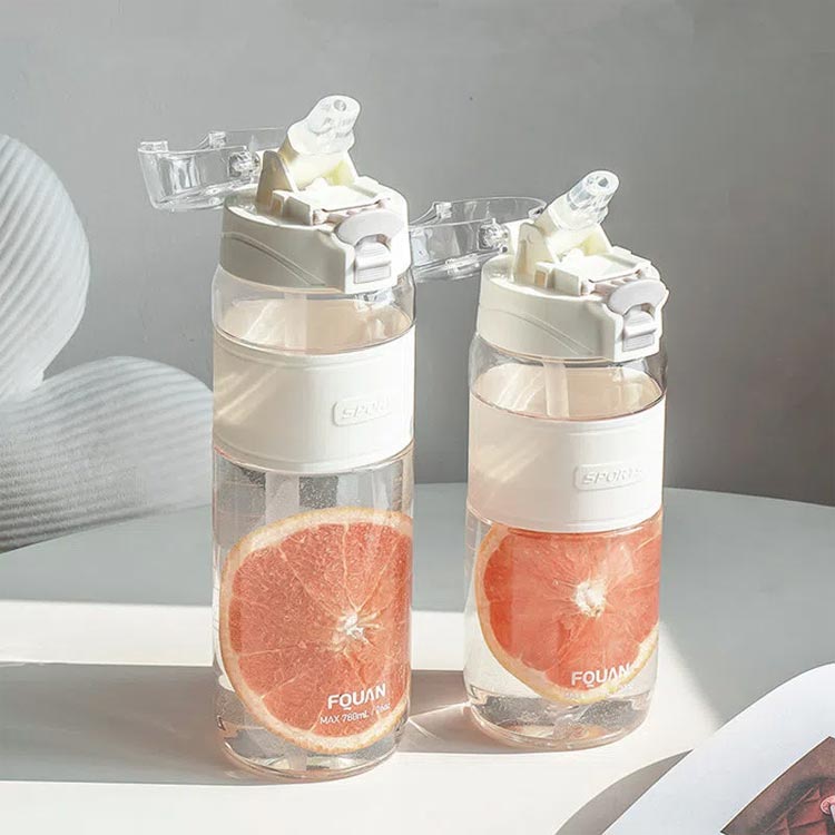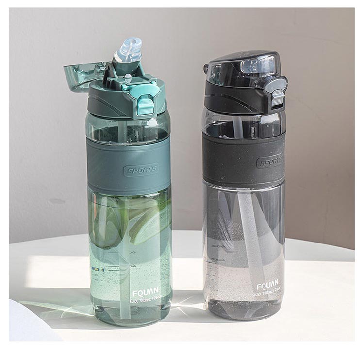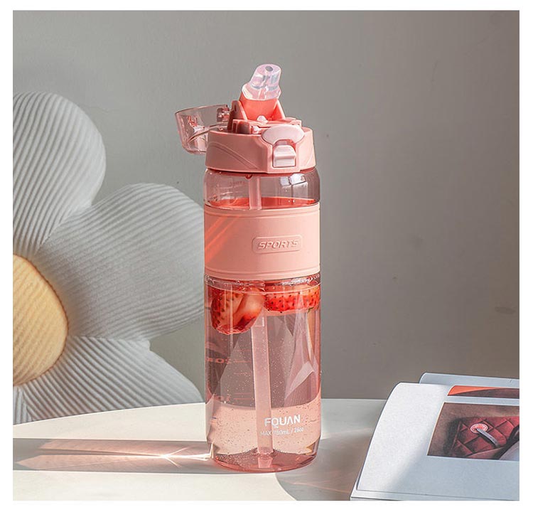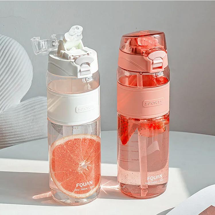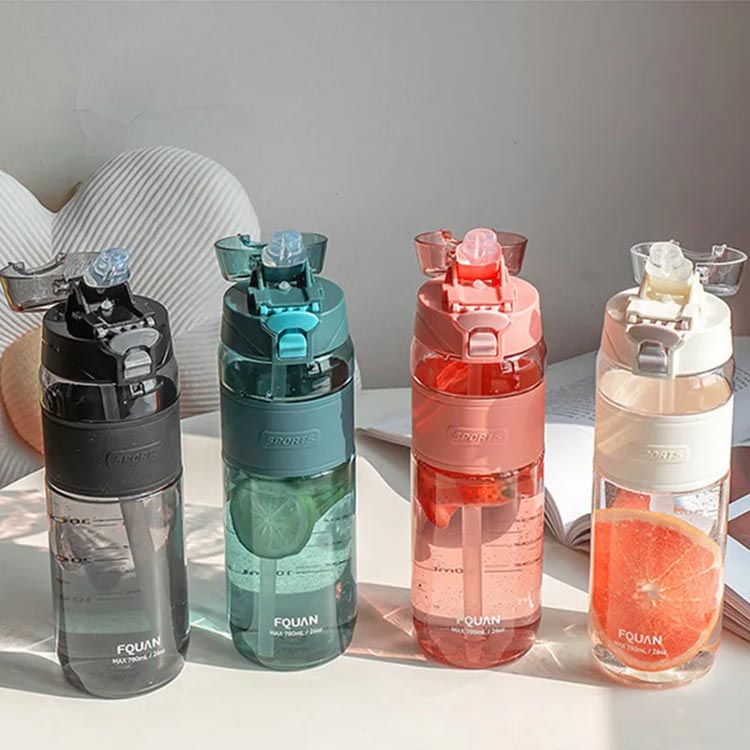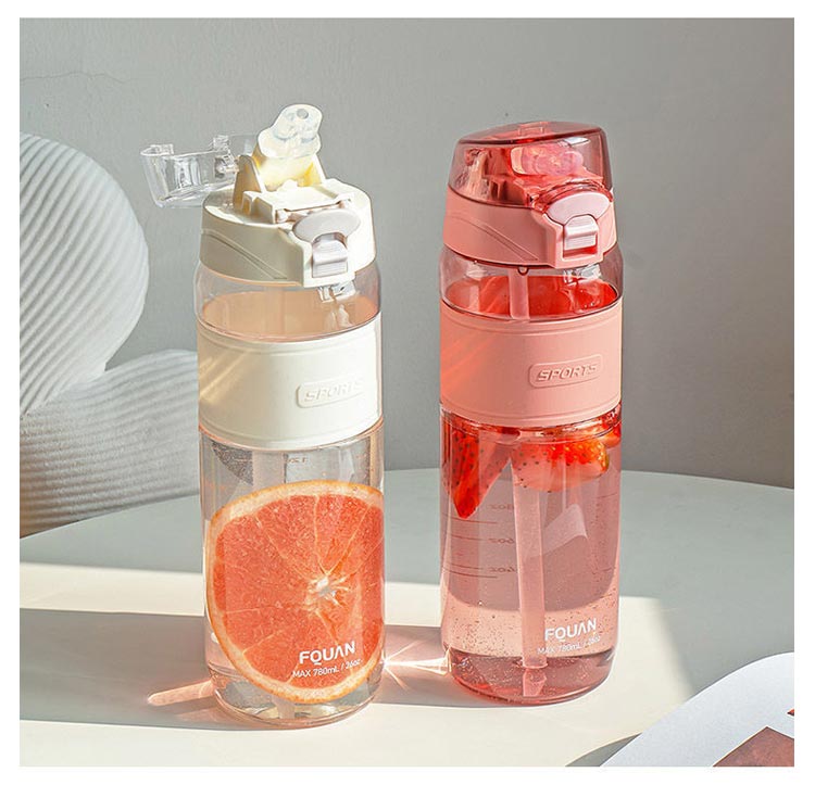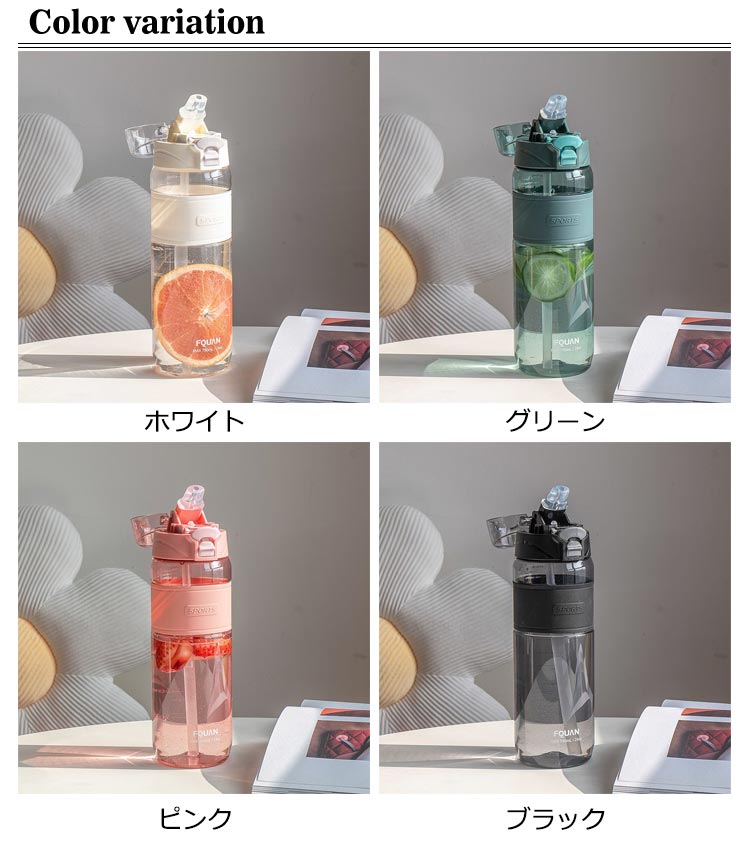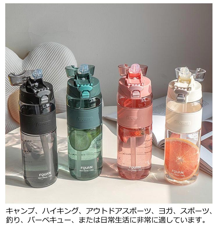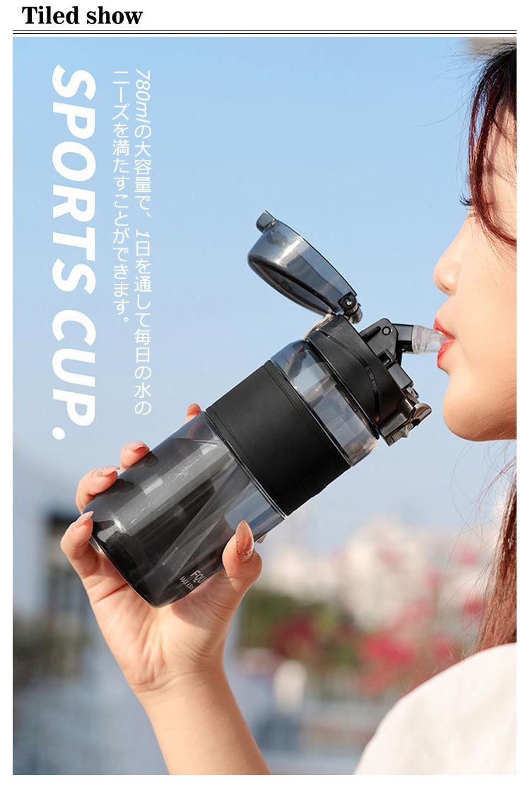 おしゃれなストロー付きのウォーターボトル。【目盛り付き】780mlの大容量で、1日を通して毎日の水のニーズを満たすことができます。ストロー付き、シリコン製で柔らかい、取り外し可能、お手入れ簡単ボタンをクリックして片手で簡単に開けます。安全なロックを設計されており、ほこりや漏れを防ぎます。持ち手がいており、軽量で持ち運びに便利です。ボトル本体にはスポーツドリンクなどを作る際の目安となる目盛が付いています。キャンプ、ハイキング、アウトドアスポーツ、ヨガ、スポーツ、釣り、バーベキュー、または日常生活に非常に適しています。
