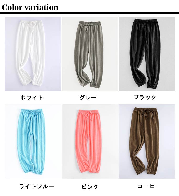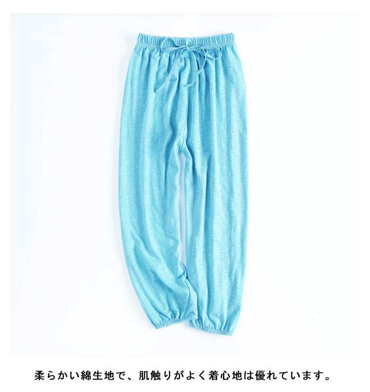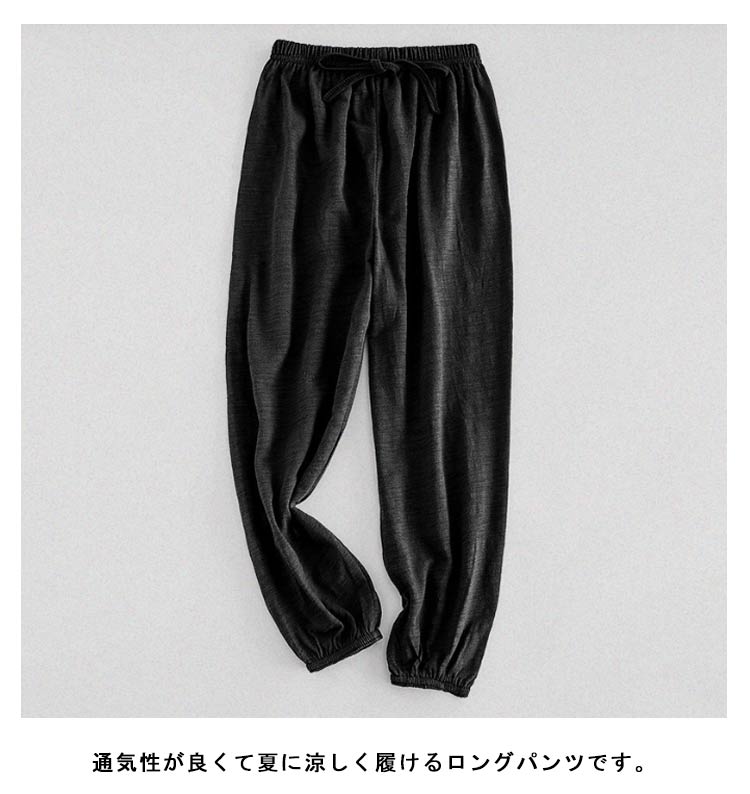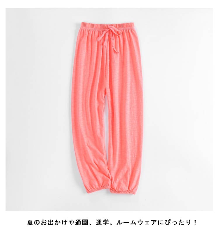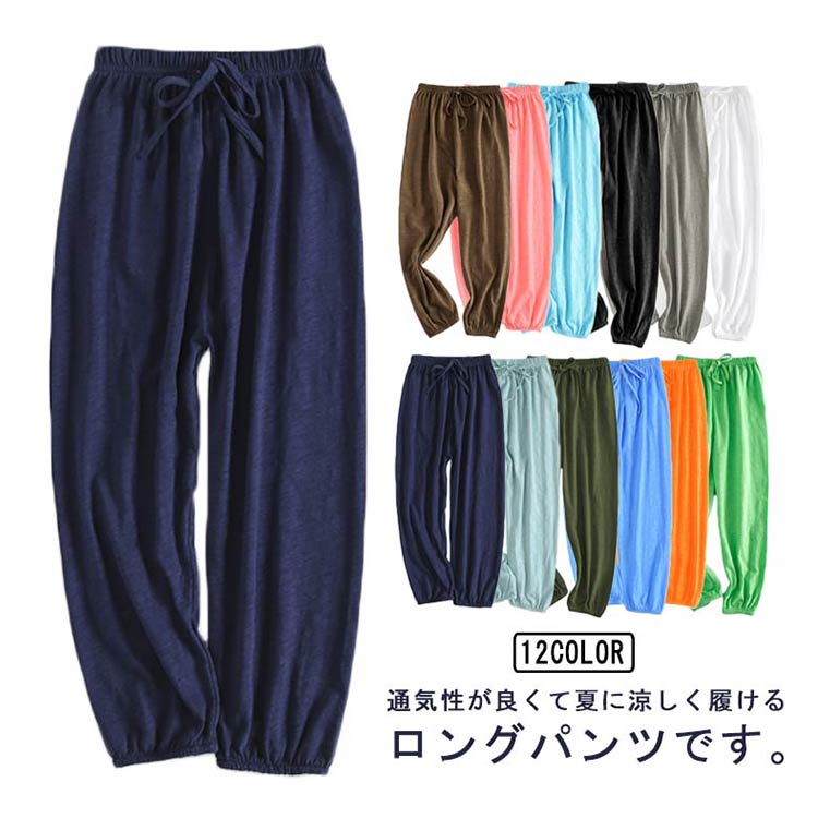 | 通気性が良くて夏に涼しく履けるロングパンツです。 柔らかい綿生地で、肌触りがよく着心地は優れています。 ウエストはゴムなので着脱しやすい仕様になっています。 裾口ゴム仕様なので蚊にさされにくく、夏の外室遊びでもムシムシしません。 夏のお出かけや通園、通学、ルームウェアにぴったり! | |