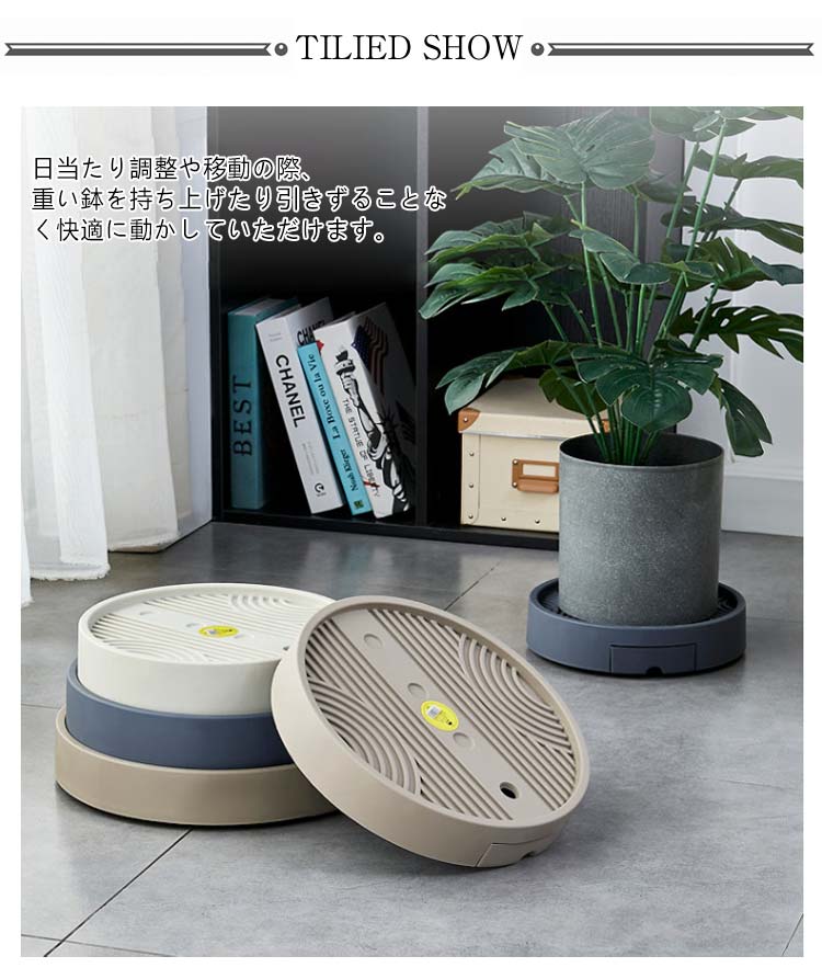 | ?キャスター付きで、重い観葉植物もスイスイ移動できるプランタートレー。 ?日当たり調整や移動の際、重い鉢を持ち上げたり引きずることなく快適に動かしていただけます。 ?キャスターは外からは見えない隠しキャスター仕様で、見た目もスッキリとしたものに。 ?ふちが立ち上がっているので水やりをしても床面に水が零れにくく、水受けトレーとしても使えます。 ※キャスターにはストッパーが付いていません。不安定な場所でのご使用はお避け下さい。 | |