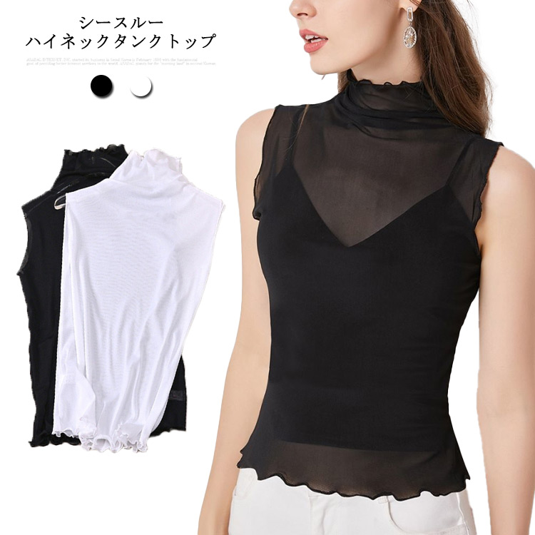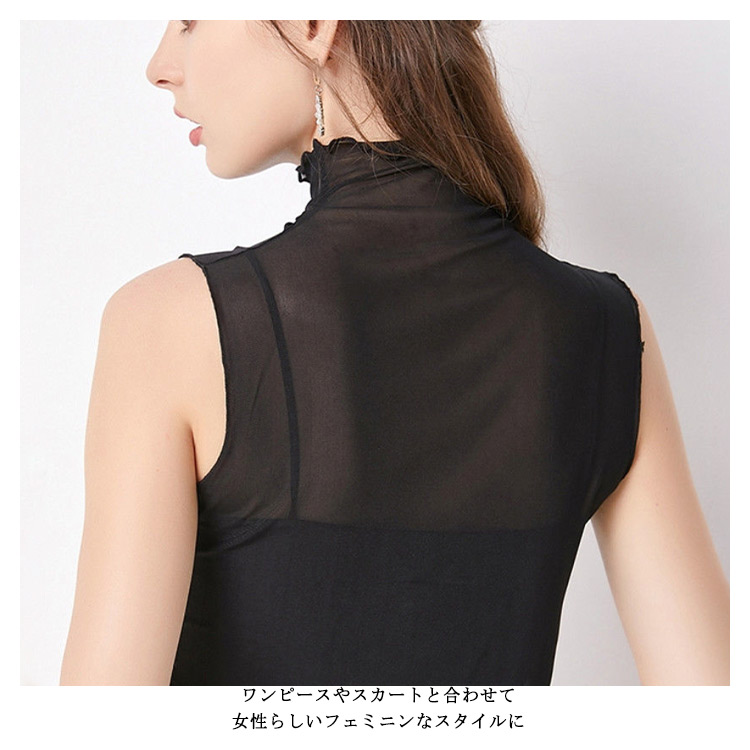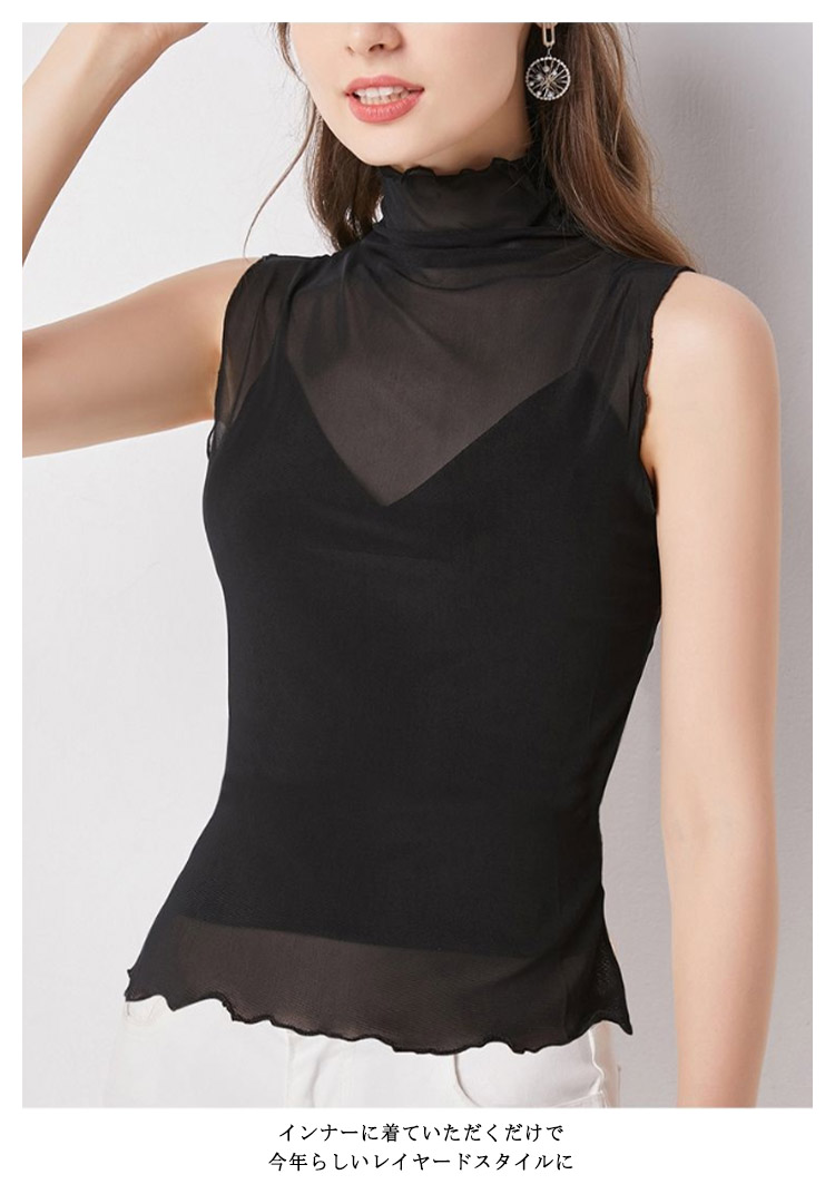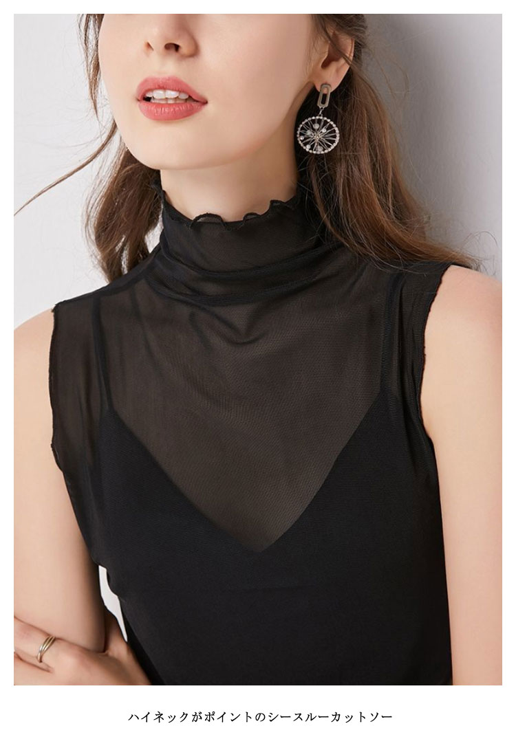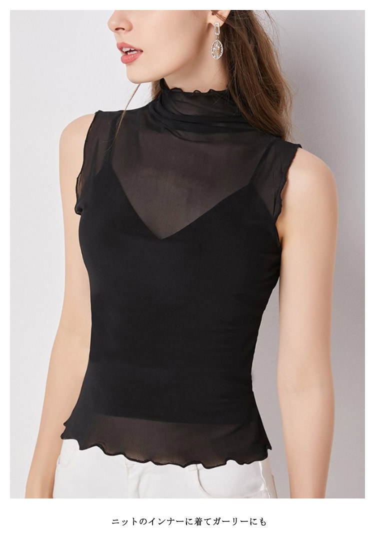 シースルー シアー トップス タンクトップ ハイネック ノースリーブ インナー 薄手 Tシャツ レディース 長袖 春夏 秋 おしゃれ 透け 重ね着 レイヤード コーデ 黒 無地 メッシュ風 ママ 普段着 デイリー OL 通勤 オフィス フリルネック 送料無料