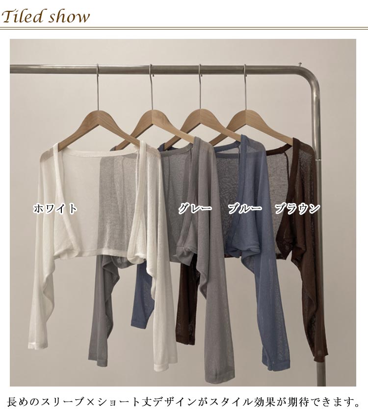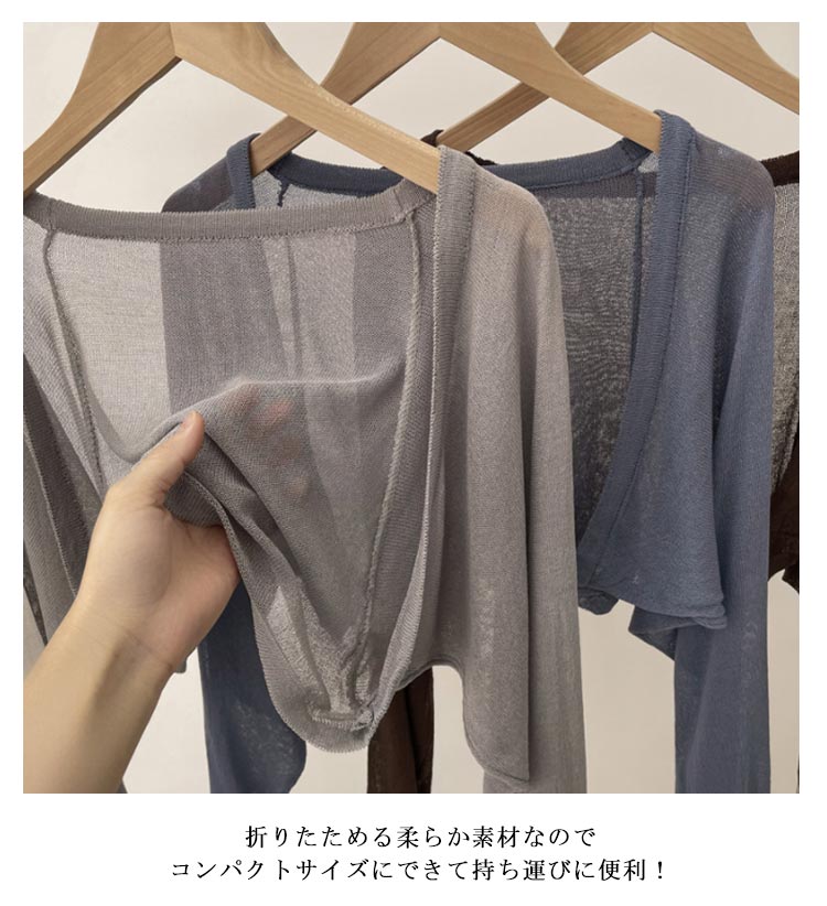 | 折りたためる柔らか素材なのでコンパクトサイズにできて持ち運びに便利! さらっとした素材で夏に大活躍アイテム。 長めのスリーブ×ショート丈デザインがスタイル効果が期待できます。 夏のキャミソールやノースリーブワンピースなどに欠かせない一着間違いなし。 | |