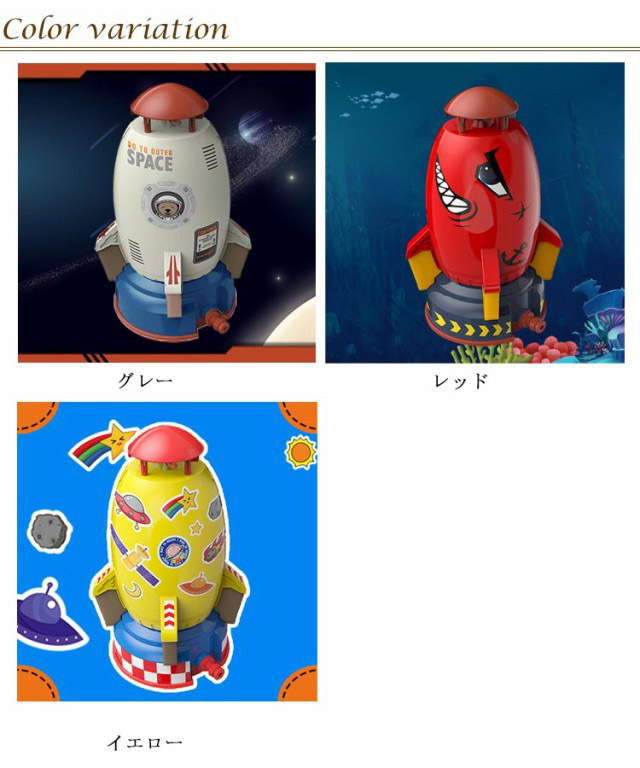 【夏定番のおもちゃ】夏ならではの噴水ロケットおもちゃを断っていい子どもはいません。暑い夏に外でホースをつなぐだけで、おもちゃのロケットを空中に打ち上げるのが楽しいです。水圧をコントロールしたり昇降したりするので、楽しさも増し、子どもの興味を刺激して楽しいアウトドアになります。【取り付けが簡単で、手軽に楽しめます】 ホースの一部を台座に、もう一方の端を屋外の蛇口に接続します。おもちゃのロケットを台座に取り付けて蛇口をひねると、水の圧力に応じてロケットが上昇して回転し、噴水ができます。上昇の高さは水圧と風によって異なります。【素敵なおもちゃ】古典的なキャラクターのロケットの外観に、子供らしいシールを貼って、自分で自分のロケットを作ることができます。本体のイエローとベースのブルーのバランスが子供たちの目を引きます。この夏は、噴水ロケットを夢と楽しさで就航させて、子供たちと一緒に爽やかさと楽しさを満喫しましょう。【安全上質な素材】安全なABSプラスチック、厚手の処理で、おもちゃが壊れるのを防ぎます。頭部と周囲にevaフォームを採用し、子供を保護します。【良いプレゼント】この噴水のおもちゃは男の子でも女の子でも遊ぶことができます。夏の野外活動に噴水のおもちゃが欠かせないでしょうか。子どもへのご褒美としても、祝日や誕生日のプレゼントにも、このロケットはぴったりです。