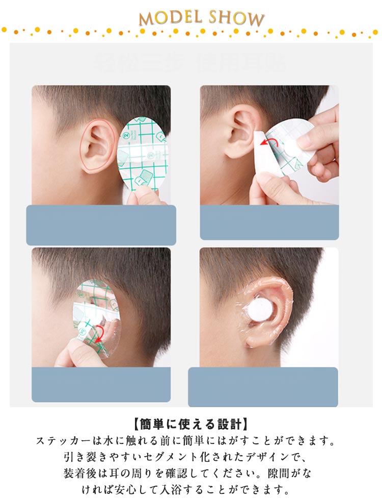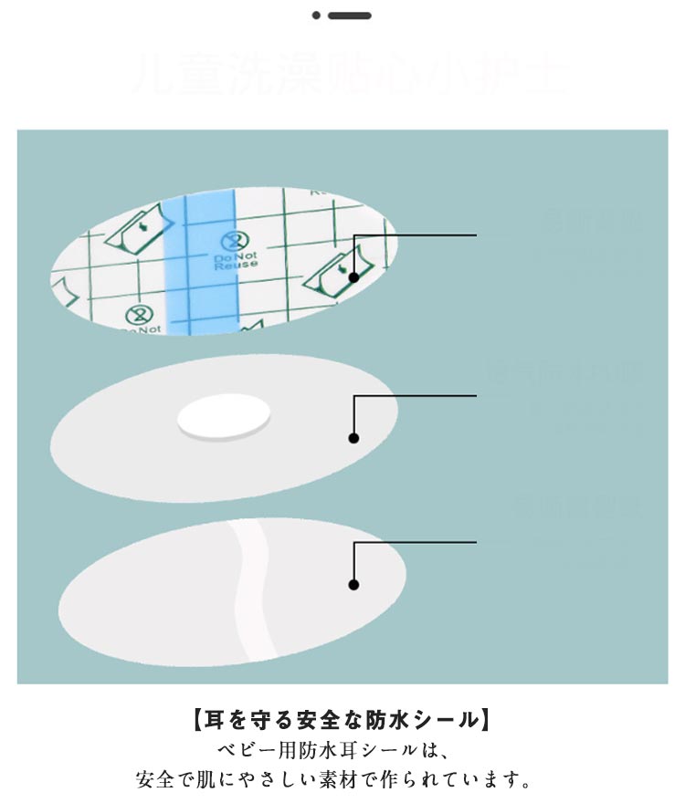 水から耳を守る!イヤーキャップ 120枚入【耳を守る安全な防水シール】ベビー用防水耳シールは、安全で肌にやさしい素材で作られています。【簡単に使える設計】ステッカーは水に触れる前に簡単にはがすことができます。引き裂きやすいセグメント化されたデザインで、装着後は耳の周りを確認してください。隙間がなければ安心して入浴することができます。【安心と便利を提供する】新生児のデリケートなお肌にもやさしく、使いやすい設計です。お風呂や水遊びが不安だった方も安心してお使いいただけます。【多目的な使用方法】ベビー用防水イヤーステッカーは様々な用途に使えます。屋内外での水泳、入浴、シャンプー、ヘアカットなど、さまざまな場面で活躍します。【大容量の120枚入り】水から耳を守る!大容量の120枚入りで、衛生的で使い捨て可能です。家庭用はもちろん、業務用としても最適です!