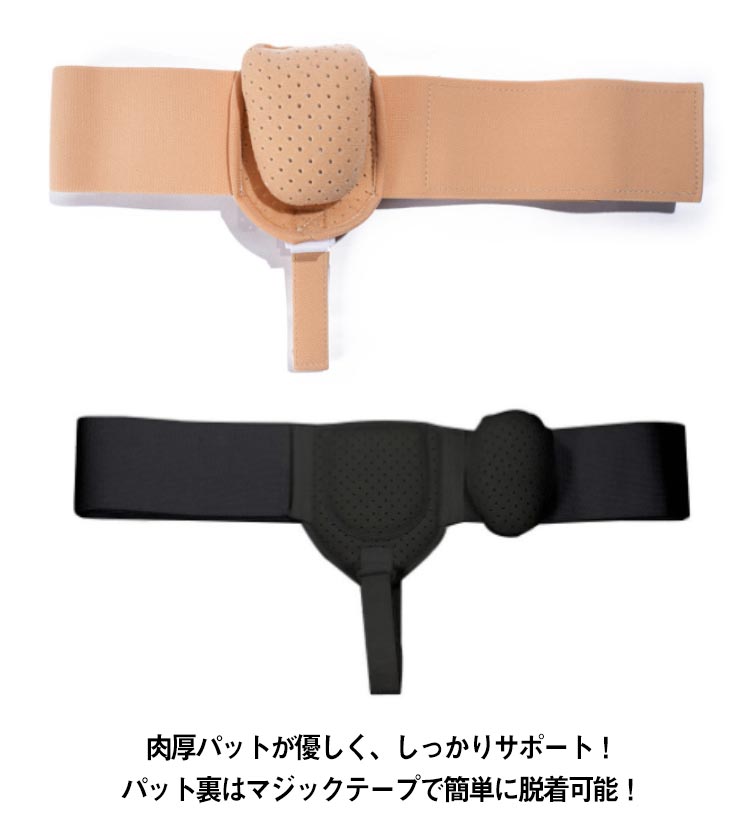 鼠径ヘルニアでお困りの方、必見!下腹部のふくらみ、下腹部の痛み、サポーターの蒸れやずれを解決。マジックテープ仕様で圧迫調整・装着の調整がらくらく可能!肉厚パットが優しく、しっかりサポート!パット裏はマジックテープで簡単に脱着可能!通気性抜群の生地で長時間服の下につけていても気にならない快適仕様。