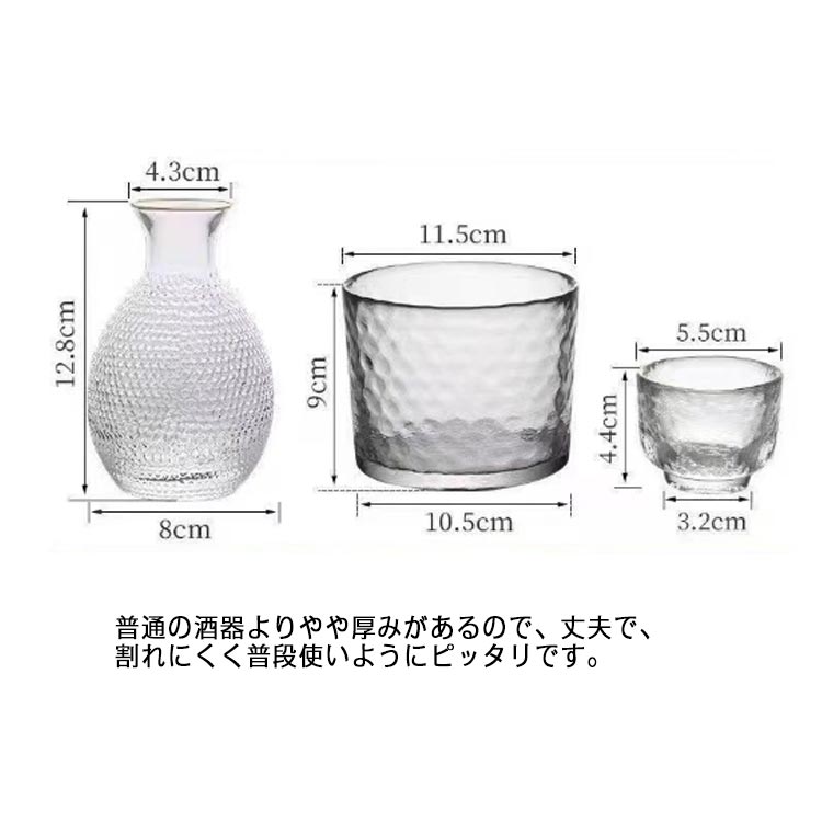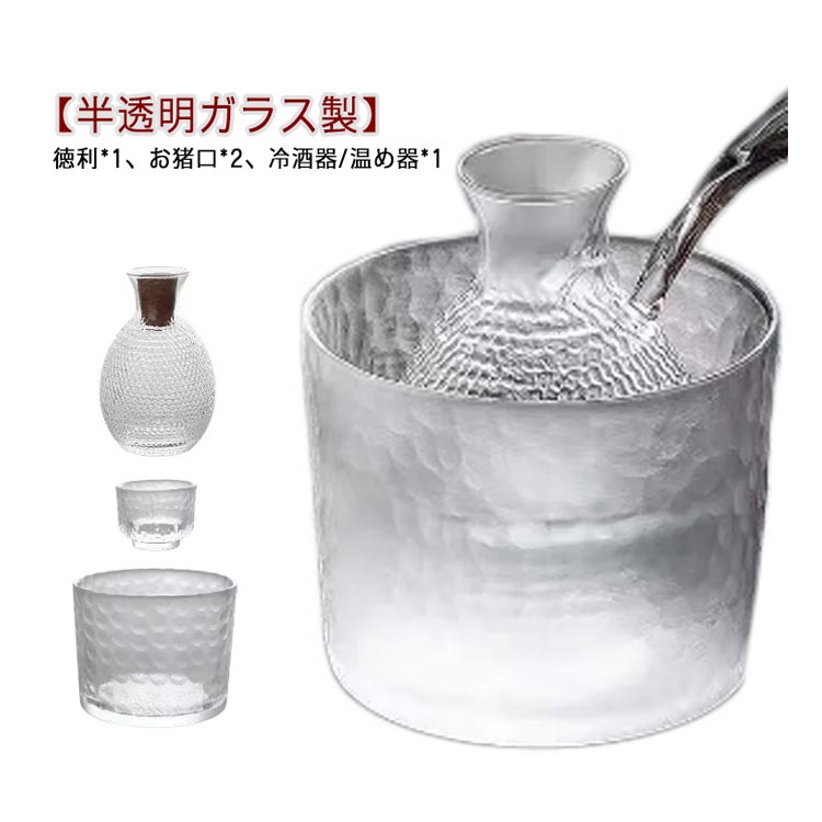 セット内容:徳利*1、お猪口*2、冷酒器/温め器*1【半透明ガラス製】耐熱ガラスを採用し、外のボウル容器にお湯をを入れて、やわらかで美味しい「ぬる燗」も作れます。寒い日に一杯で、身体が暖かくなります。ボウル容器に氷水を入れれば、冷酒も簡単に作れます。保温保冷機能ありますので、オールシーズン活躍します。普通の酒器よりやや厚みがあるので、丈夫で、割れにくく普段使いようにピッタリです。ガラスの透明感とハンドメイドならではの味わいのある手触りで、より一層お酒を楽しむことができます。