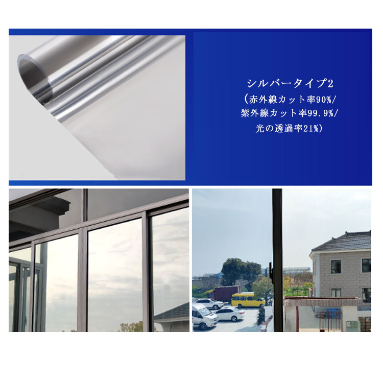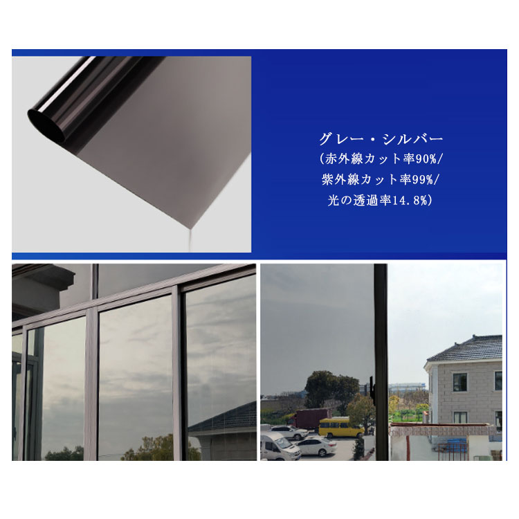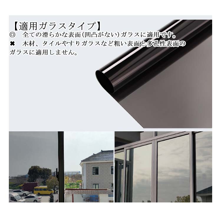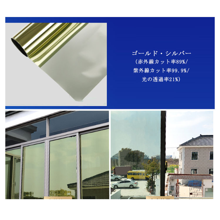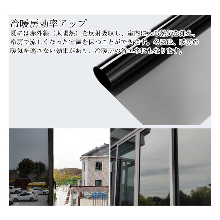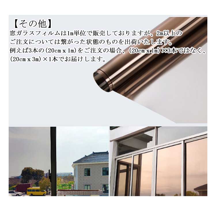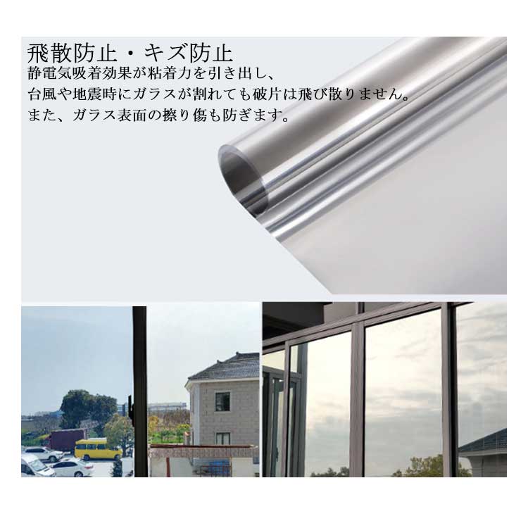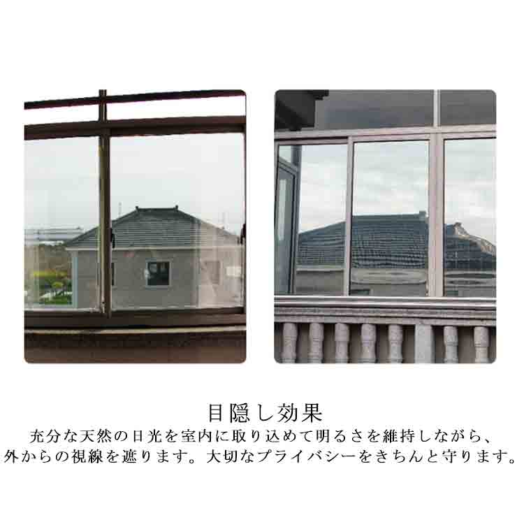【水で貼れる】 【紫外線対策・遮光・断熱】 【目隠し】 【飛散防止・キズ防止】外から見えない!!マジックミラー窓ガラスフィルム★貼り付け簡単水だけで簡単に貼り付けられて、何度も再利用可能です。※使用環境によってフィルムが劣化することがありますので、予めご了承ください。★目隠し効果充分な天然の日光を室内に取り込めて明るさを維持しながら、外からの視線を遮ります。大切なプライバシーをきちんと守ります。★紫外線対策室内に入る有害な紫外線を大幅カットして、眩しい直射日光を和らげて肌を刺すようなジリジリ感などの不快を抜き取り、紫外線による家具の日焼け、変色、劣化も軽減できます。★飛散防止・キズ防止静電気吸着効果が粘着力を引き出し、台風や地震時にガラスが割れても破片は飛び散りません。また、ガラス表面の擦り傷も防ぎます。★冷暖房効率アップ夏には赤外線(太陽熱)を反射吸収し、室内に入る熱気を抑え、冷房で涼しくなった室温を保つことができます。冬には、暖房の暖気を逃さない効果があり、冷暖房の省エネにもなります。【適用ガラスタイプ】◎ 全ての滑らかな表面(凹凸がない)ガラスに適用です。✖ 木材、タイルやすりガラスなど粗い表面と多孔性表面のガラスに適用しません。【その他】窓ガラスフィルムは1m単位で販売しておりますが、2m以上のご注文については繋がった状態のものを出荷いたします。例えば3本の(20cmx1m)をご注文の場合、(20cmx1m)×3本ではなく、(20cmx3m)×1本でお届けします。