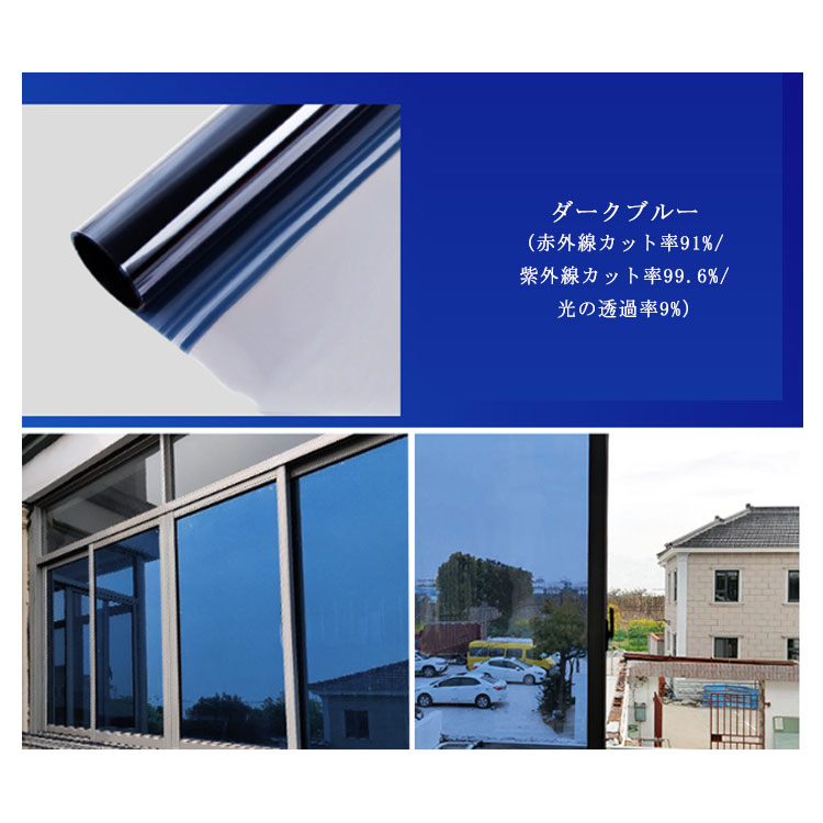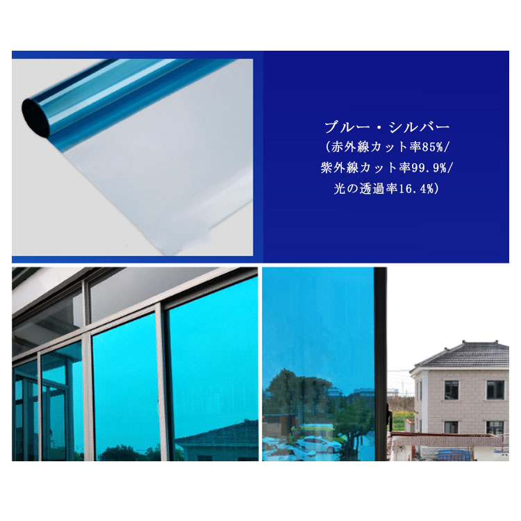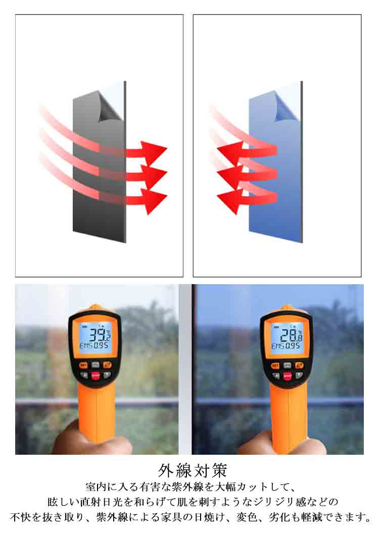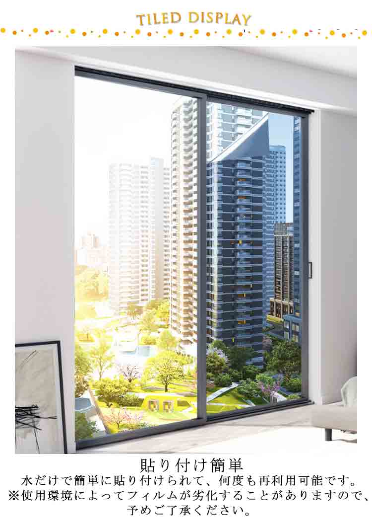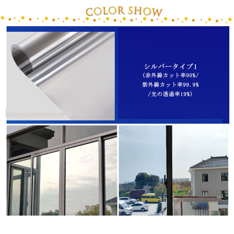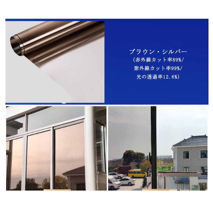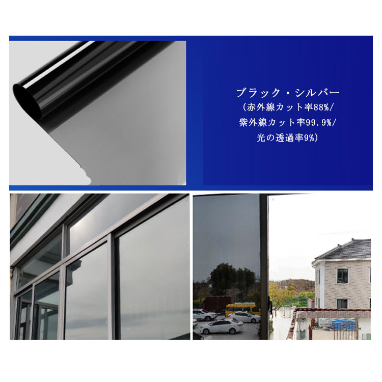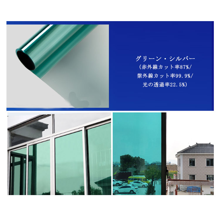 【水で貼れる】 【紫外線対策・遮光・断熱】 【目隠し】 【飛散防止・キズ防止】外から見えない!!マジックミラー窓ガラスフィルム★貼り付け簡単水だけで簡単に貼り付けられて、何度も再利用可能です。※使用環境によってフィルムが劣化することがありますので、予めご了承ください。★目隠し効果充分な天然の日光を室内に取り込めて明るさを維持しながら、外からの視線を遮ります。大切なプライバシーをきちんと守ります。★紫外線対策室内に入る有害な紫外線を大幅カットして、眩しい直射日光を和らげて肌を刺すようなジリジリ感などの不快を抜き取り、紫外線による家具の日焼け、変色、劣化も軽減できます。★飛散防止・キズ防止静電気吸着効果が粘着力を引き出し、台風や地震時にガラスが割れても破片は飛び散りません。また、ガラス表面の擦り傷も防ぎます。★冷暖房効率アップ夏には赤外線(太陽熱)を反射吸収し、室内に入る熱気を抑え、冷房で涼しくなった室温を保つことができます。冬には、暖房の暖気を逃さない効果があり、冷暖房の省エネにもなります。【適用ガラスタイプ】◎ 全ての滑らかな表面(凹凸がない)ガラスに適用です。✖ 木材、タイルやすりガラスなど粗い表面と多孔性表面のガラスに適用しません。【その他】窓ガラスフィルムは1m単位で販売しておりますが、2m以上のご注文については繋がった状態のものを出荷いたします。例えば3本の(20cmx1m)をご注文の場合、(20cmx1m)×3本ではなく、(20cmx3m)×1本でお届けします。