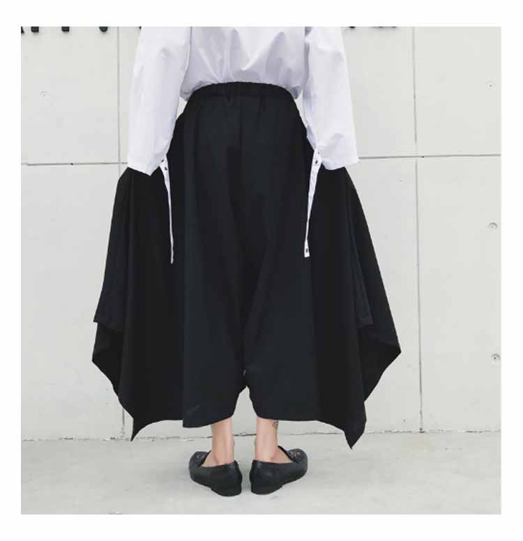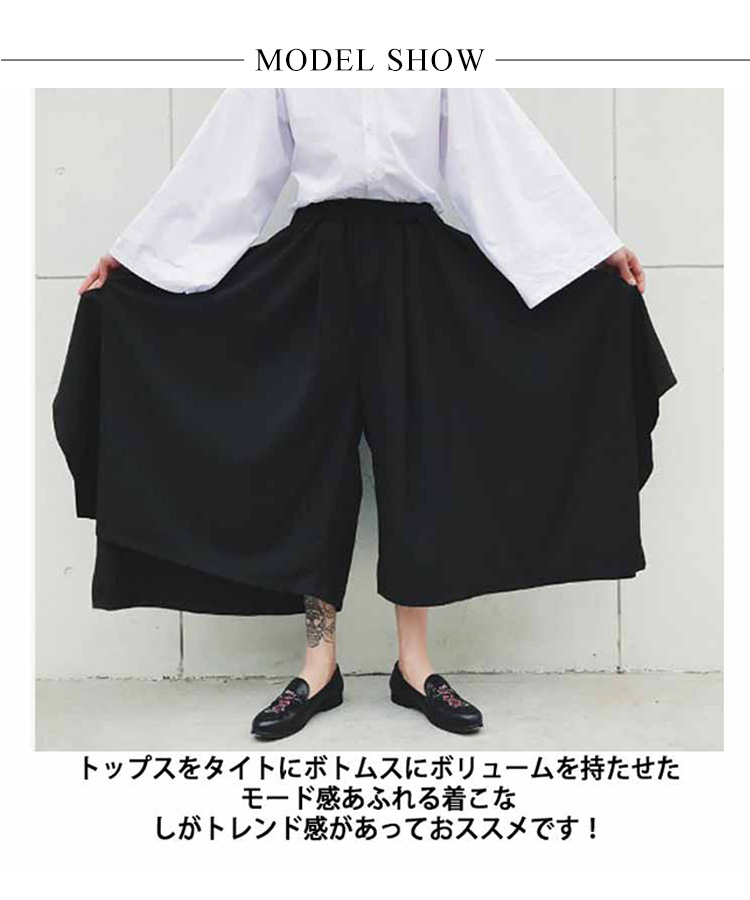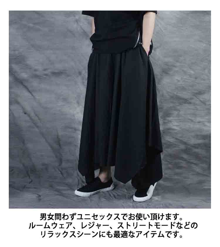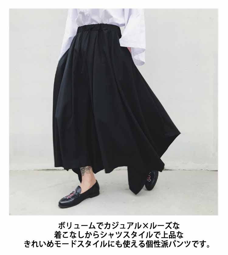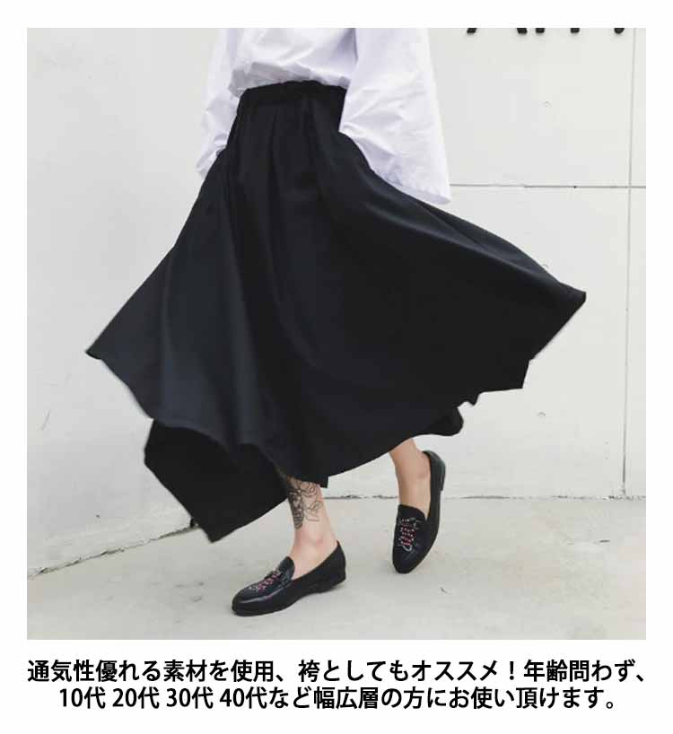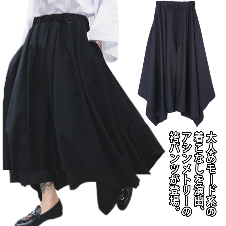 トップスをタイトにボトムスにボリュームを持たせたモード感あふれる着こなしがトレンド感があっておススメです!大人めモード系の着こなしを演出、アシンメトリーの袴パンツが登場。ゆるめに穿きこなせるゆったりとしたビッグシルエットと絶妙なアンクルカットの丈感で、旬のコーデを実現してくれます。ボリュームでカジュアル×ルーズな着こなしからシャツスタイルで上品なきれいめモードスタイルにも使える個性派パンツです。ワイドなフォルムで、メリハリが生まれスタイルが重くならずスッキリとした印象に。男女問わずユニセックスでお使い頂けます。ルームウェア、レジャー、ストリートモードなどのリラックスシーンにも最適なアイテムです。通気性優れる素材を使用、袴としてもオススメ!年齢問わず、10代 20代 30代 40代など幅広層の方にお使い頂けます。