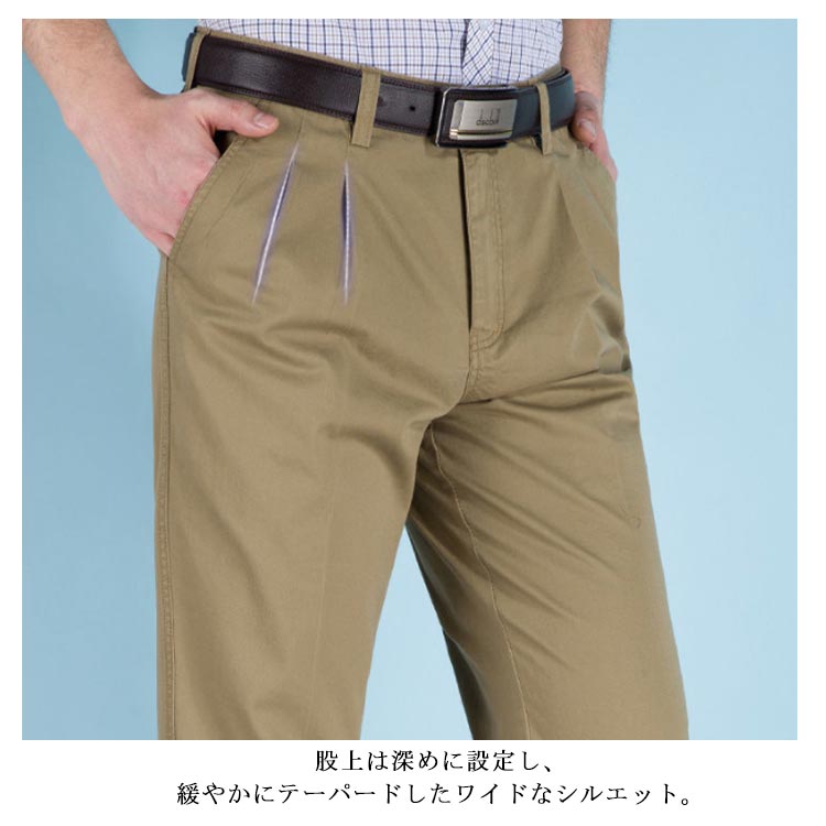 ツータックを施された薄手のワイドチノパンツ。クラシックなコットン60%ポリエステル40%のしっかりしたツイル素材を使用。さらりとした柔らかい肌当たり、適度に伸縮する生地感のため、動きやすく軽快なはき心地。股上は深めに設定し、緩やかにテーパードしたワイドなシルエット。ツータックながら腰周りのボリュームを押さえることで、すっきりとした印象で穿けます。薄手過ぎず厚手過ぎない生地で、シーズン問わず通年着用いただけます。ご自宅での手洗いが可能なのも嬉しいポイント。