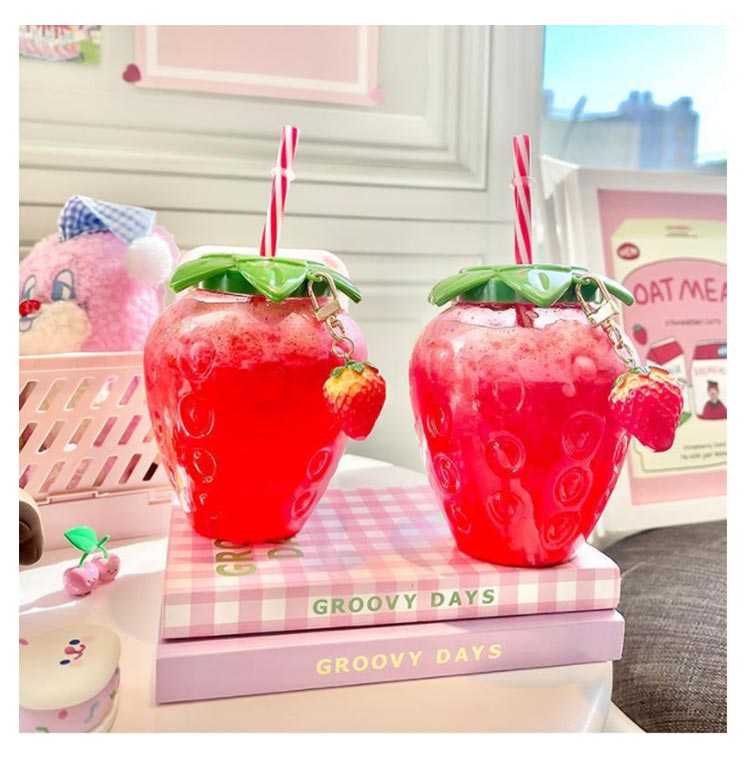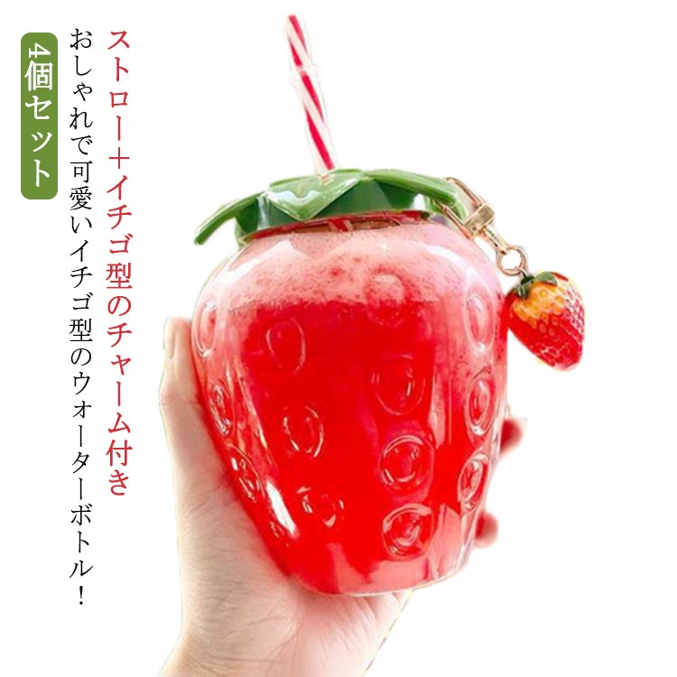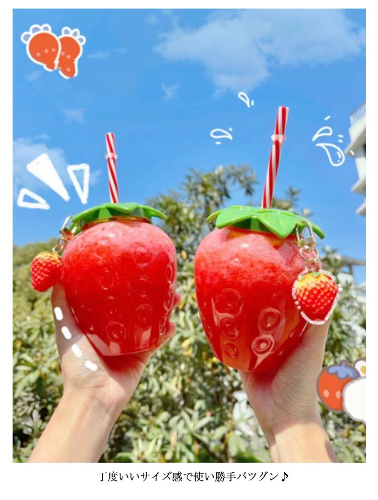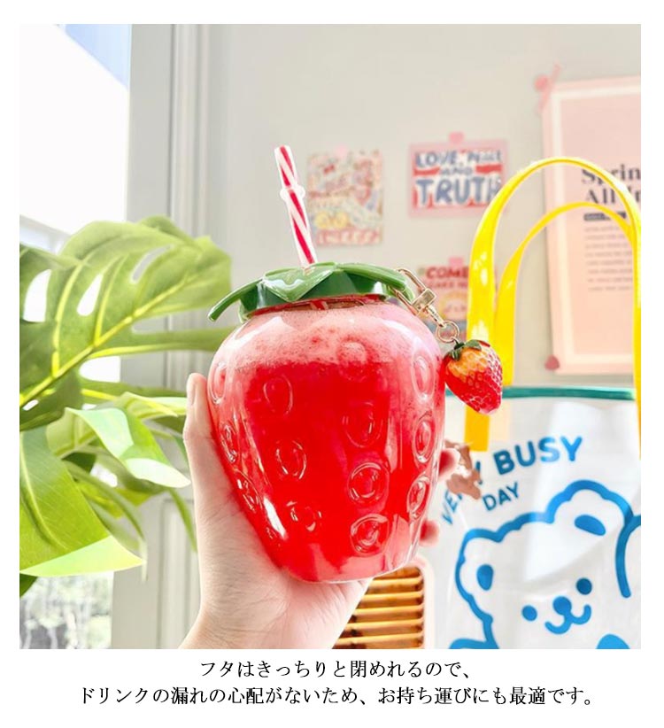 話題のSNSで映える事間違いなし。おしゃれで可愛いイチゴ型のウォーターボトル!【ストロー+イチゴ型のチャーム付き】【4個セット】丁度いいサイズ感で使い勝手バツグン♪フタはきっちりと閉めれるので、ドリンクの漏れの心配がないため、お持ち運びにも最適です。