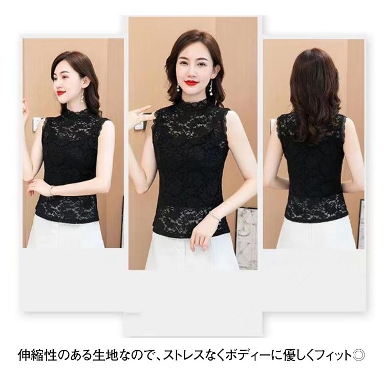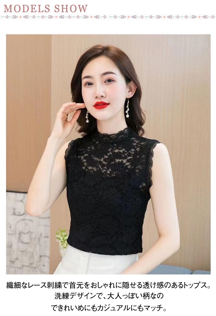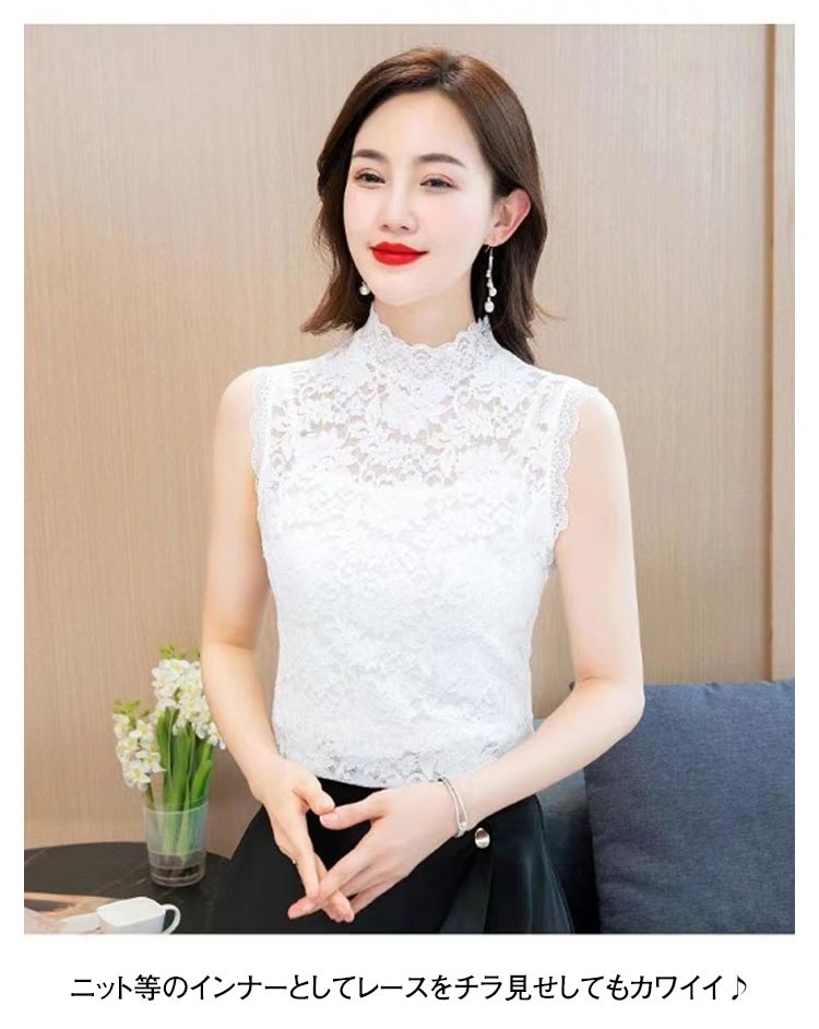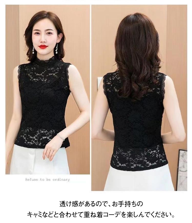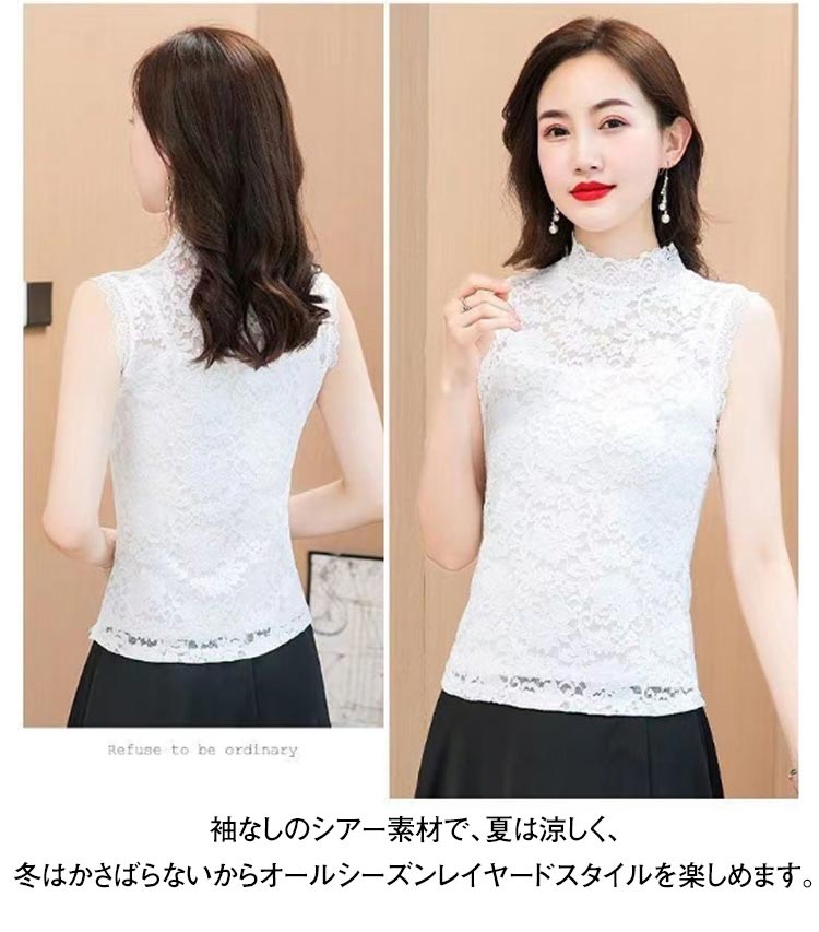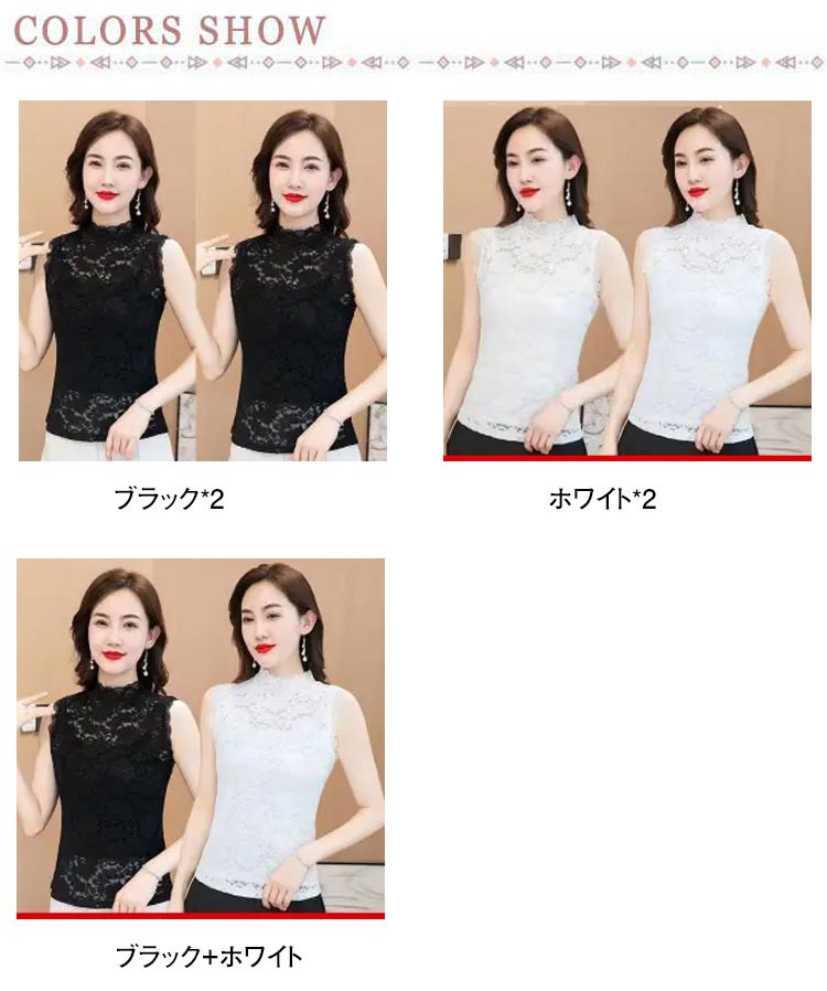 2枚セット レースインナー レディース ハイネック 総レース ノースリーブ トップス タンクトップ 袖なし シースルー ブラウス 透け感 重ね着 レイヤード きれいめ カットソー ブラック ホワイト 白 黒