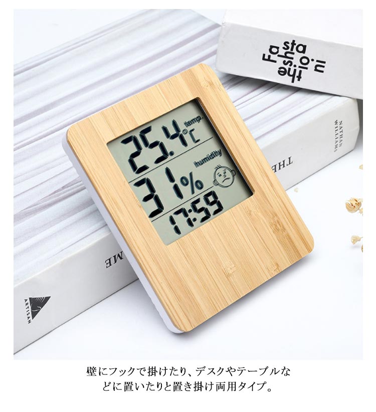 | ペットや赤ちゃんのいるご家庭に大活躍するデジタル温湿度計。 壁にフックで掛けたり、デスクやテーブルなどに置いたりと置き掛け両用タイプ。 正面は温もりのある木目調で、インテリアの邪魔にならず、リビングやオフィス、寝室、車内などさまざまな場所で活躍します。 赤ちゃんや高齢の方が過ごす場所、受験生がいる部屋、オフィスなどいろんな空間の状態を知って、よりよい健康を管理することができます。 | |