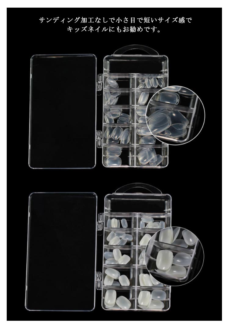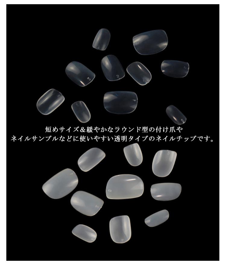 | 【200枚入】【クリアチップ】【子供用】 短めサイズ&緩やかなラウンド型の付け爪やネイルサンプルなどに使いやすい透明タイプのネイルチップです。 サンディング加工なしで小さ目で短いサイズ感でキッズネイルにもお勧めです。 若干、平たい感じのネイルチップです。 ジェルネイル 練習用にも。 収納ケース付き おすすめ年齢:6-12歳 | |