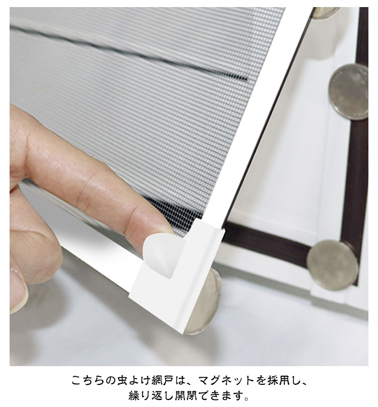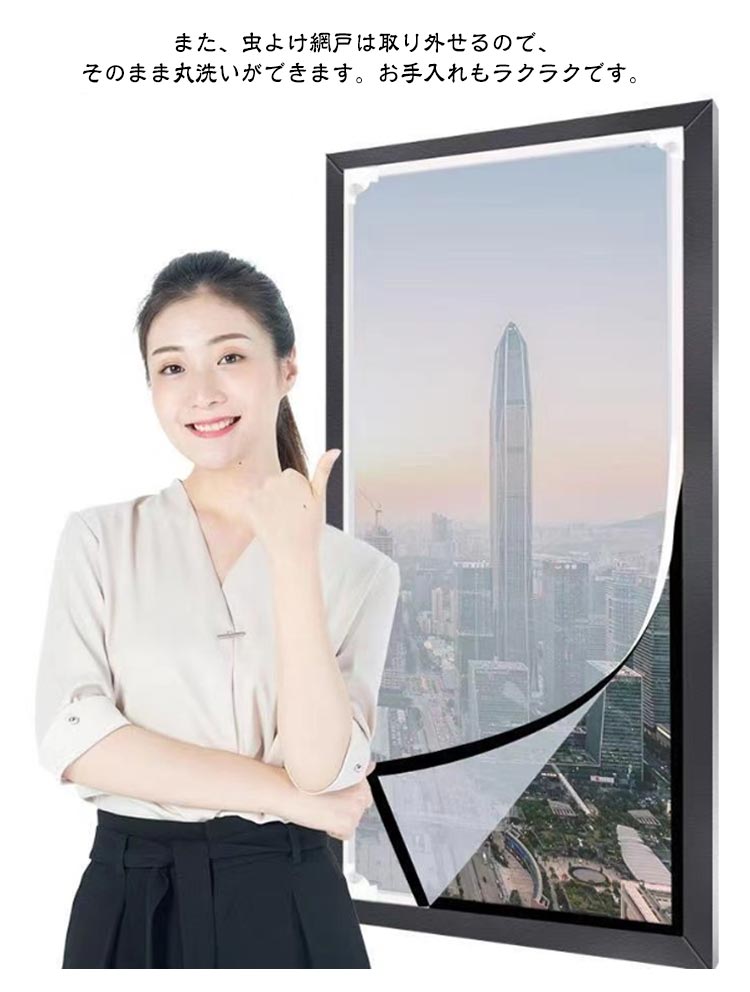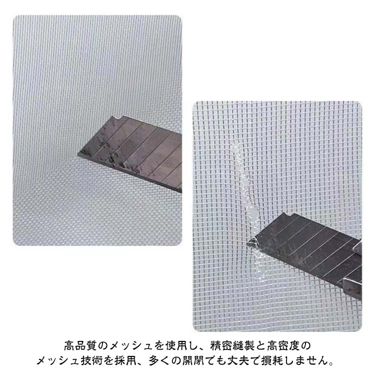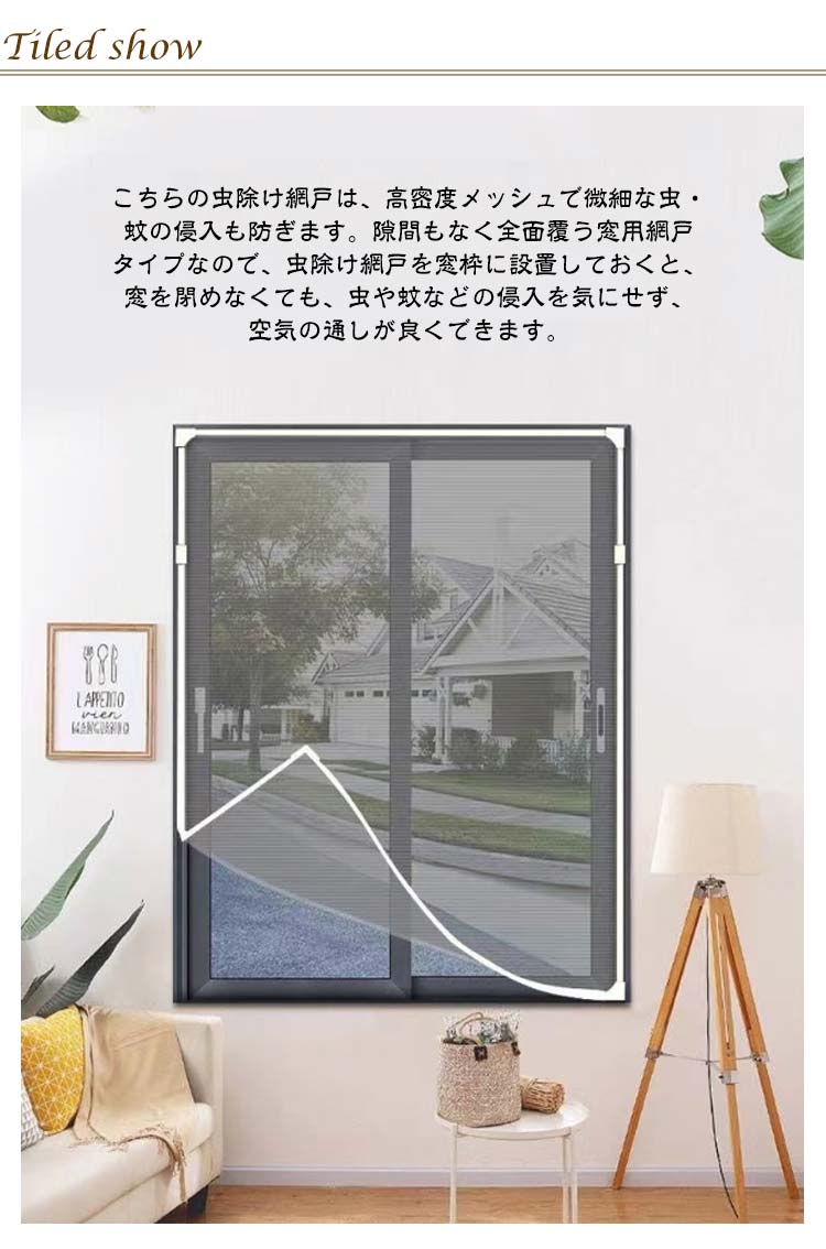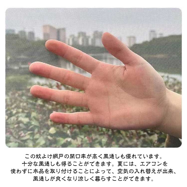 【防虫・防蚊】こちらの虫除け網戸は、高密度メッシュで微細な虫・蚊の侵入も防ぎます。隙間もなく全面覆う窓用網戸タイプなので、虫除け網戸を窓枠に設置しておくと、窓を閉めなくても、虫や蚊などの侵入を気にせず、空気の通しが良くできます。【カット可能・サイズ調節可能】この防虫ネットは、カットによるサイズ調節が可能です。お宅の窓大きさに完璧に合わせて防虫ネットをカットできます。だから、この防虫ネットはどんな窓枠にも網戸がぴったりと納まります。この防虫ネットキットがあれば、網戸を作るお手間もお金も節約します。【通風性】この蚊よけ網戸の開口率が高く風通しも優れています。十分な風通しも得ることができます。夏には、エアコンを使わずに本品を取り付けることによって、空気の入れ替えが出来、風通しが良くなり涼しく暮らすことができます。【優れた耐久性】こちらの虫よけ網戸は、マグネットを採用し、繰り返し開閉できます。高品質のメッシュを使用し、精密縫製と高密度のメッシュ技術を採用、多くの開閉でも丈夫で損耗しません。また、虫よけ網戸は取り外せるので、そのまま丸洗いができます。お手入れもラクラクです。取付方法:1.シール付きマグネットを窓枠に貼り付けます。窓枠を綺麗にしてください。2.シールなしマグネットをシール付きマグネットに合わせて貼り付けます。3.PVC枠で、網シートを窓枠にピタッとくっつける。短いPVC枠で網シートを窓枠に仮留めします。網シートをマグネットとPVC枠で挟み固定します。