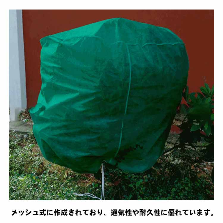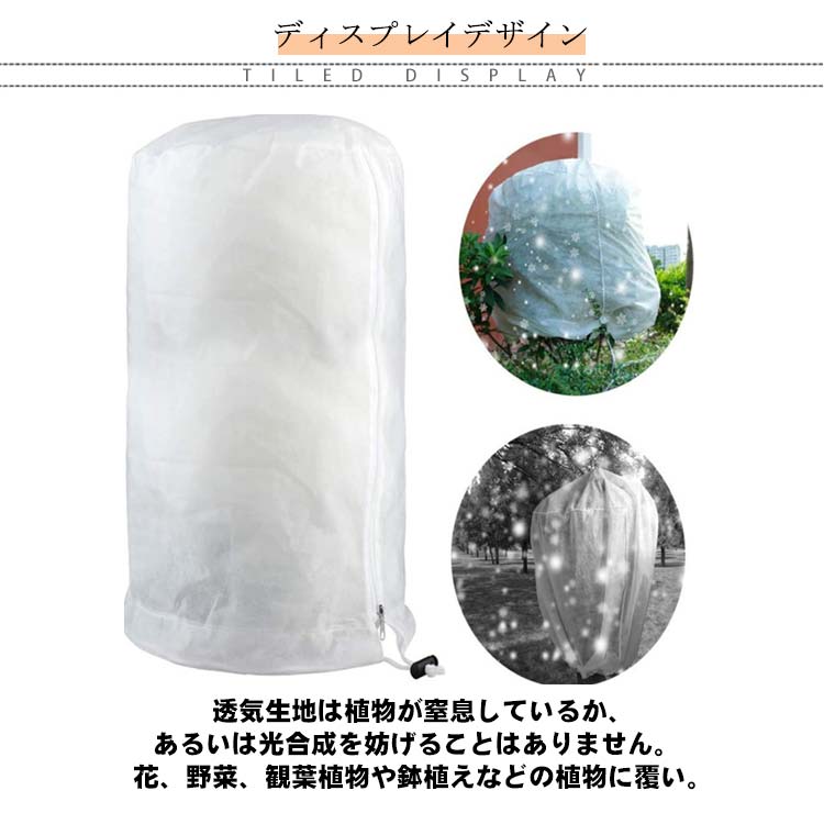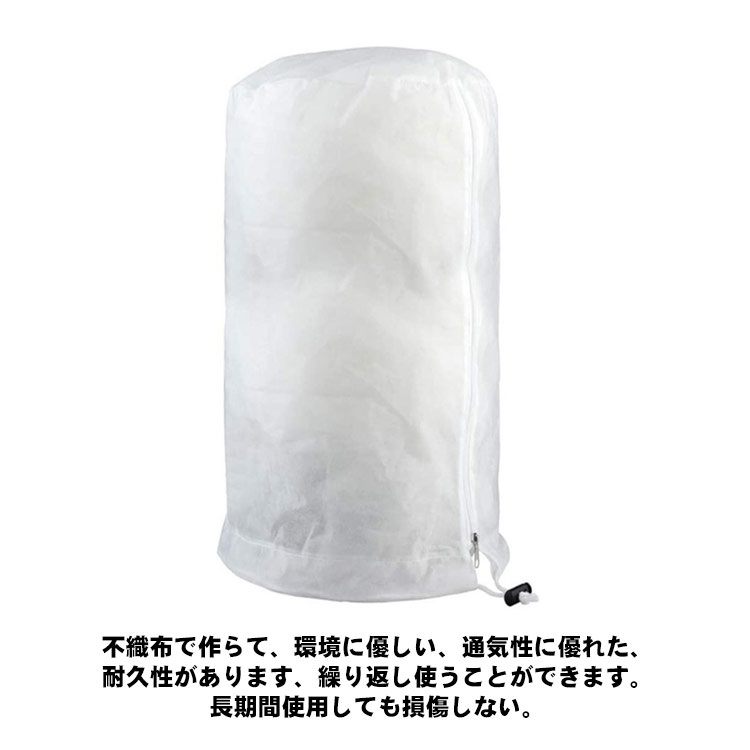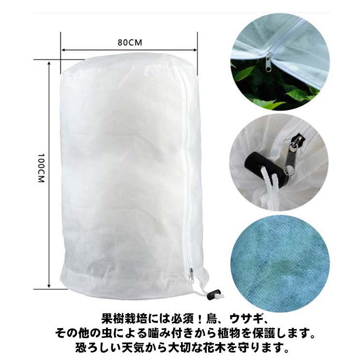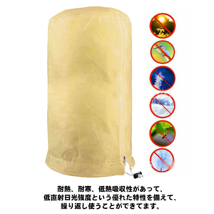 ファスナー付きタイプなので、樹木に被せてファスナーを締めるだけの簡単取付け。透気生地は植物が窒息しているか、あるいは光合成を妨げることはありません。 花、野菜、観葉植物や鉢植えなどの植物に覆い。果樹栽培には必須!鳥、ウサギ、その他の虫による噛み付きから植物を保護します。恐ろしい天気から大切な花木を守ります。 不織布で作らて、環境に優しい、通気性に優れた、耐久性があります、繰り返し使うことができます。長期間使用しても損傷しない。メッシュ式に作成されており、通気性や耐久性に優れています。耐熱、耐寒、低熱吸収性があって、低直射日光強度という優れた特性を備えて、繰り返し使うことができてます。広い開口部により、花や木に直接覆って、プラントの高さや大きさに合わせて自由に保護カバーを調整することができます。