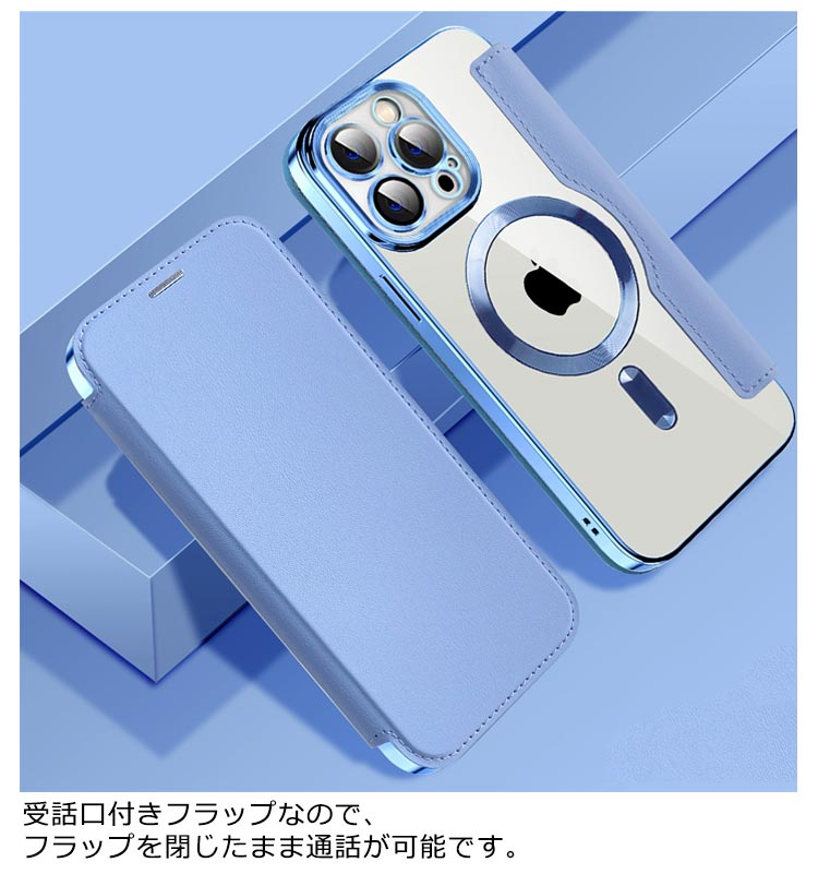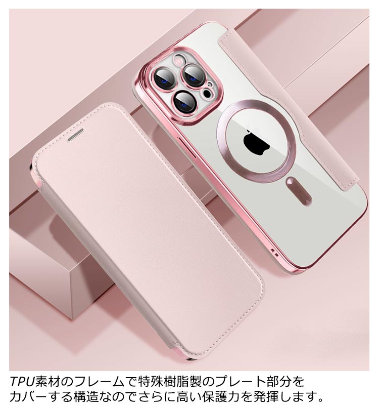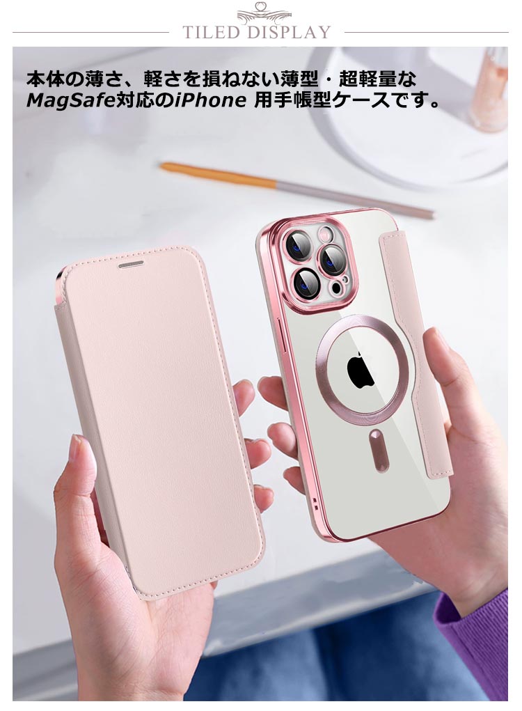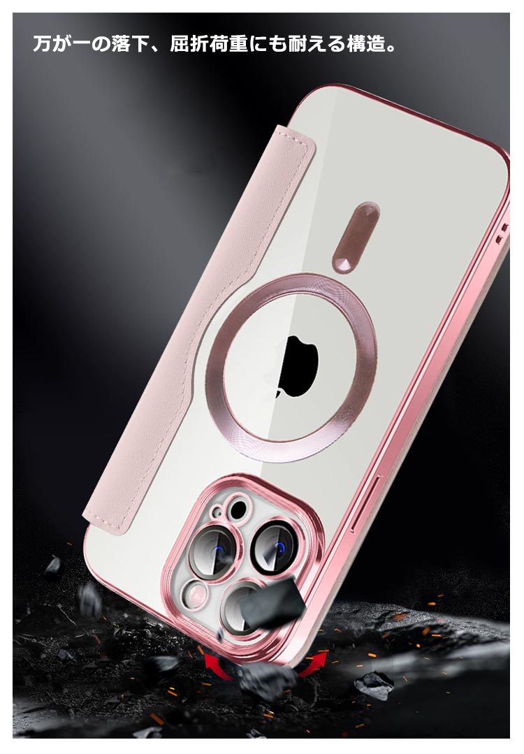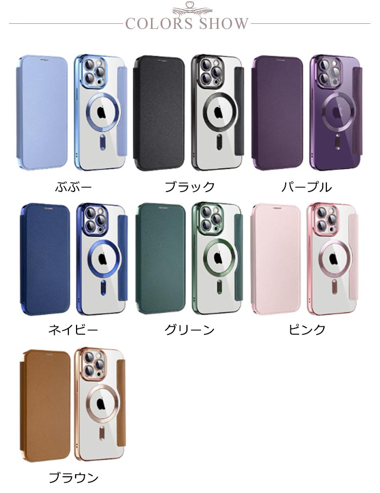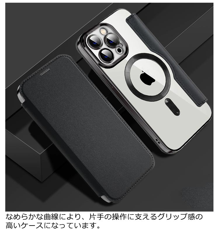 【レンズ保護カバー 一体型】【MagSafe充電器対応】【高級感メッキカバー】本体の薄さ、軽さを損ねない薄型・超軽量なMagSafe対応のiPhone 用手帳型ケースです。フラップ内側にメモやカードなどが収納できるカードポケットが1つ付いています。ケース本体に Magsafe用マグネットが仕込まれているので、ワンタッチでワイヤレス充電を行うことができます。マグネットによりコイル位置が合うので、効率よく充電可能です。なめらかな曲線により、片手の操作に支えるグリップ感の高いケースになっています。磁力の強いマグネットを内蔵。カバンの中でフラップが開いて、液晶画面が傷つく心配もありません。フラップ内側にメモやカードなどが収納できるカードポケットが3つ付いています。TPU素材のフレームで特殊樹脂製のプレート部分をカバーする構造なのでさらに高い保護力を発揮します。万が一の落下、屈折荷重にも耐える構造。全周360度にわたって端末本体をしっかり保護。受話口付きフラップなので、フラップを閉じたまま通話が可能です。