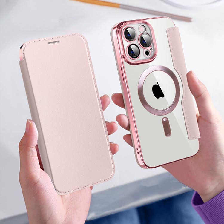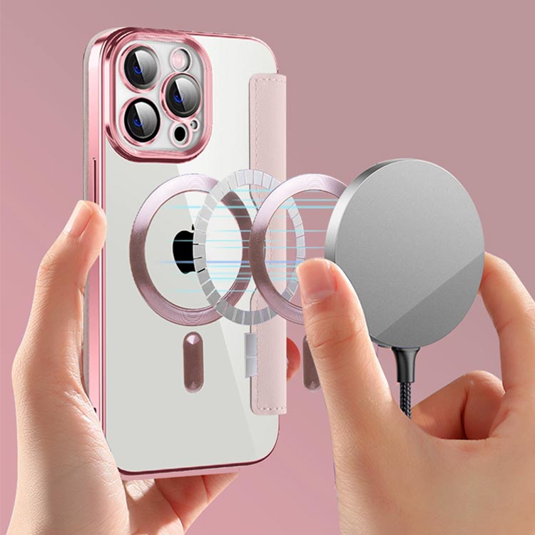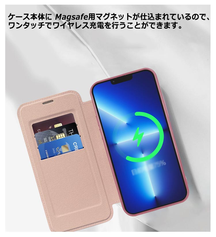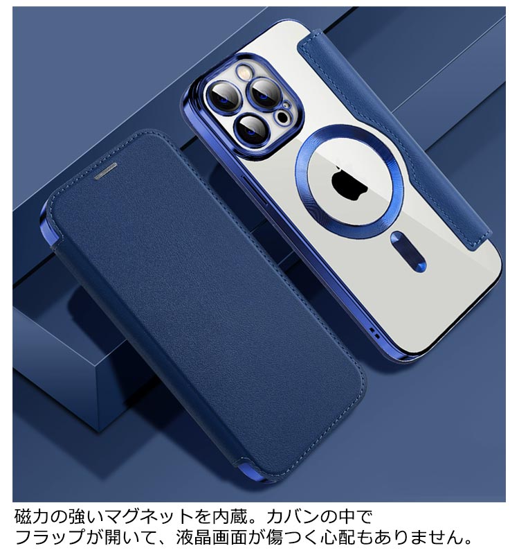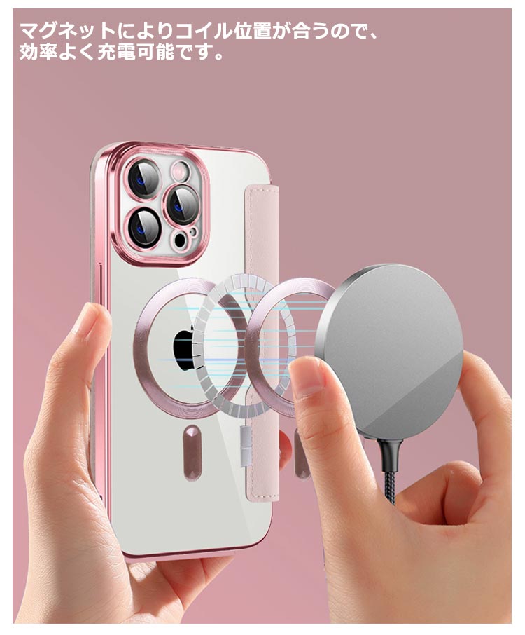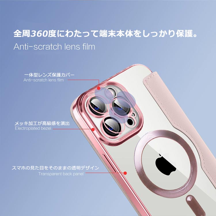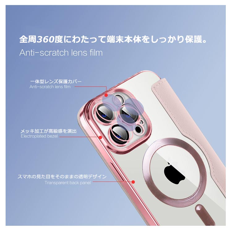 【レンズ保護カバー 一体型】【MagSafe充電器対応】【高級感メッキカバー】本体の薄さ、軽さを損ねない薄型・超軽量なMagSafe対応のiPhone 用手帳型ケースです。フラップ内側にメモやカードなどが収納できるカードポケットが1つ付いています。ケース本体に Magsafe用マグネットが仕込まれているので、ワンタッチでワイヤレス充電を行うことができます。マグネットによりコイル位置が合うので、効率よく充電可能です。なめらかな曲線により、片手の操作に支えるグリップ感の高いケースになっています。磁力の強いマグネットを内蔵。カバンの中でフラップが開いて、液晶画面が傷つく心配もありません。フラップ内側にメモやカードなどが収納できるカードポケットが3つ付いています。TPU素材のフレームで特殊樹脂製のプレート部分をカバーする構造なのでさらに高い保護力を発揮します。万が一の落下、屈折荷重にも耐える構造。全周360度にわたって端末本体をしっかり保護。受話口付きフラップなので、フラップを閉じたまま通話が可能です。