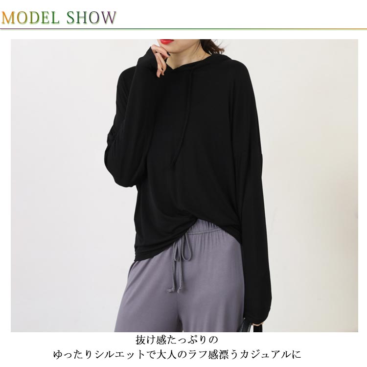 全9色!のフード付き長袖Tシャツ。 抜け感たっぷりのゆったりシルエットで大人のラフ感漂うカジュアルに 春夏らしいライトモーダル生地を使い、手軽い着ることができるライトな着心地が魅力。 柔らかくて着用時にごわつき感もないのが◎素肌に触れても快適な仕上がりに 絶妙な丈感でどんなボトムスとも好相性◎ 春から秋まで一枚あると大活躍する間違いなし。