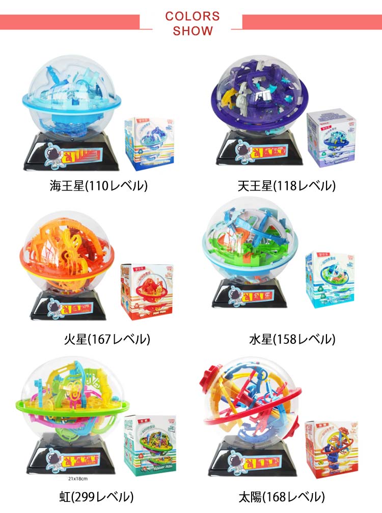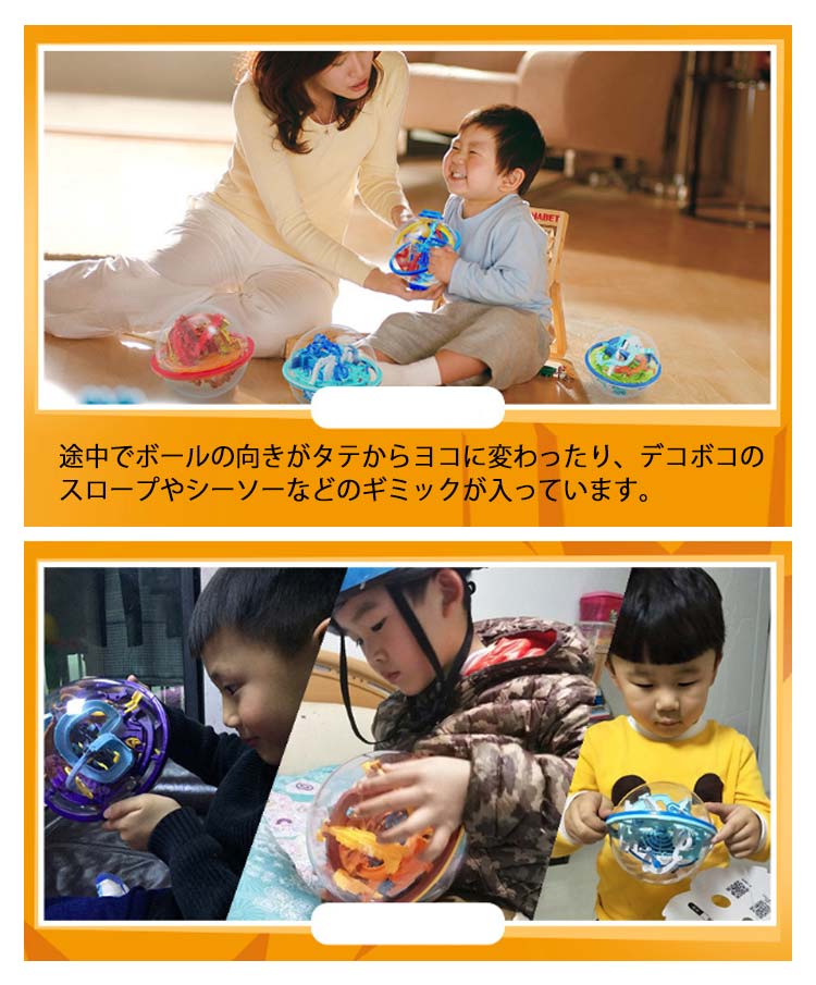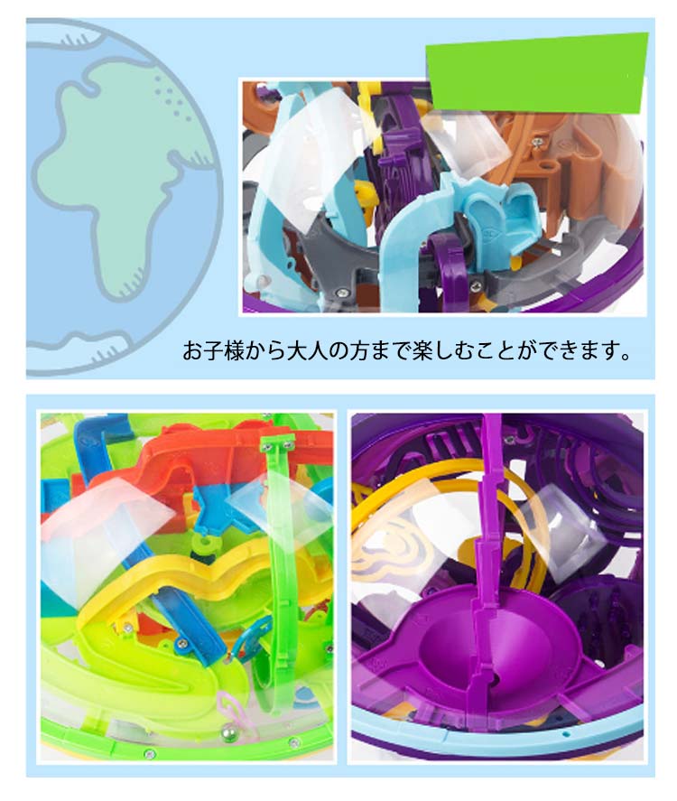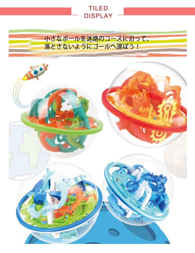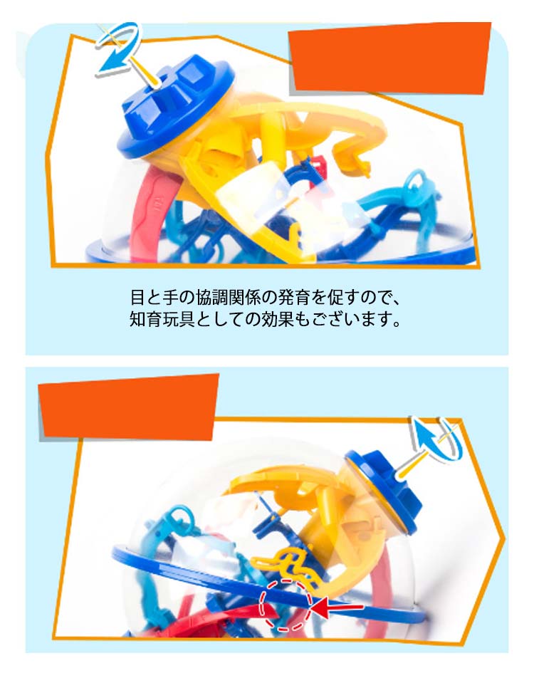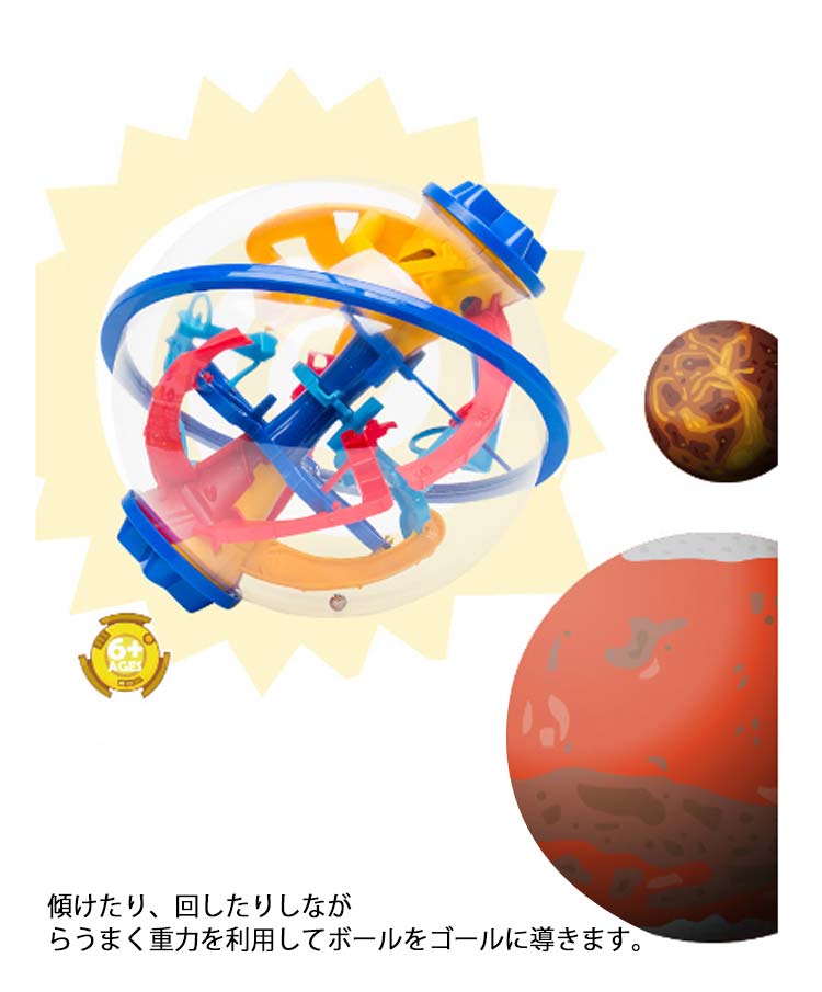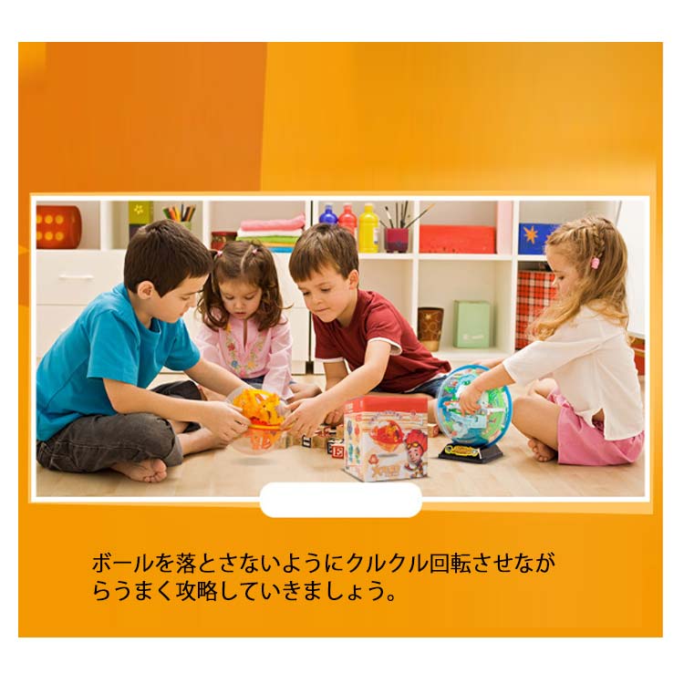 ・球体の形をした、3D迷路!・小さなボールを迷路のコースに沿って、落とさないようにゴールへ運ぼう!・途中でボールの向きがタテからヨコに変わったり、デコボコのスロープやシーソーなどのギミックが入っています。・ボールを落とさないようにクルクル回転させながらうまく攻略していきましょう。・傾けたり、回したりしながらうまく重力を利用してボールをゴールに導きます。・目と手の協調関係の発育を促すので、知育玩具としての効果もございます。・お子様から大人の方まで楽しむことができます。