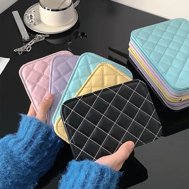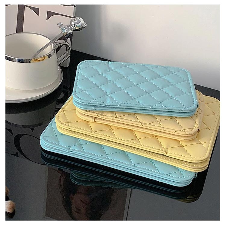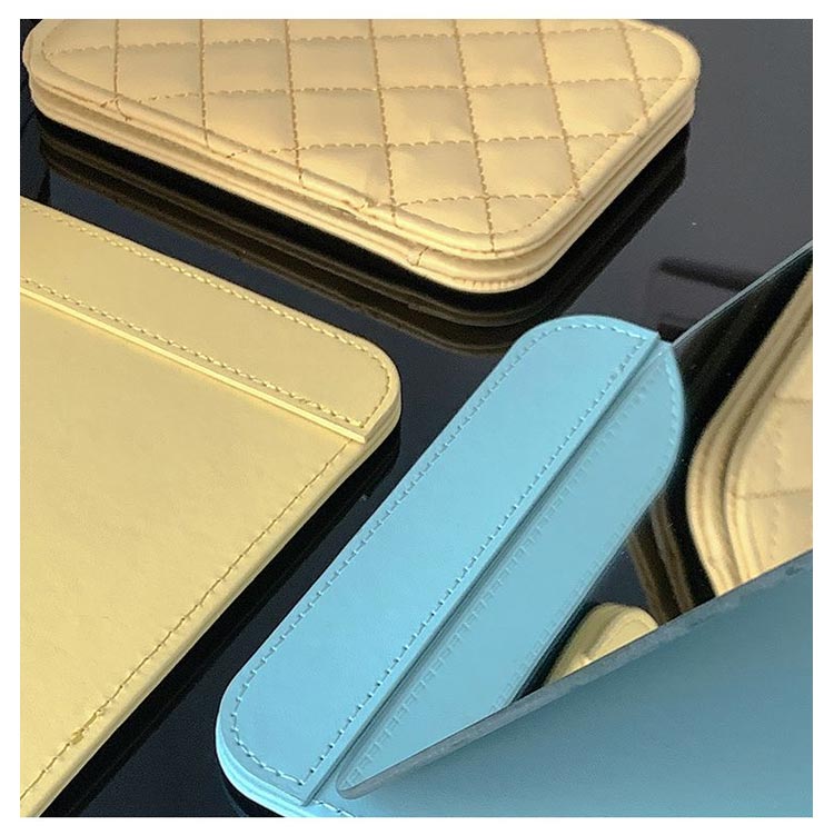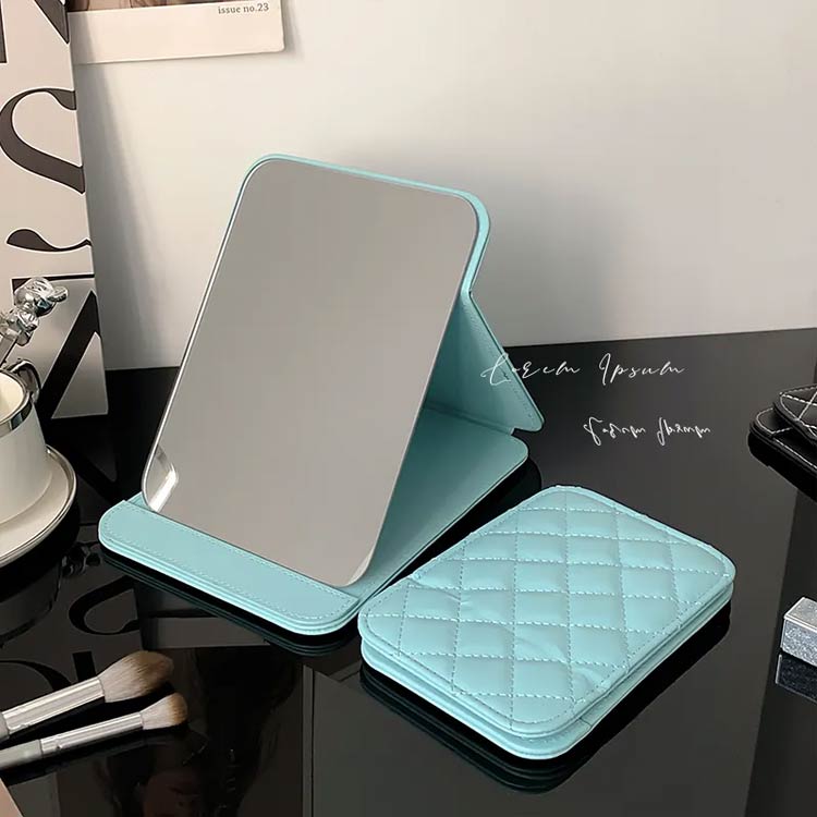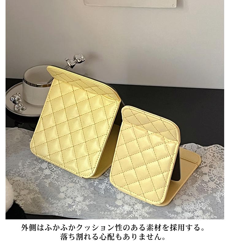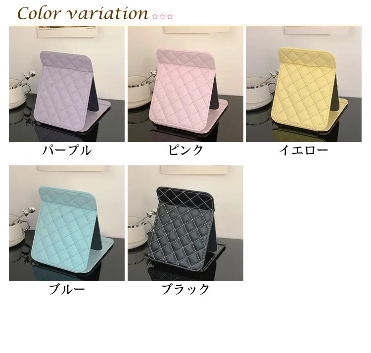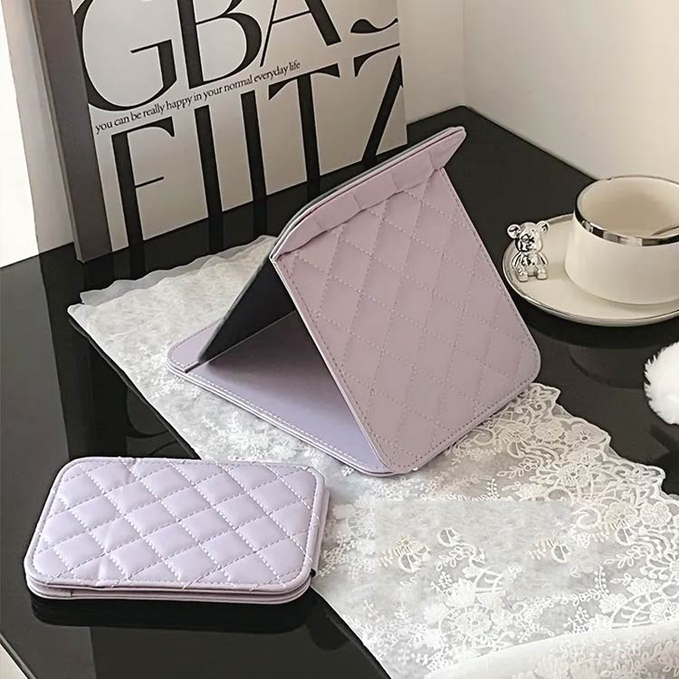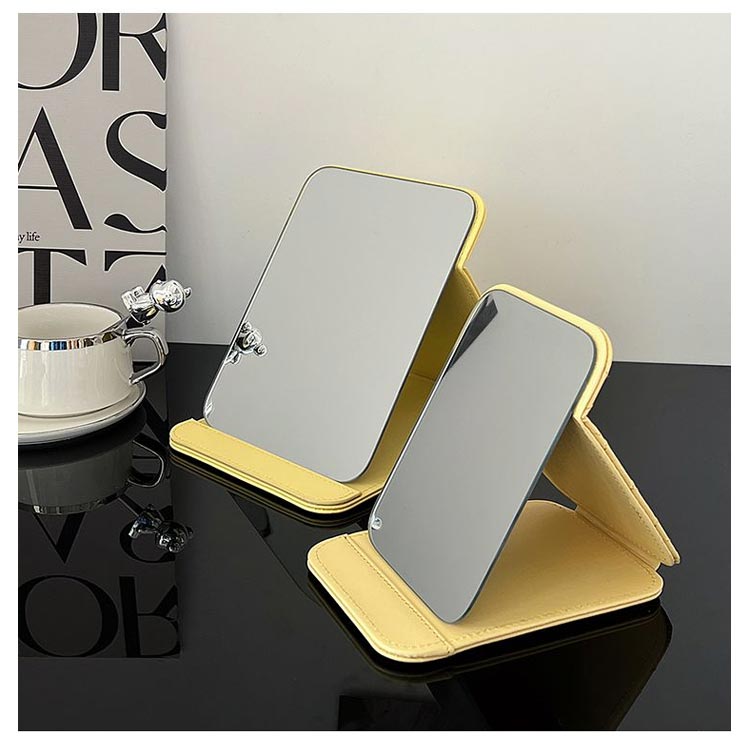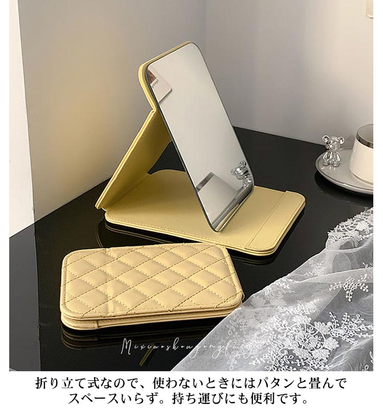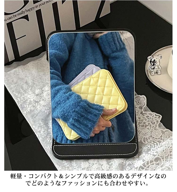 いつでもどこでもメイクタイムを快適に!卓上ミラーメイクのしやすい角度にしっかり固定できるので化粧がしやすいスマートなミラーです。折り立て式なので、使わないときにはパタンと畳んでスペースいらず。持ち運びにも便利です。外側はふかふかクッション性のある素材を採用する。落ち割れる心配もありません。軽量・コンパクト&シンプルで高級感のあるデザインなのでどのようなファッションにも合わせやすい。