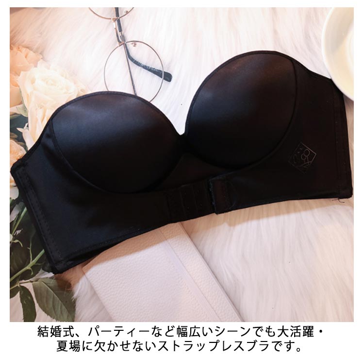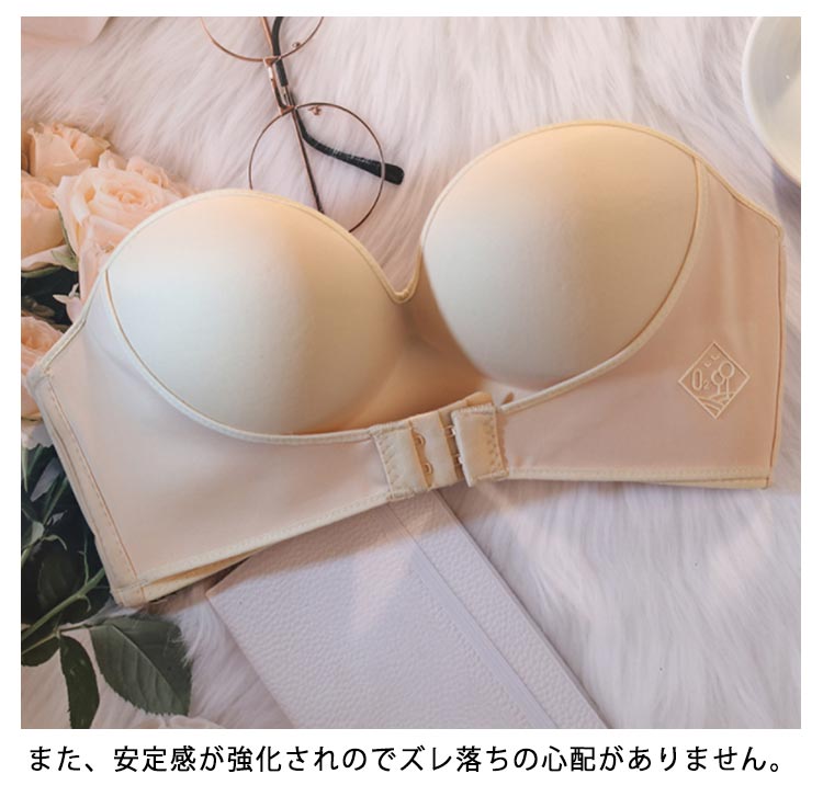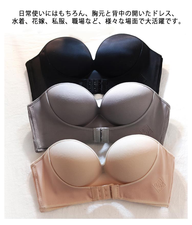 【滑り止め・安定感抜群!】滑り止めがあり、幅も広めなのでしっかりしています。カップ内の盛りパットが十分。マッサージの顆粒付きため、つけ心地が良いです。また胴回りの部分裏についているラバー素材のような滑り止めの効果が絶大。フロントホックで上がパカパカせず、全ての胸を逃がさない紐なしブラです。谷間メイクの同時に安定感もプラス!【楽なつけ心地・シームレスブラ】蜂巣状の通気孔(穴)があり、高い放熱性と速乾性を備え、細菌の繁殖を抑える、汗やニオイを抑える。長時間の使用しても使用中が不快感がありません。【どんな時でもチック】日常使いにはもちろん、胸元と背中の開いたドレス、水着、花嫁、私服、職場など、様々な場面で大活躍です。結婚式、パーティーなど幅広いシーンでも大活躍・夏場に欠かせないストラップレスブラです。また、安定感が強化されのでズレ落ちの心配がありません。