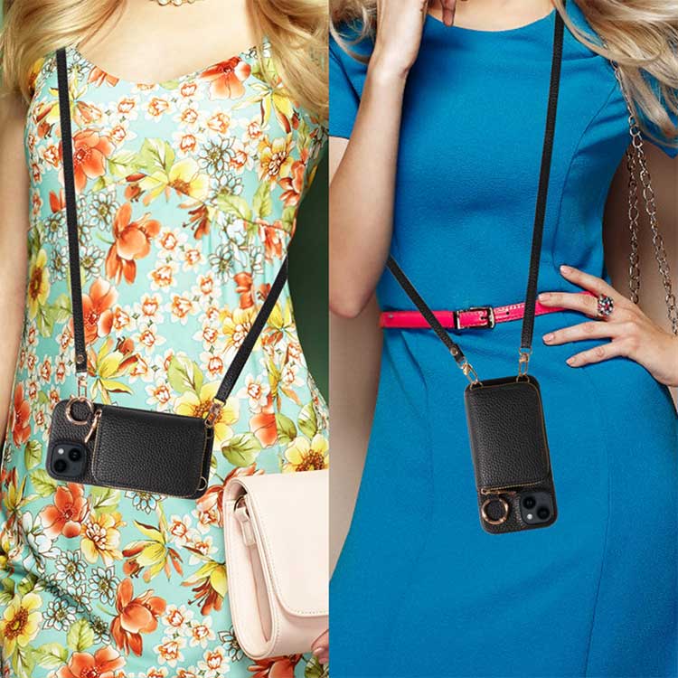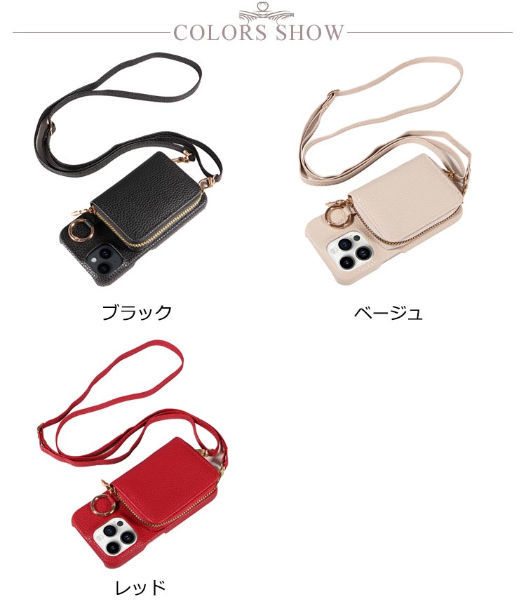 | じゃばら式カード収納付きスマホケース 肩掛けや斜めがけ、首がけができる長さ調整できるストラップ付き 背面にはカードポケット付きで、スタンド機能としても使える | |