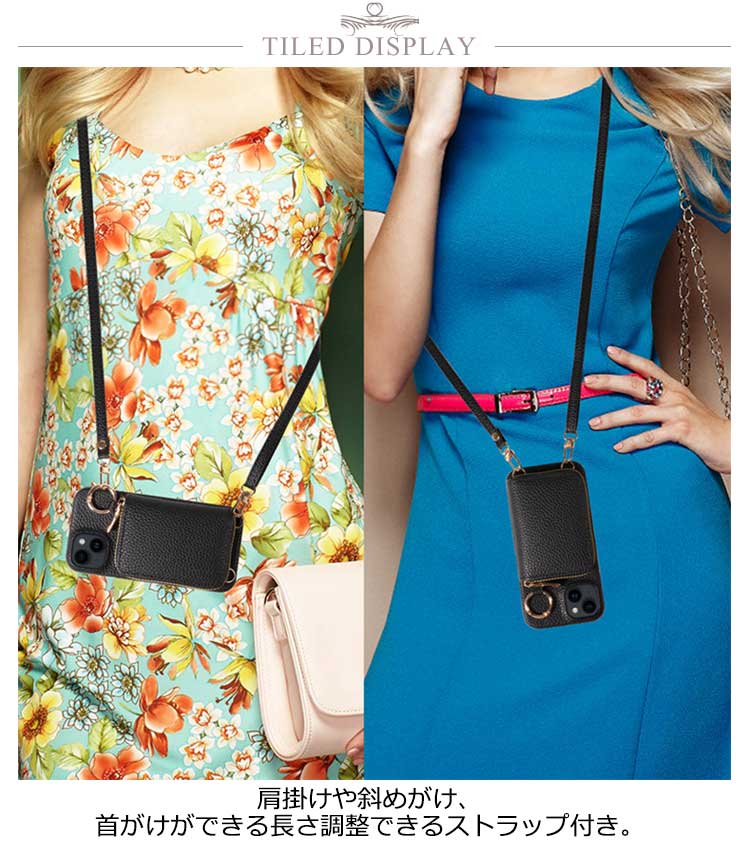 じゃばら式カード収納付きスマホケース肩掛けや斜めがけ、首がけができる長さ調整できるストラップ付き背面にはカードポケット付きで、スタンド機能としても使える