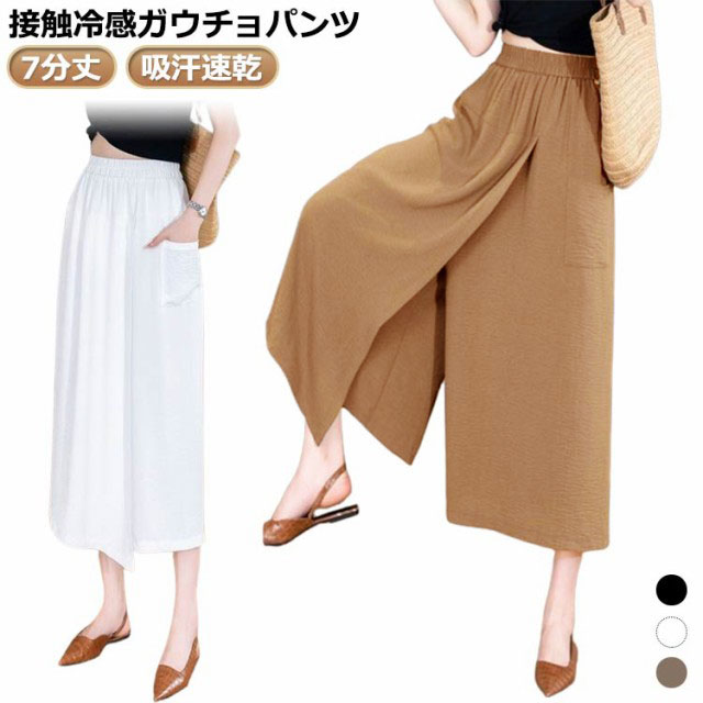 7分丈 ガウチョパンツ レディース 冷感 アイスシルクパンツ 2in1 スカートパンツ キュロット 接触冷感 ワイドパンツ ひんやり 吸汗速乾 ハイウエスト 夏 大きいサイズ 無地 薄手 通気 柔らかい 快適 軽くて涼しい 美脚 大きいサイズ カジュアル スカーチョ 送料無料