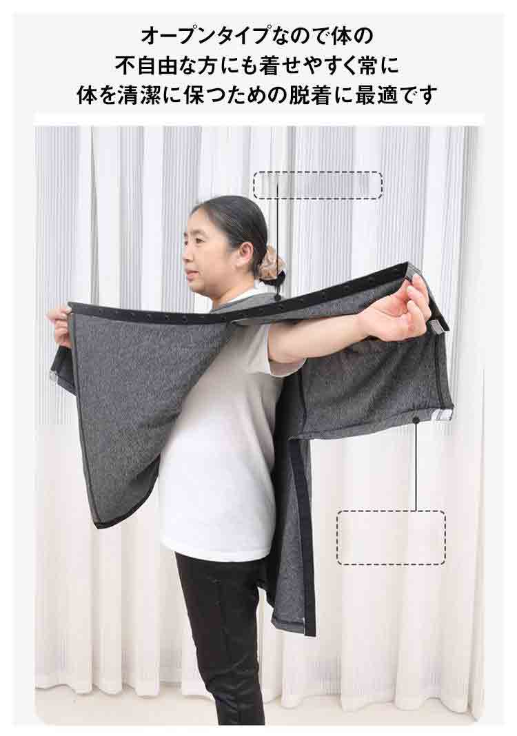 | フルオープンタイプの介護用tシャツ! 袖?肩?脇の下にスナップボタンが付いているので着脱が簡単です。 オープンタイプなので体の不自由な方にも着せやすく常に体を清潔に保つための脱着に最適です? フルオープンタイプなので点滴時や手術後の浮腫などの場合にもお着替えラクラク!! 通気性に優れ、汗の吸収もよく肌は常にサラサラに保てます。 普段の着用はもちろん、入院中の寝巻としてもおすすめ。 | |