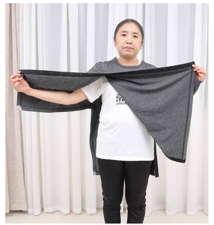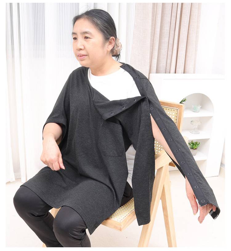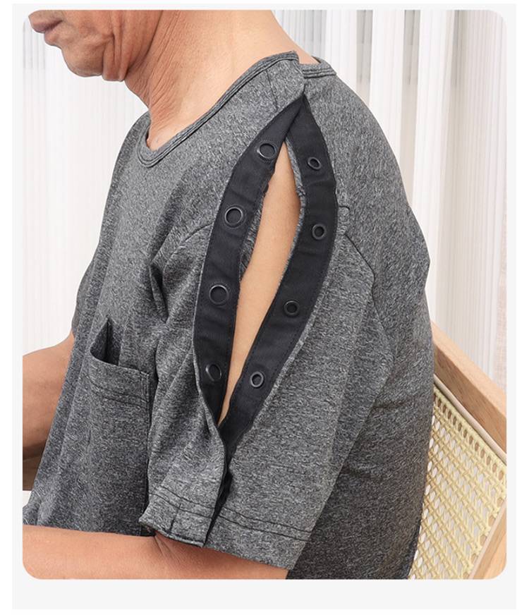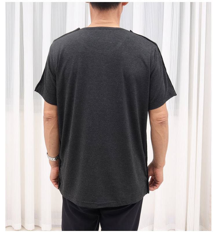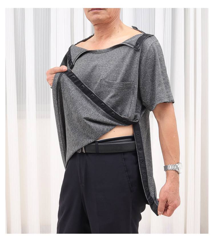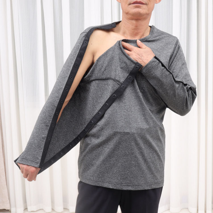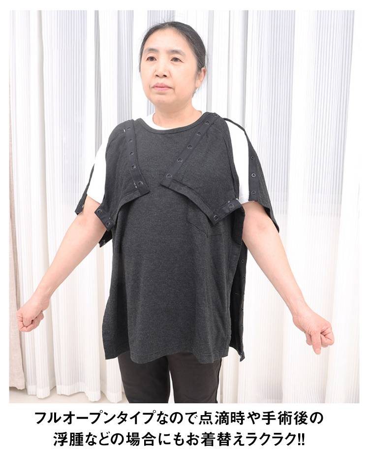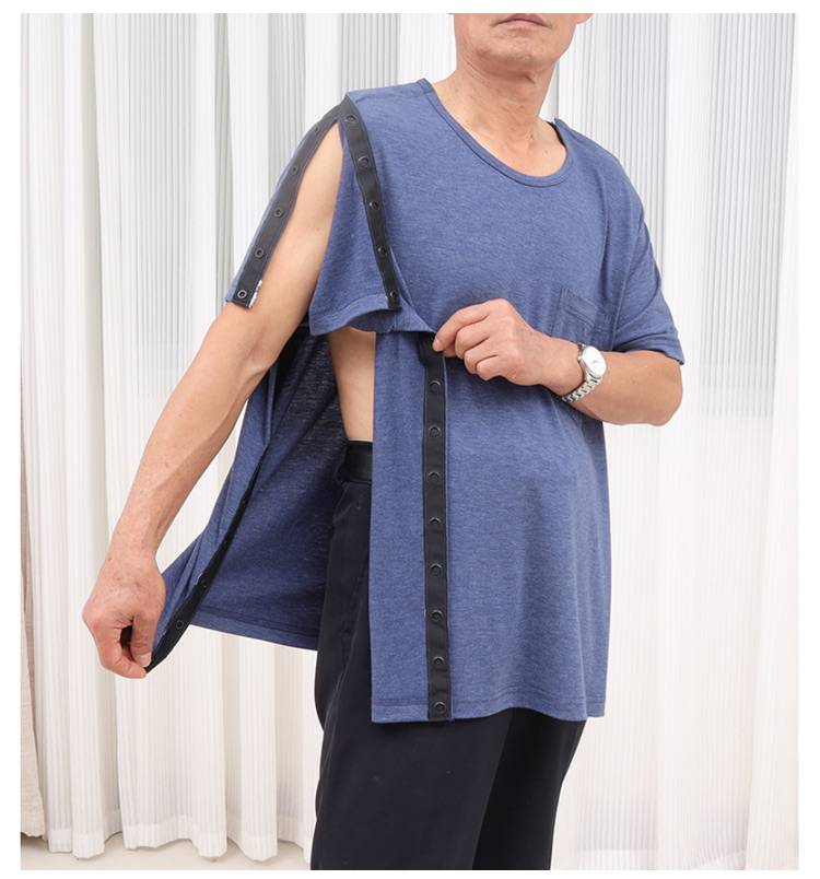 フルオープンタイプの介護用tシャツ!袖・肩・脇の下にスナップボタンが付いているので着脱が簡単です。オープンタイプなので体の不自由な方にも着せやすく常に体を清潔に保つための脱着に最適です♪フルオープンタイプなので点滴時や手術後の浮腫などの場合にもお着替えラクラク!!通気性に優れ、汗の吸収もよく肌は常にサラサラに保てます。普段の着用はもちろん、入院中の寝巻としてもおすすめ。