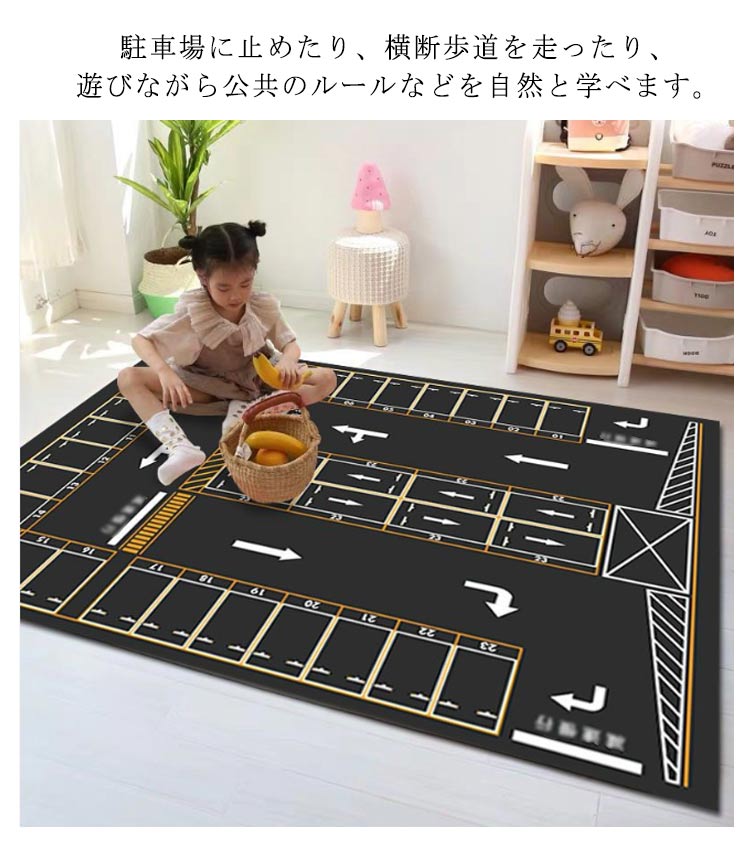 お部屋のインテリアを邪魔しない♪楽しく遊べるキッズプレイシートです。駐車場に止めたり、横断歩道を走ったり、遊びながら公共のルールなどを自然と学べます。かわいいイラストが書かれているのでごっこ遊びにも最適!お子様の想像力を豊かにしてくれます。モノトーンのおしゃれなデザインでキッズルームもおしゃれに変身!もちろんリビングでもインテリアを邪魔せずおしゃれにお子様と遊べますよ♪ポリエステル素材で汚してもさっと拭いてOK!いつでも清潔に使えます。薄手素材なのでさっと広げられて、畳んで簡単に収納可能。カラフルなデザインが魅力的!親子で一緒に様々な遊び方ができるおもちゃです。
