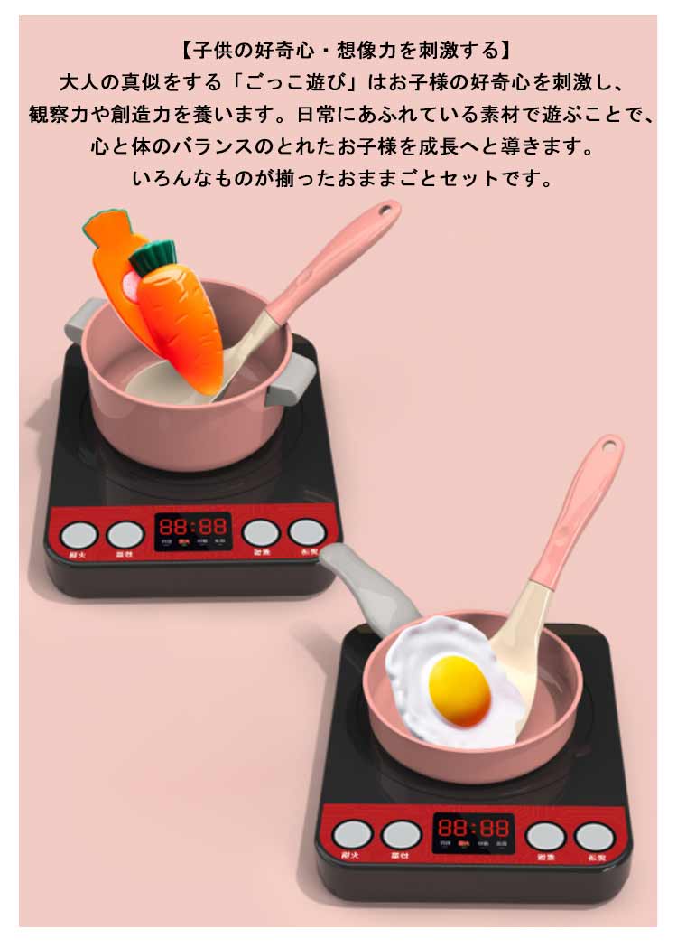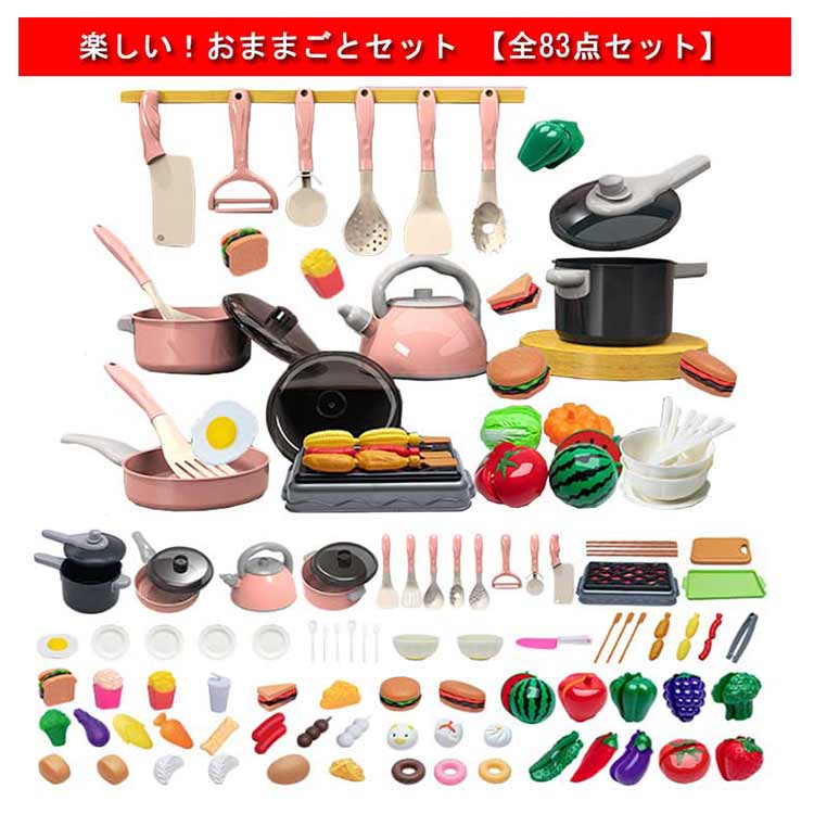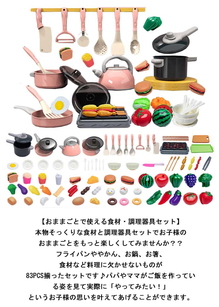 楽しい!おままごとセット 【全83点セット】【おままごとで使える食材・調理器具セット】本物そっくりな食材と調理器具セットでお子様のおままごとをもっと楽しくしてみませんか??フライパンややかん、お鍋、お箸、食材など料理に欠かせないものが71PCS揃ったセットです♪パパやママがご飯を作っている姿を見て実際に「やってみたい!」というお子様の思いを叶えてあげることができます。【子供の好奇心・想像力を刺激する】大人の真似をする「ごっこ遊び」はお子様の好奇心を刺激し、観察力や創造力を養います。日常にあふれている素材で遊ぶことで、心と体のバランスのとれたお子様を成長へと導きます。いろんなものが揃ったおままごとセットです。【プレゼントとしていかがですか?】お誕生日、初節句、クリスマス、入園のお祝いなどご両親からお子様へのプレゼントとしていかがでしょうか?ご友人やお知り合いなど大切な方へのお祝い事のプレゼントとしても大変喜ばれますよ♪