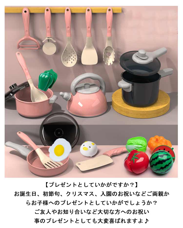 | 楽しい!おままごとセット 【全83点セット】 【おままごとで使える食材?調理器具セット】 本物そっくりな食材と調理器具セットでお子様のおままごとをもっと楽しくしてみませんか??フライパンややかん、お鍋、お箸、食材など料理に欠かせないものが71PCS揃ったセットです?パパやママがご飯を作っている姿を見て実際に「やってみたい!」というお子様の思いを叶えてあげることができます。 【子供の好奇心?想像力を刺激する】 大人の真似をする「ごっこ遊び」はお子様の好奇心を刺激し、観察力や創造力を養います。日常にあふれている素材で遊ぶことで、心と体のバランスのとれたお子様を成長へと導きます。いろんなものが揃ったおままごとセットです。 【プレゼントとしていかがですか?】 お誕生日、初節句、クリスマス、入園のお祝いなどご両親からお子様へのプレゼントとしていかがでしょうか?ご友人やお知り合いなど大切な方へのお祝い事のプレゼントとしても大変喜ばれますよ? | |